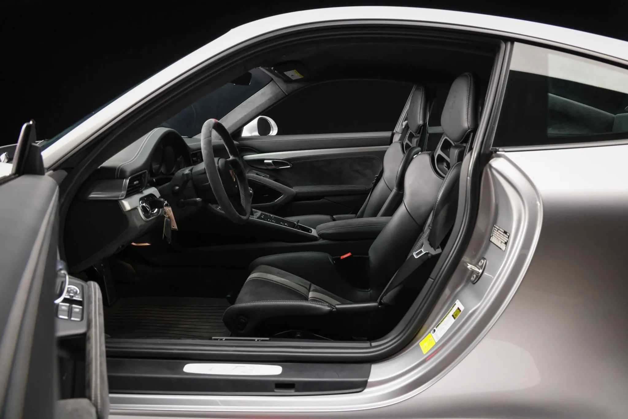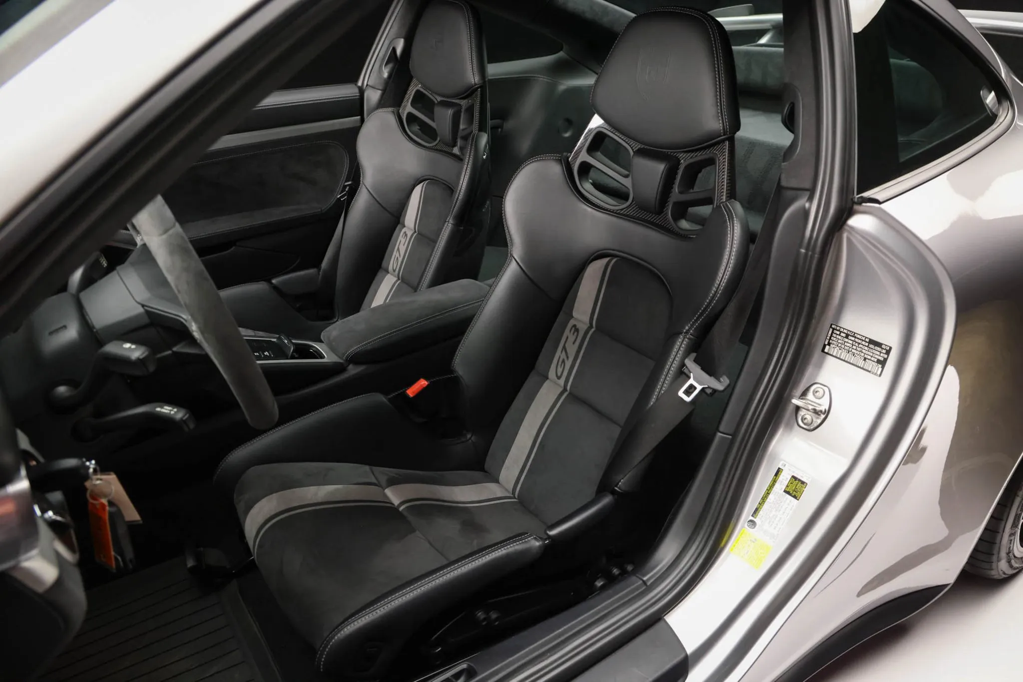 The carbon-fiber full bucket seats are trimmed in black upholstery with gray accents, Porsche crests on the headrests, and contrasting stitching that extends to the dashboard, center console, and door panels. Porsche-branded floor mats line the footwells, and additional appointments include a fire extinguisher, a Bose sound system, automatic climate control, and cruise control.