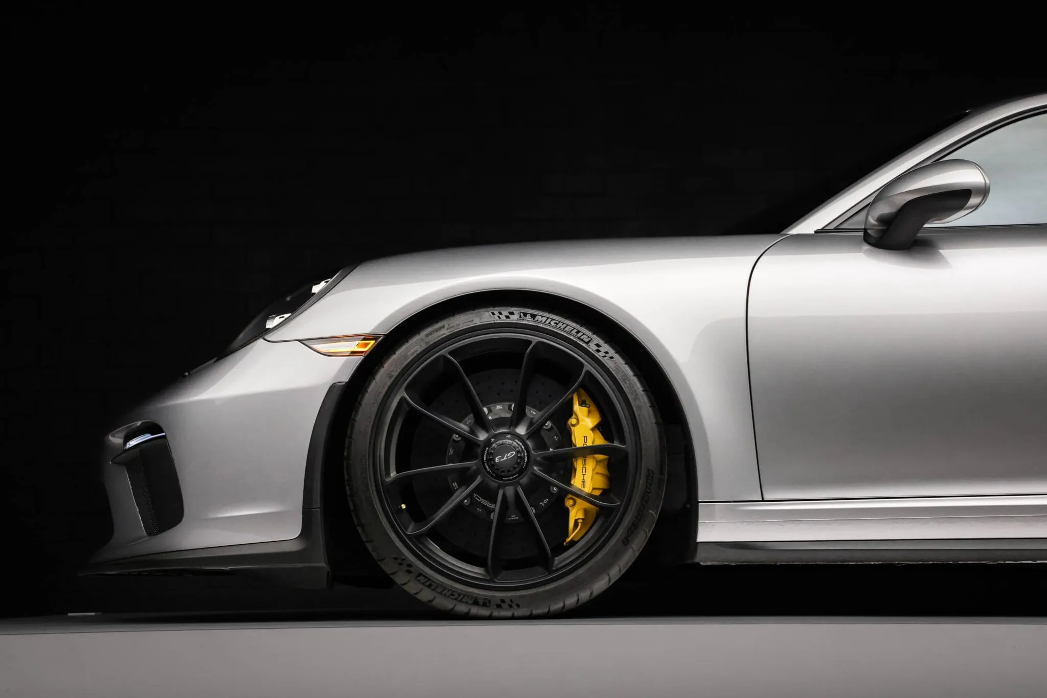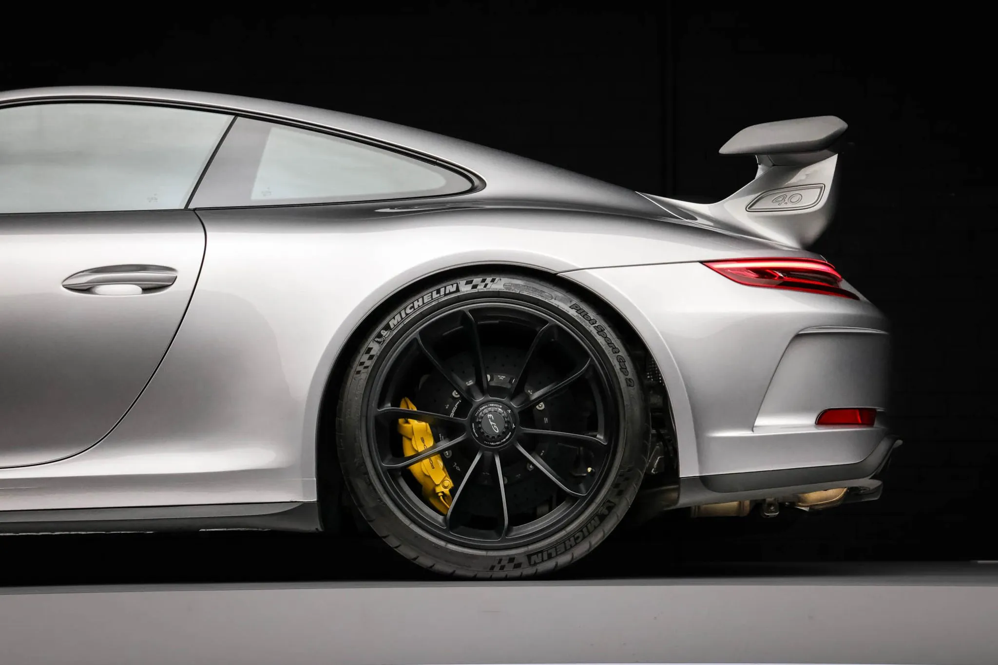 Black-finished 20″ center-lock alloy wheels are mounted with Michelin tires. Braking is handled by yellow Porsche-branded calipers over ceramic-composite rotors. A brake fluid flush was performed and two tires were replaced in December 2024, according to the Carfax report.