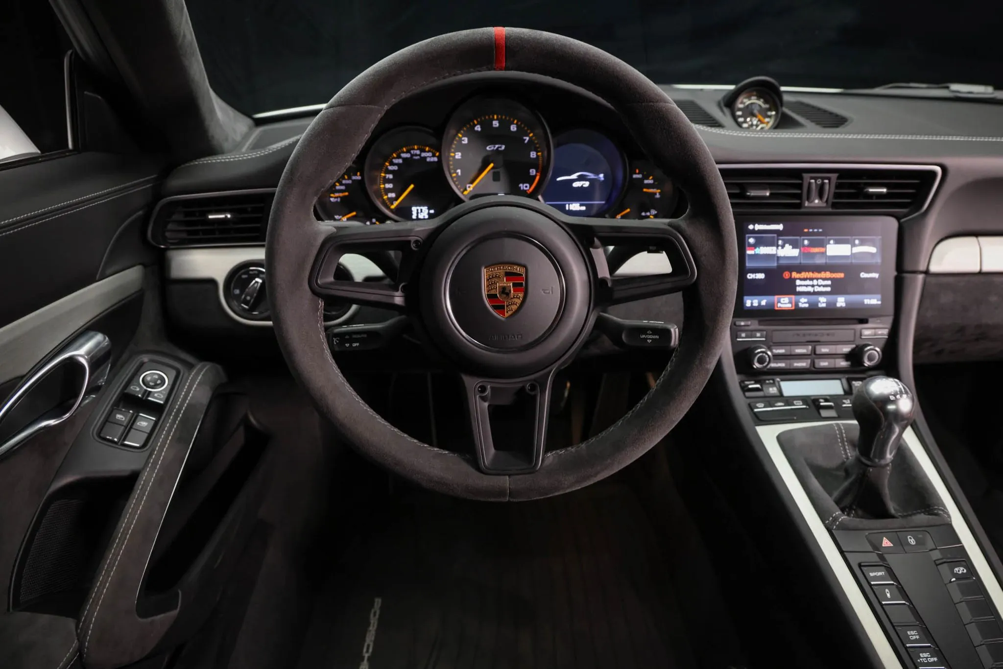 The three-spoke steering wheel frames a central GT3-branded tachometer as well as a 225-mph speedometer, an LCD screen, and gauges for oil pressure, oil temperature, coolant temperature, and fuel level. The optional Sport Chrono Package added a stopwatch atop the dashboard. The digital odometer on this 2018 Porsche 911 GT3 10k indicates miles.
