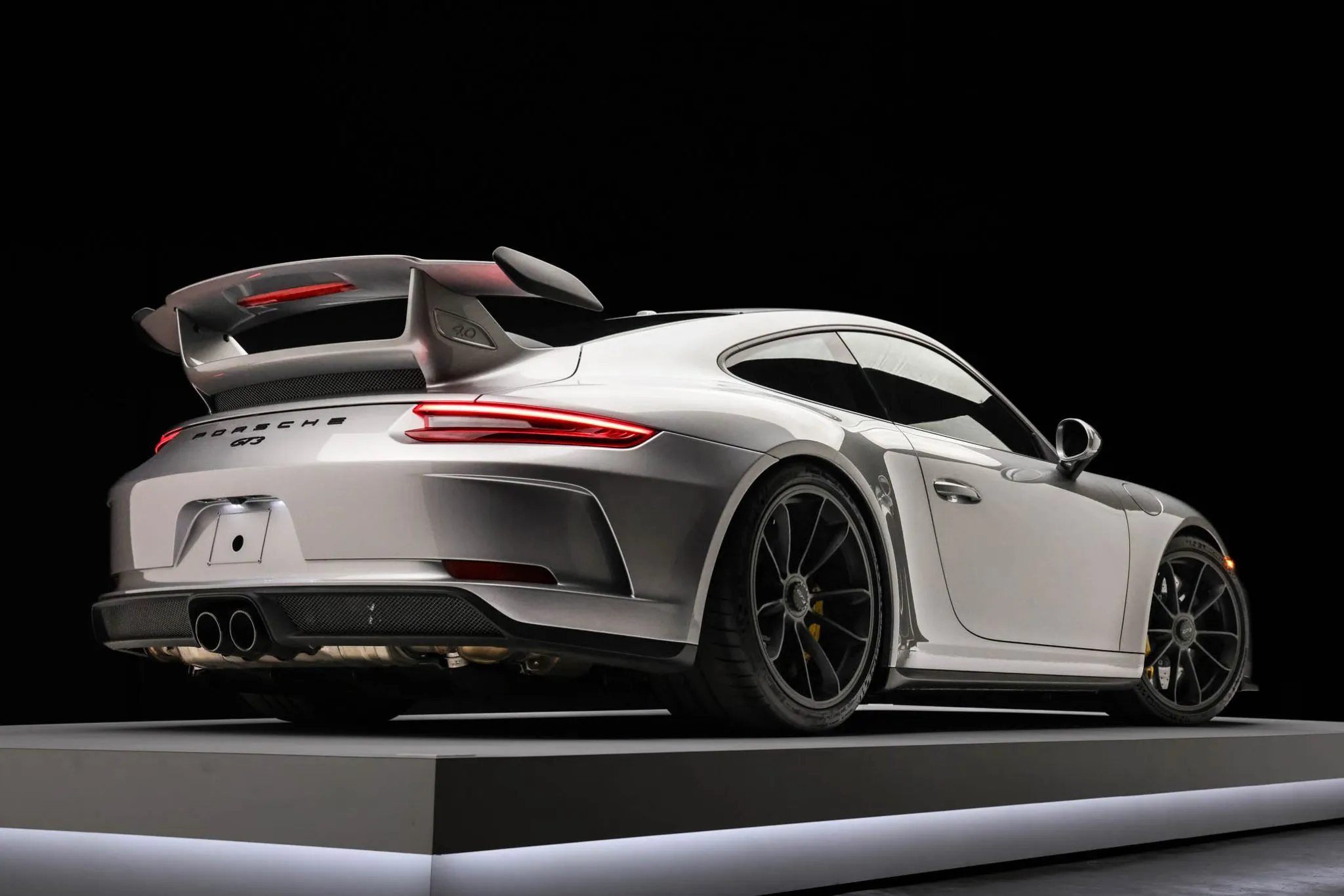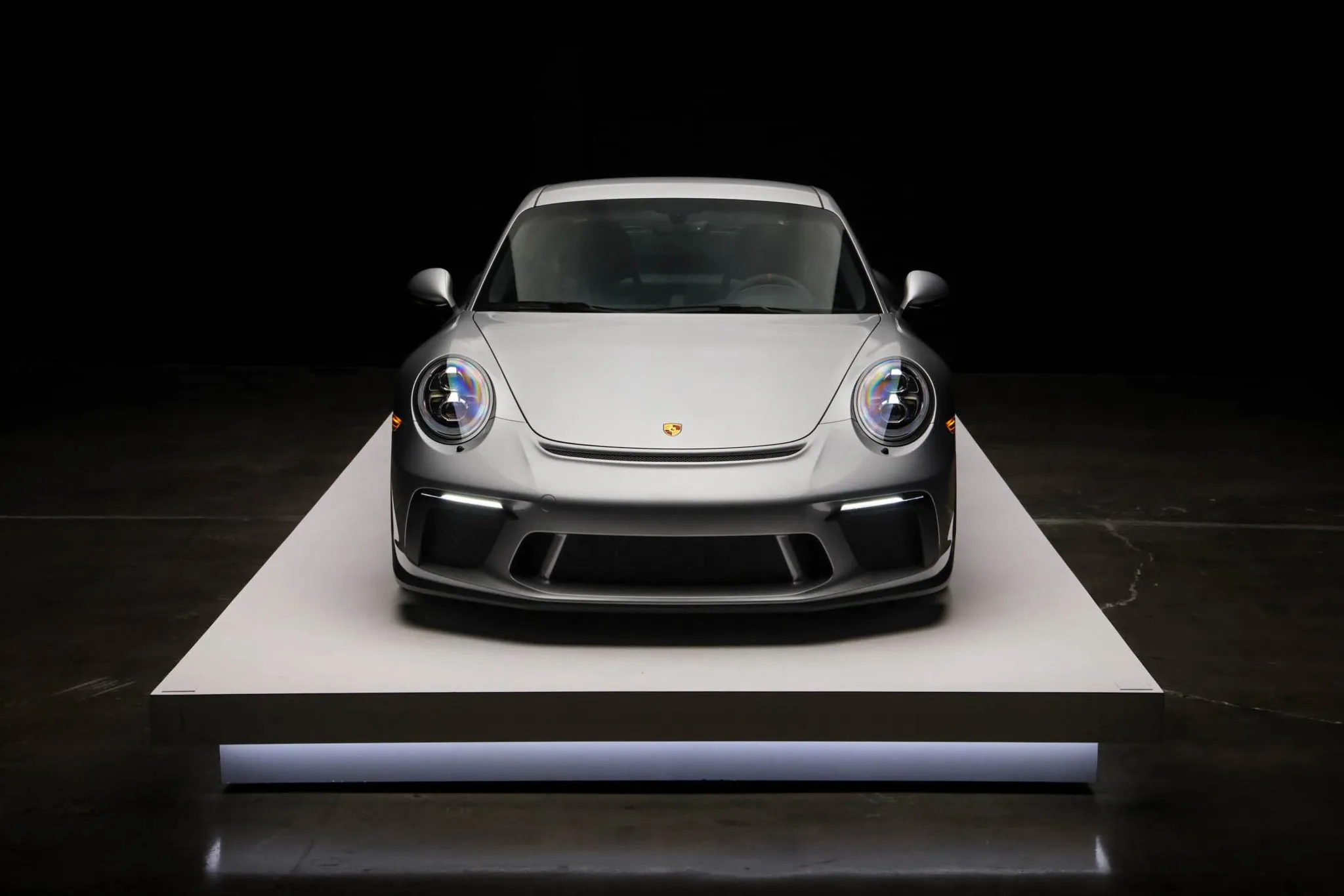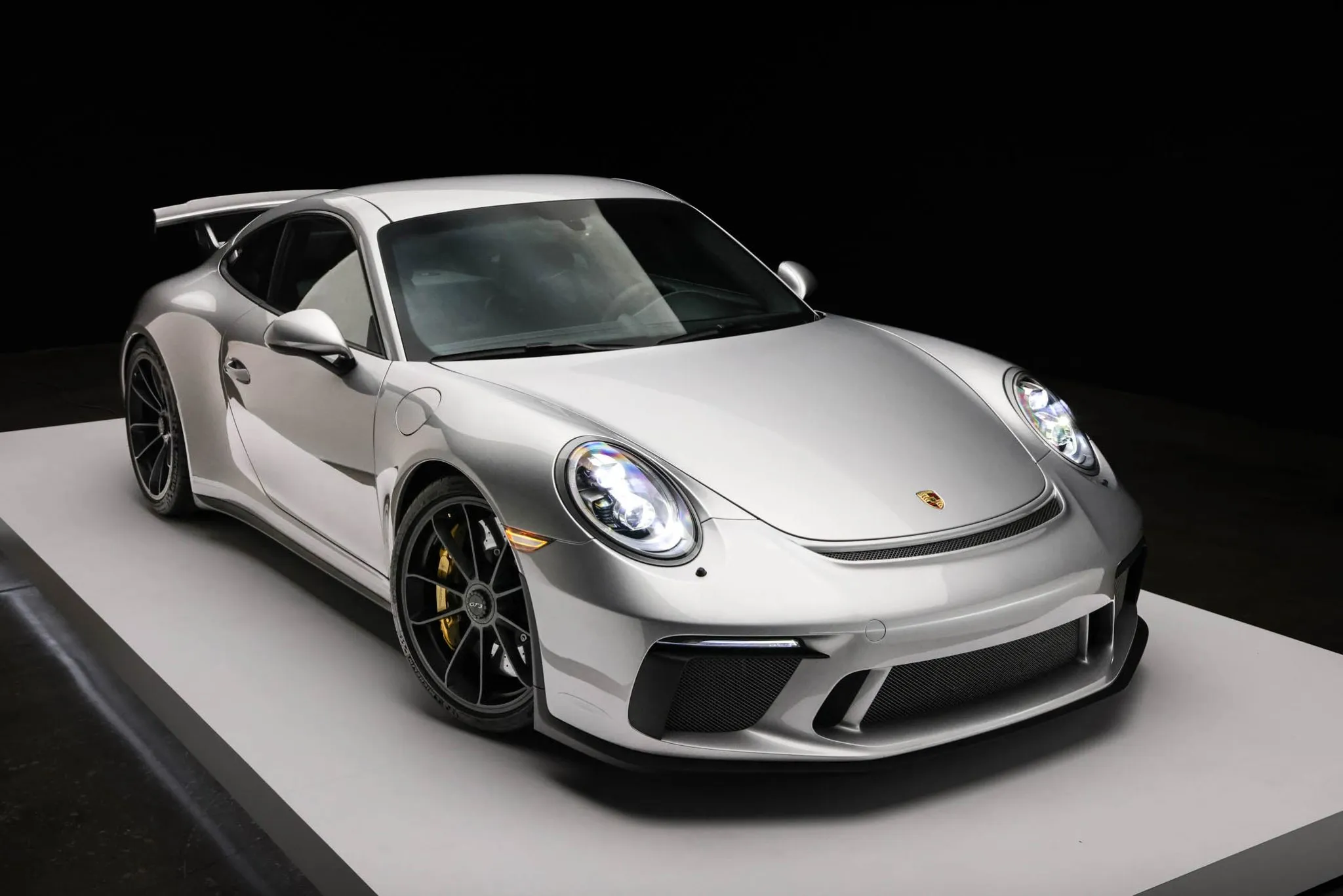The 991 GT3 featured revised front and rear bumper covers when compared to the standard Carrera as well as a rear wing and dual center-exit exhaust pipes. This example is finished in GT Silver Metallic and has LED headlights with Porsche Dynamic Lighting System (PDLS), LED taillights, and headlight washers.