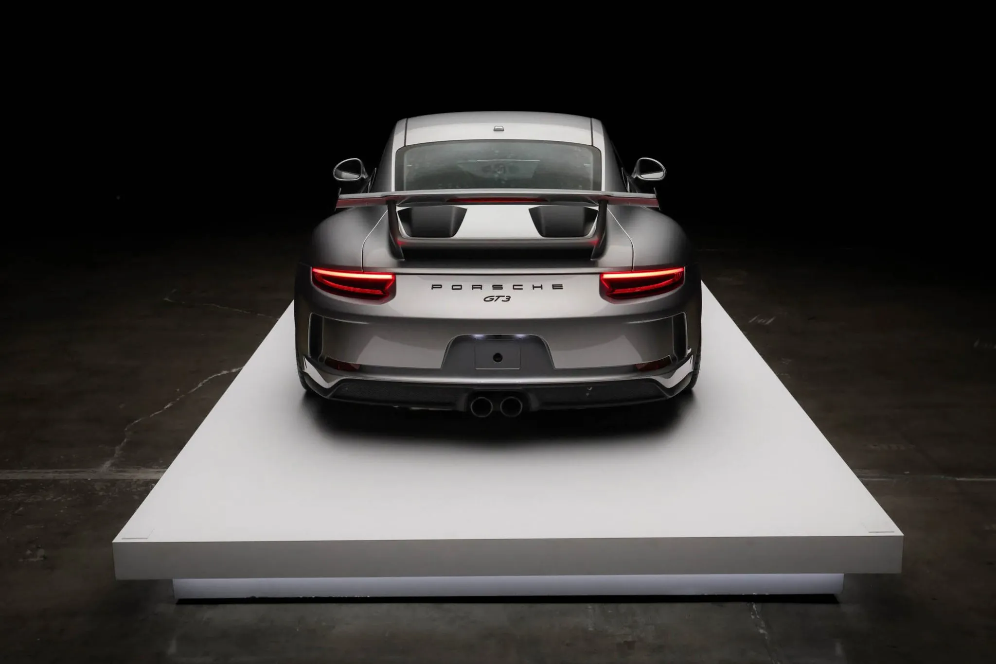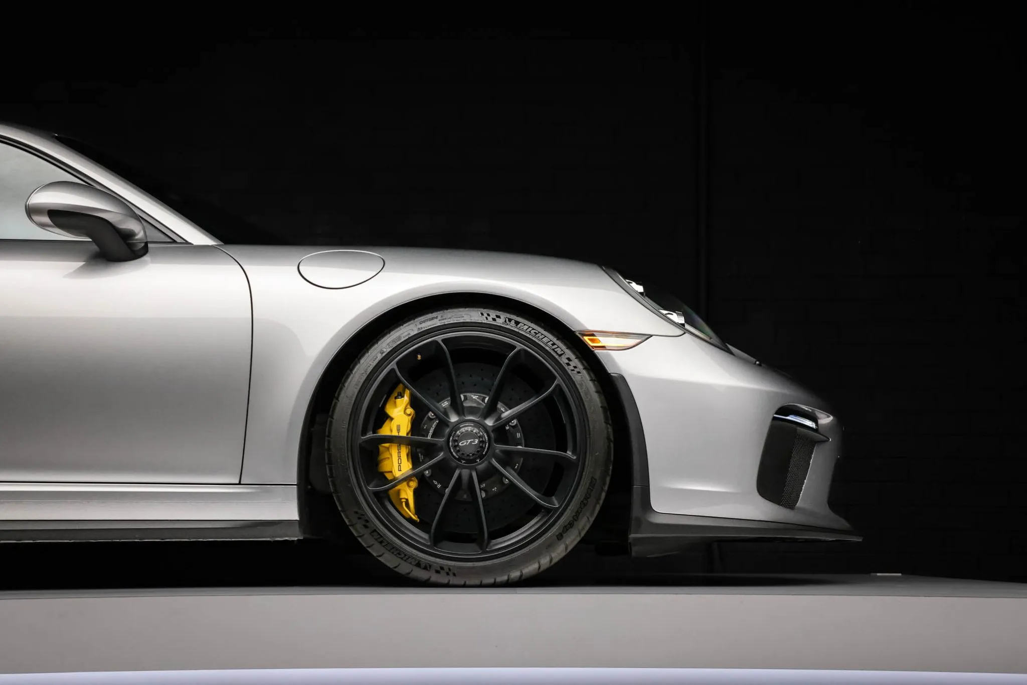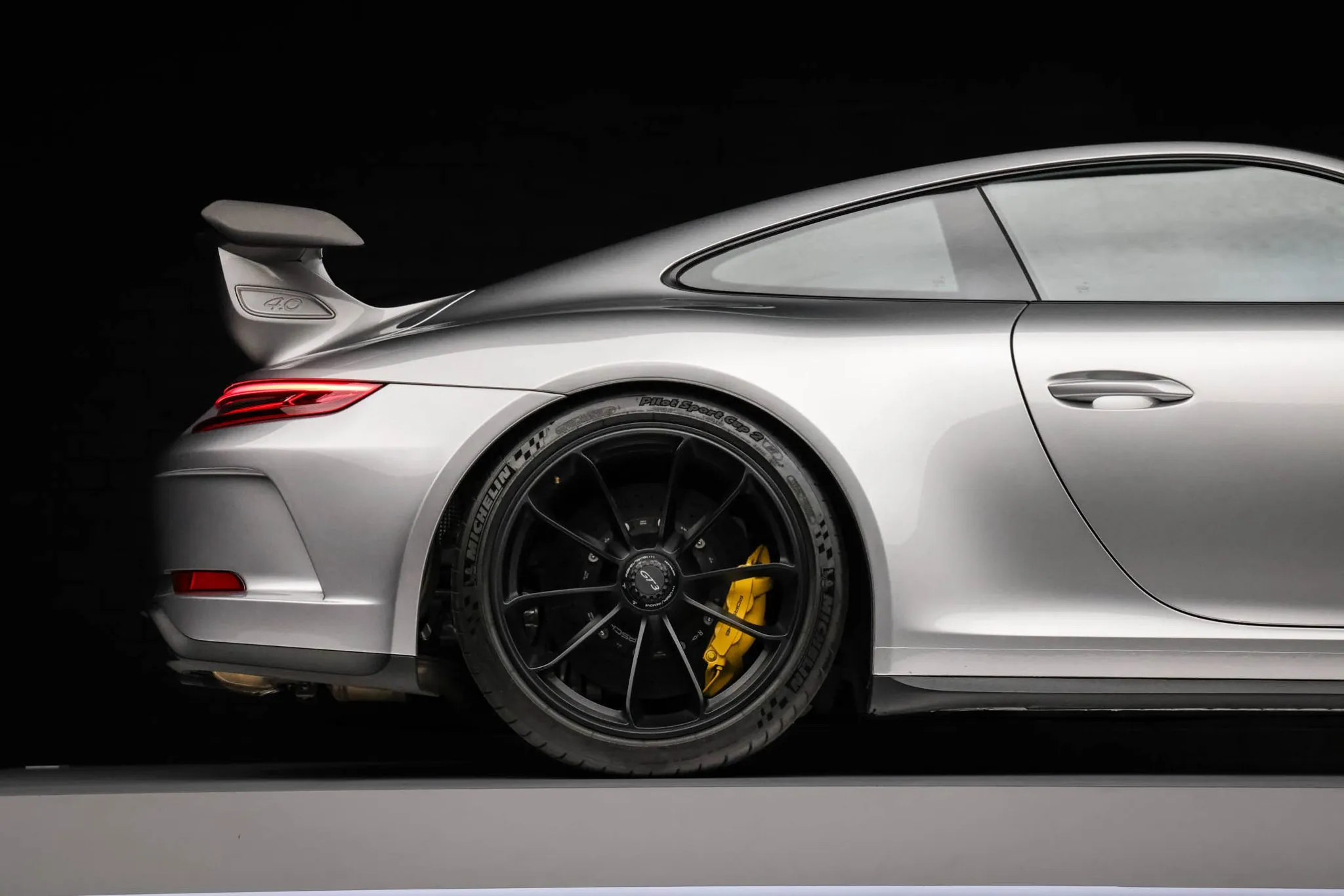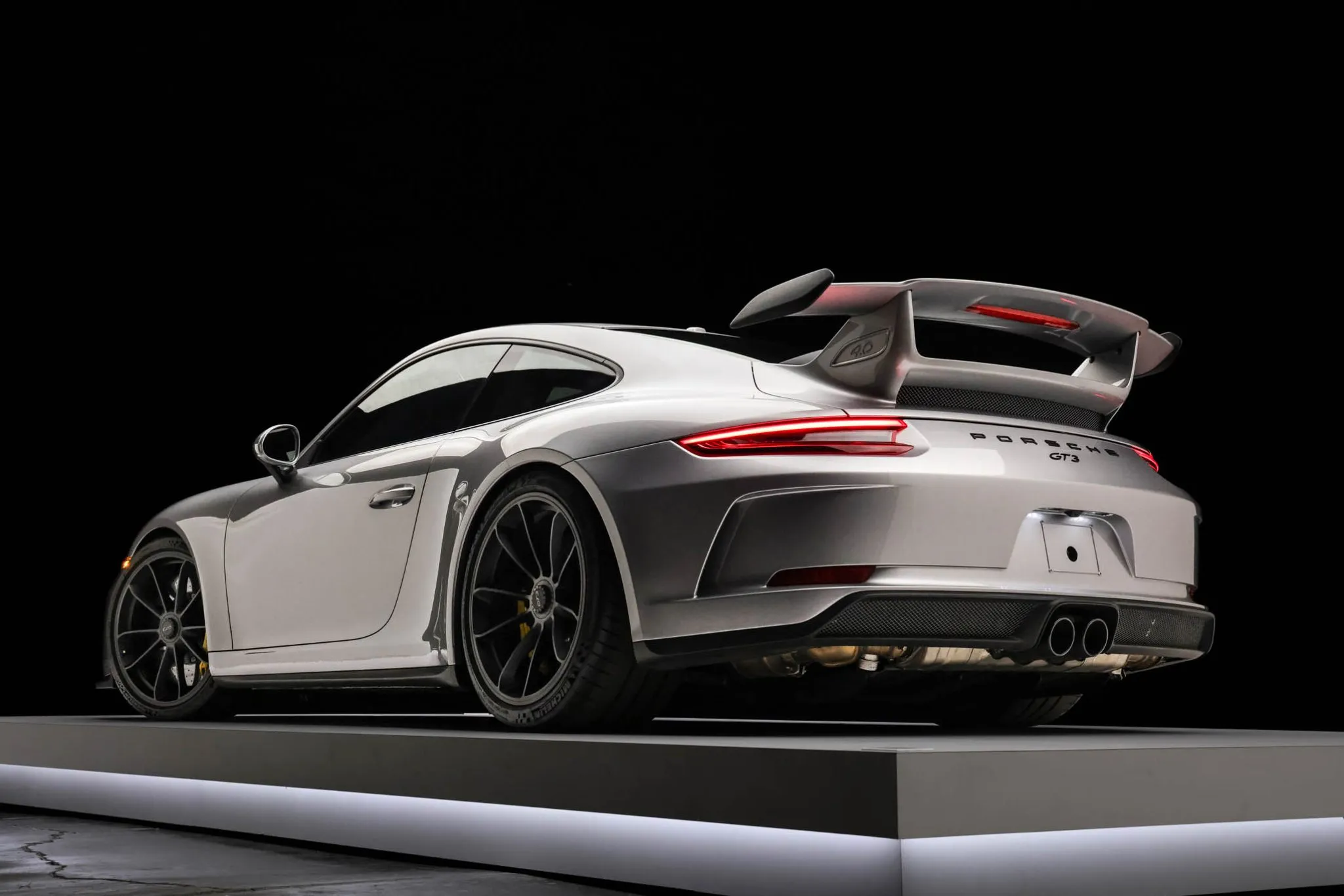 The 991 GT3 featured revised front and rear bumper covers when compared to the standard Carrera as well as a rear wing and dual center-exit exhaust pipes. This example is finished in GT Silver Metallic and has LED headlights with Porsche Dynamic Lighting System (PDLS), LED taillights, and headlight washers.