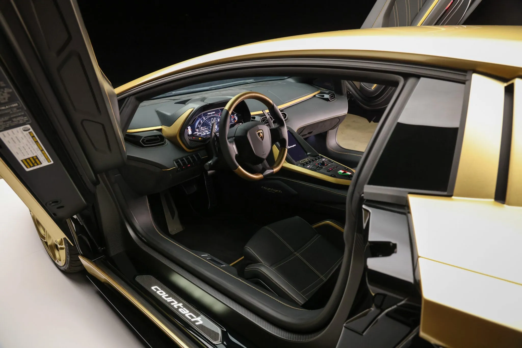 The cabin is trimmed in Nero Ade leather with Oro Eleos leather accents and stitching over the seats, console, and instrument surround. Ad Personam options include Oro Eleos embroidered Lamborghini headrest shields, Oro Eleos Countach script over Tricolore strips on each side of the console, painted Oro Eleos Lamborghini script over Tricolore bars on the carbon-fiber console, a Tricolore start-stop switch, and a gold “1 di 112” console badge. Additional features include Nero Ade carpeting and seatbelts, Alcantara dash trim, automatic air conditioning, and a touchscreen infotainment system.