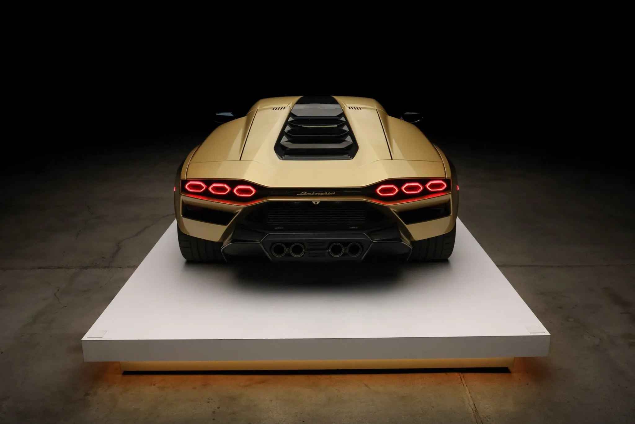 The surface underneath the hood features a Countach profile sketch that is said to have been drawn by Lamborghini head of design Mitja Borkert and is surrounded by signatures of the Countach executive team, design team, and production team.