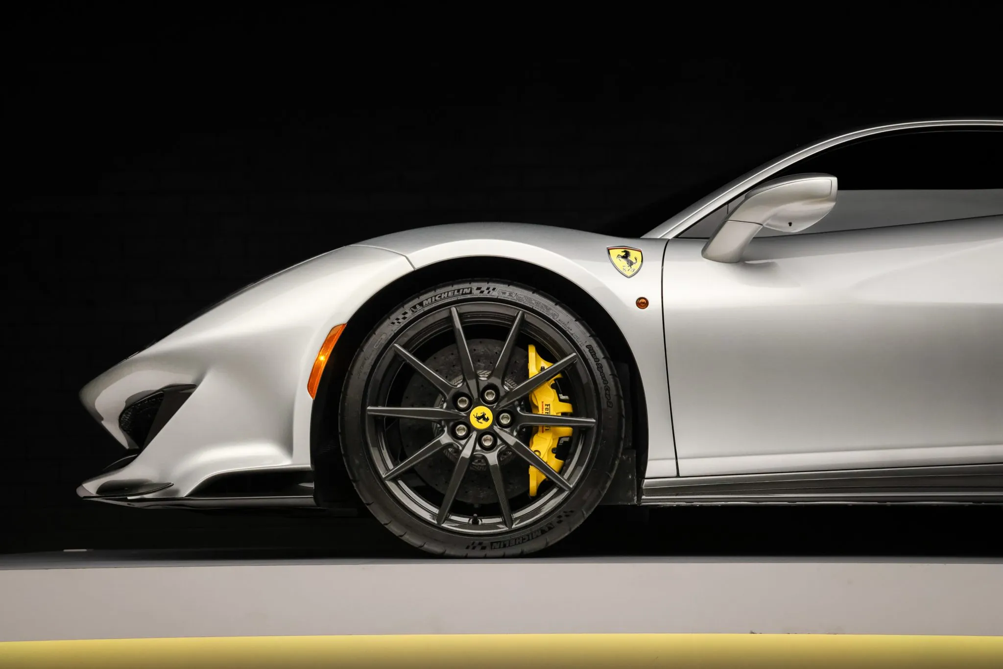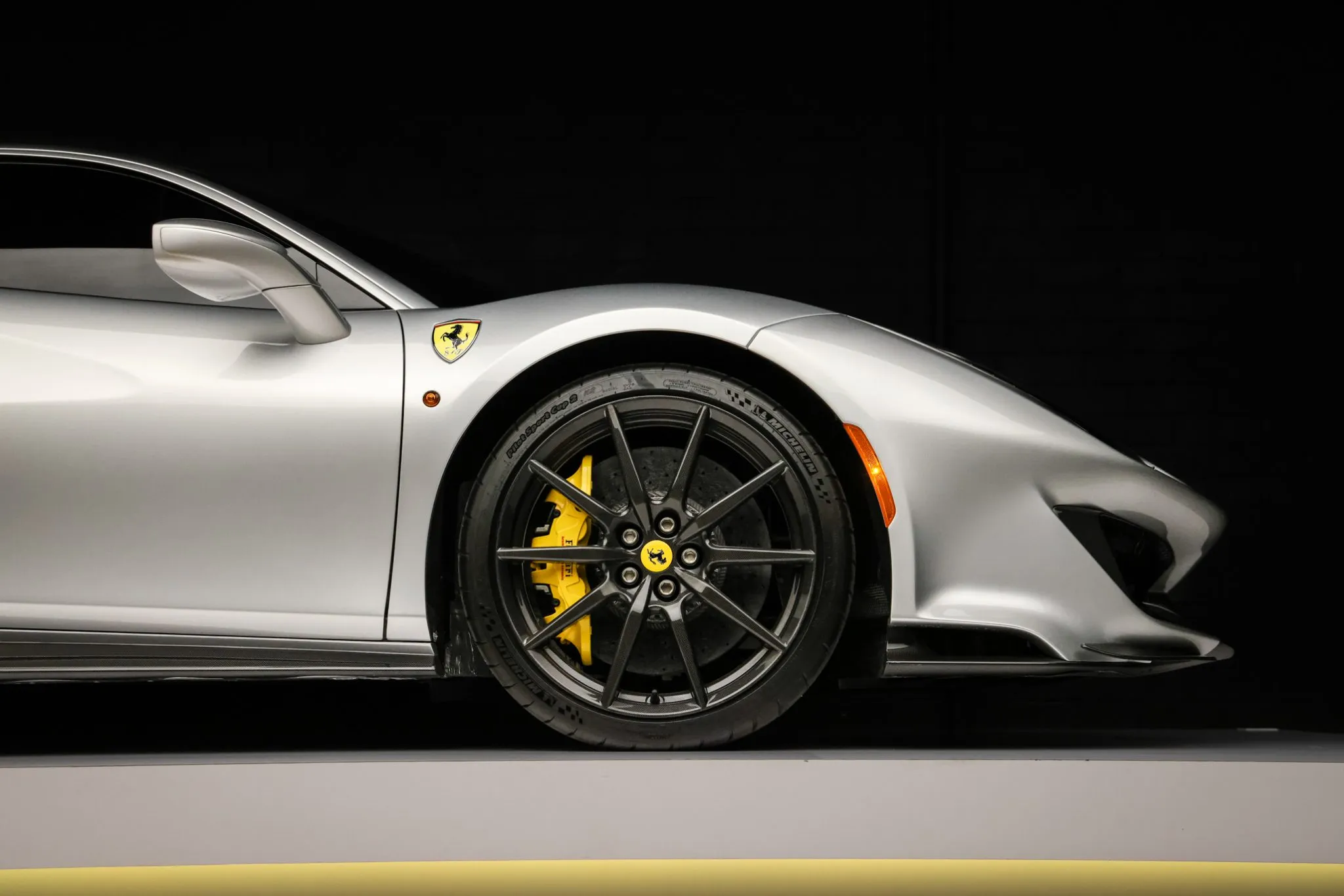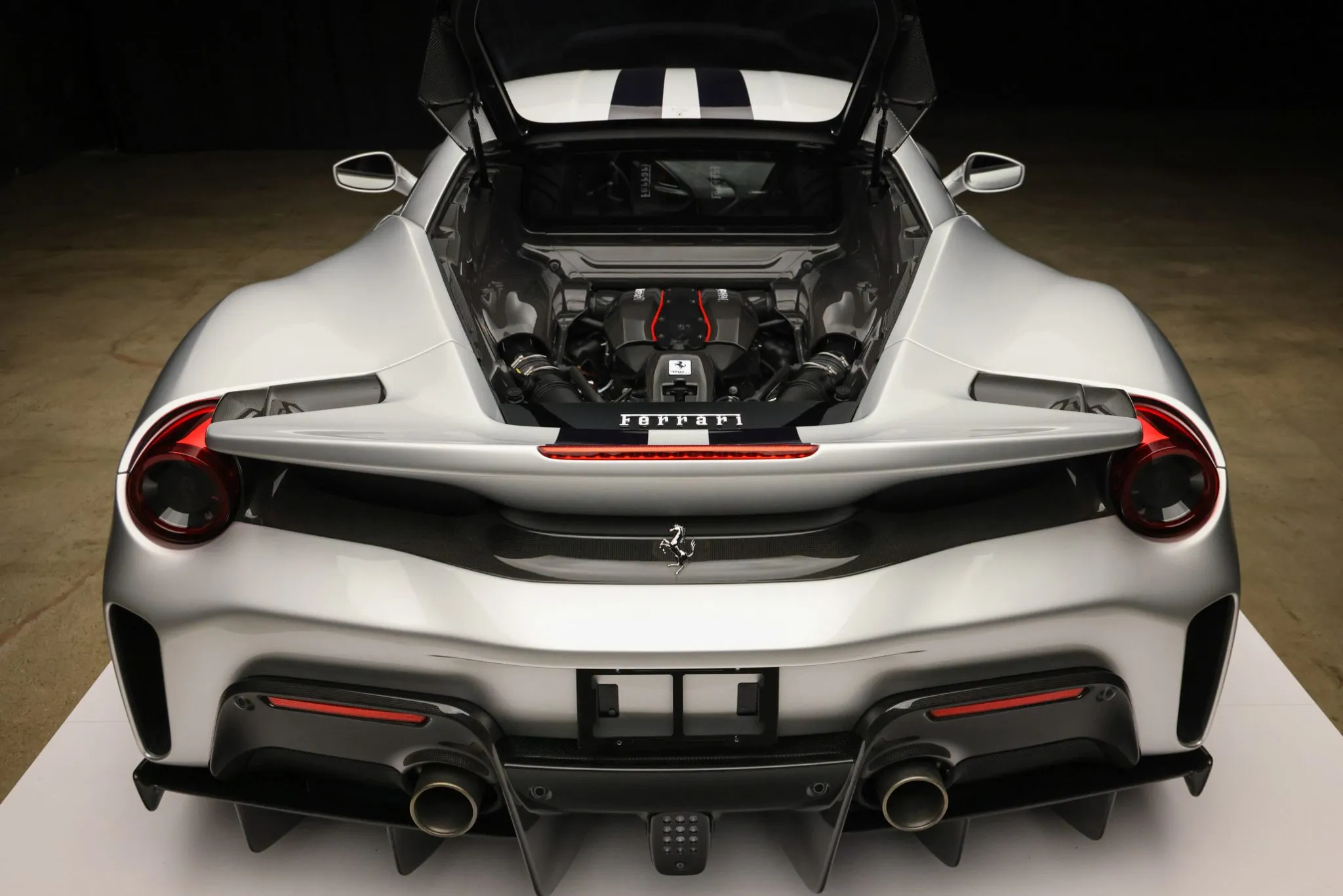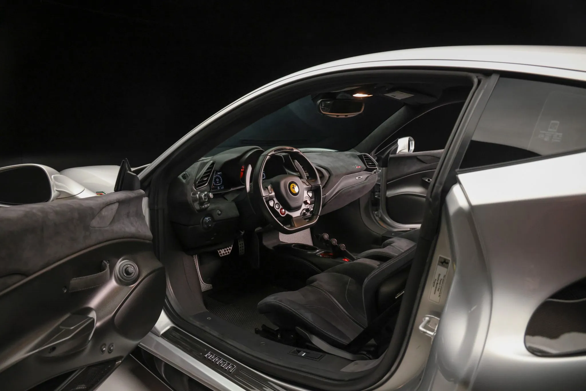 Compared with the standard 488, the Pista features revised bodywork including an underbody diffuser along with carbon-fiber construction of the rear spoiler, doors, and front and rear fascias that contributes to an approximately 200-pound reduction in curb weight. This example is finished in Argento Nurburgring with Blu America stripes and has adaptive headlights, rear parking sensors, a backup camera, a vented deck lid, Scuderia Ferrari fender shields, and a carbon-fiber rear diffuser, rear grille, front flaps, side air splitters, and front air vents. Protective film has been applied to the body, and imperfections on the film are highlighted in the gallery. The windshield was repaired in December 2025, according to the Carfax report.