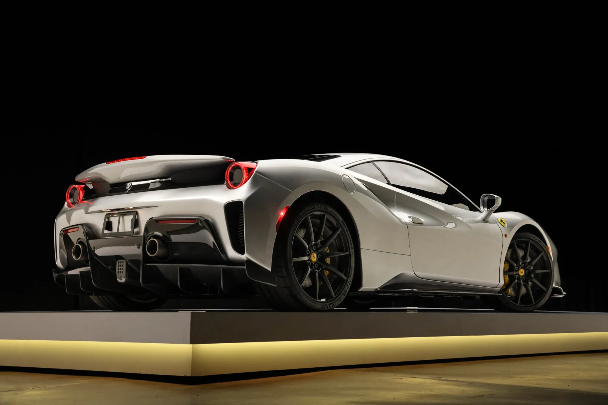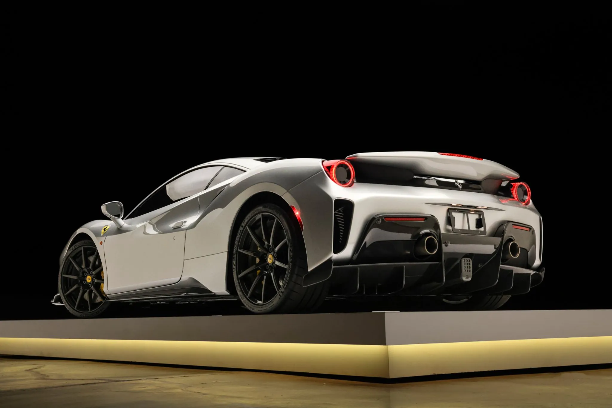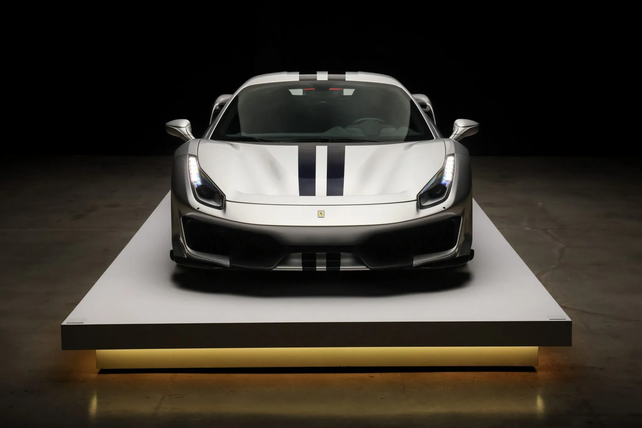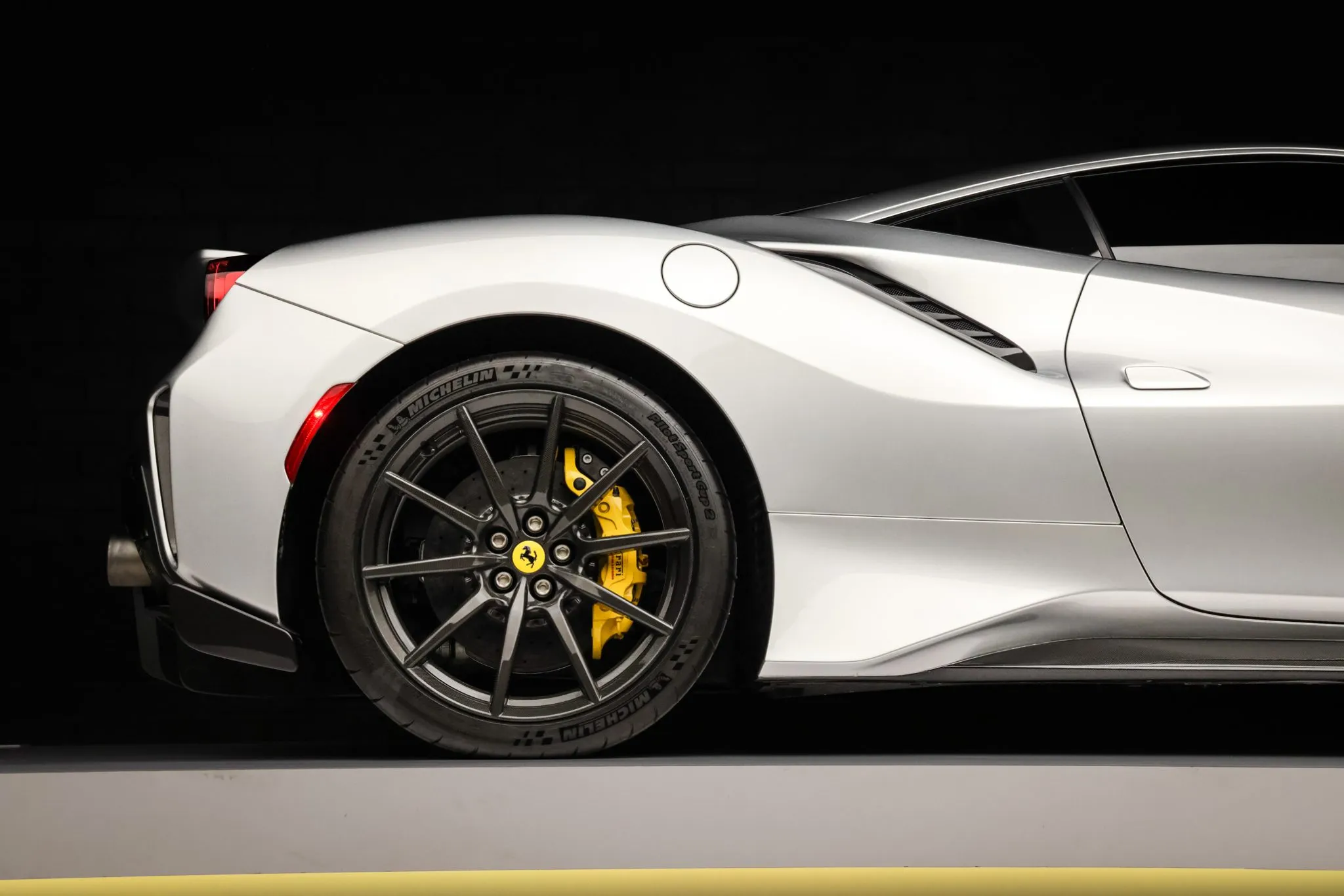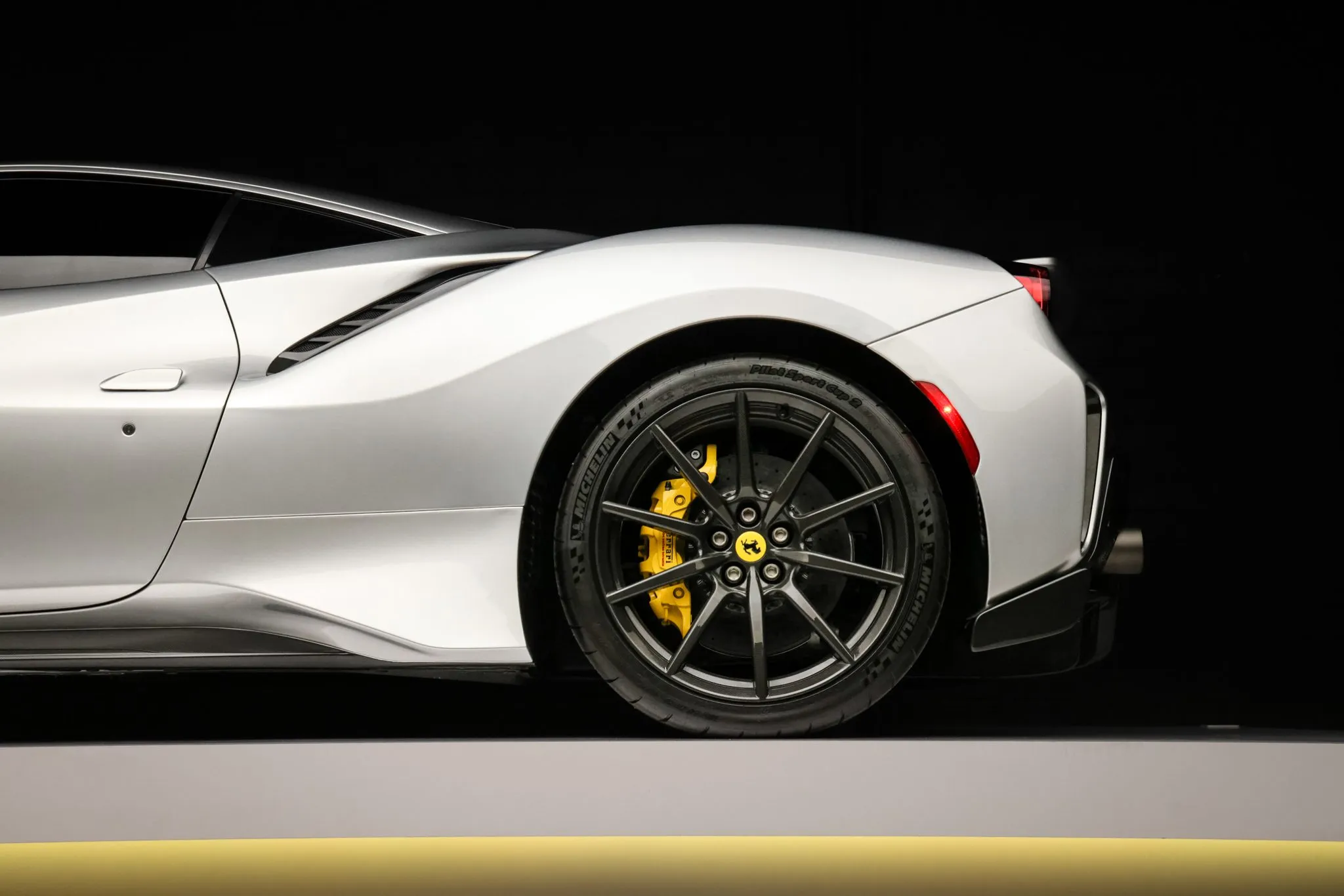 Compared with the standard 488, the Pista features revised bodywork including an underbody diffuser along with carbon-fiber construction of the rear spoiler, doors, and front and rear fascias that contributes to an approximately 200-pound reduction in curb weight. This example is finished in Argento Nurburgring with Blu America stripes and has adaptive headlights, rear parking sensors, a backup camera, a vented deck lid, Scuderia Ferrari fender shields, and a carbon-fiber rear diffuser, rear grille, front flaps, side air splitters, and front air vents. Protective film has been applied to the body, and imperfections on the film are highlighted in the gallery. The windshield was repaired in December 2025, according to the Carfax report.
