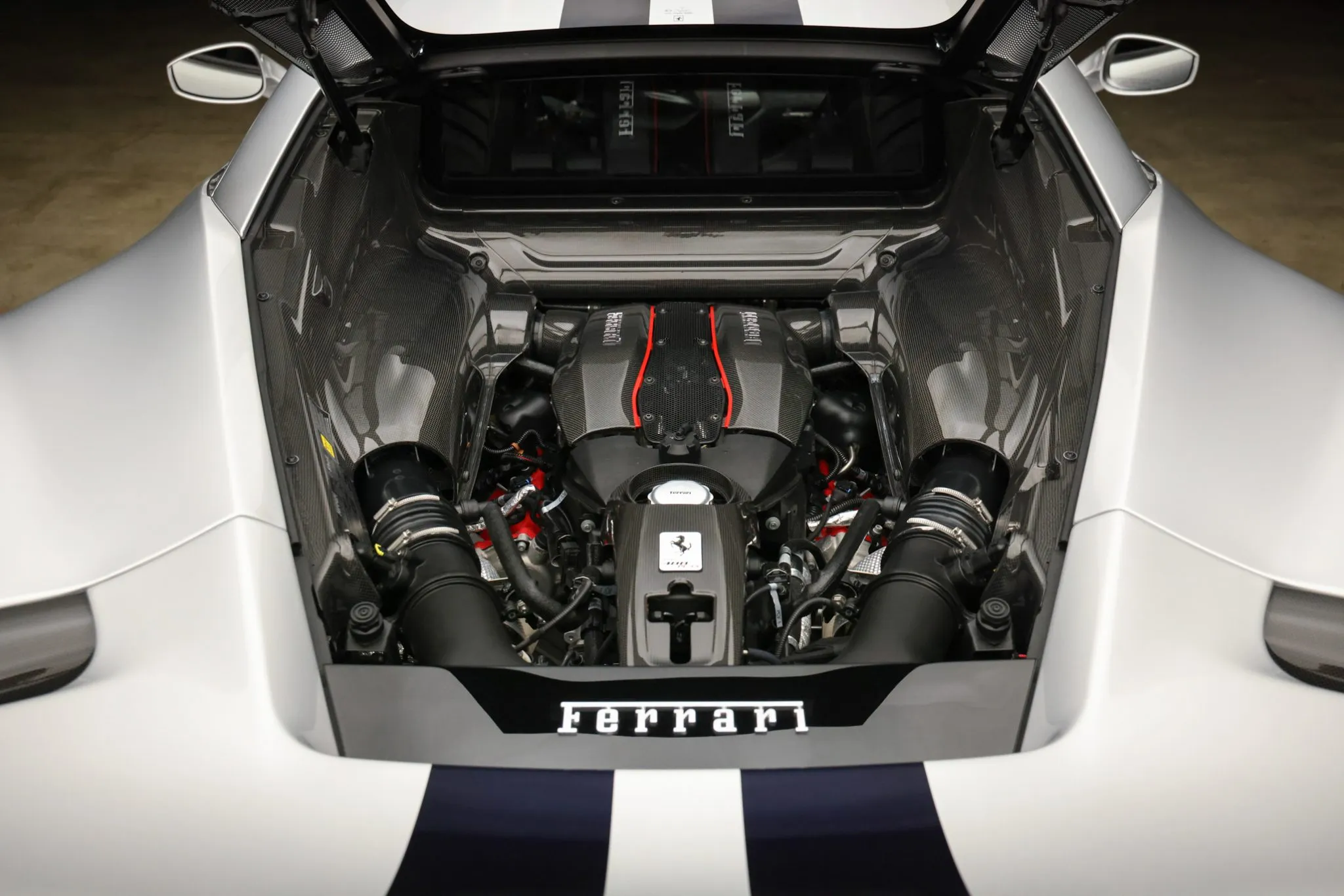 The twin-turbocharged 3.9-liter V8 features larger intercoolers, revised camshafts, titanium connecting rods, and exhaust manifolds from the 488 Challenge and was factory rated at 710 horsepower and 567 lb-ft of torque. The car passed an emissions inspection in January 2026, at which time the oil was also changed.