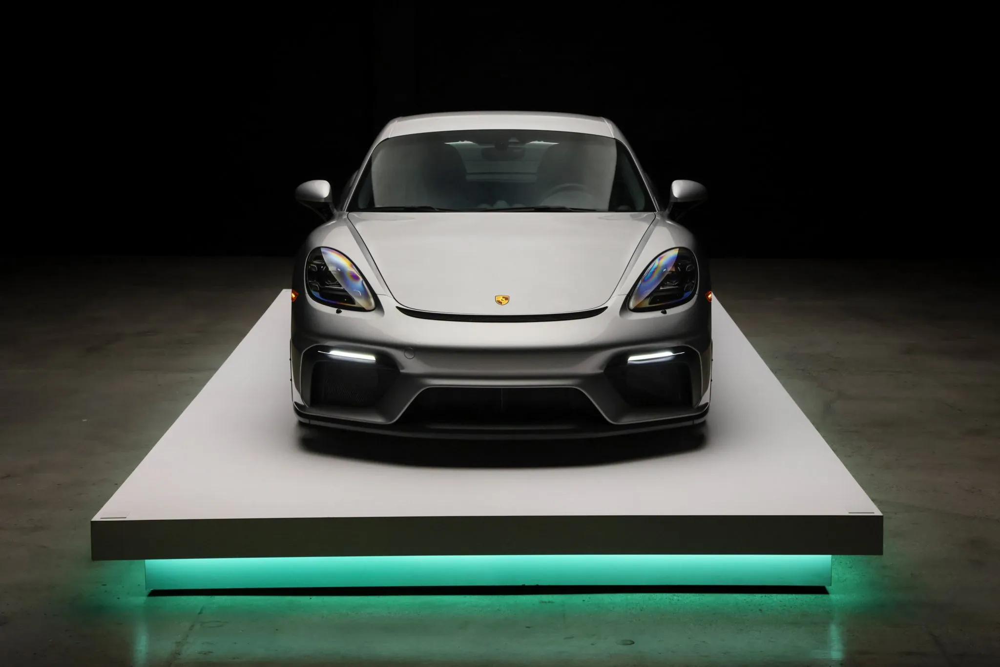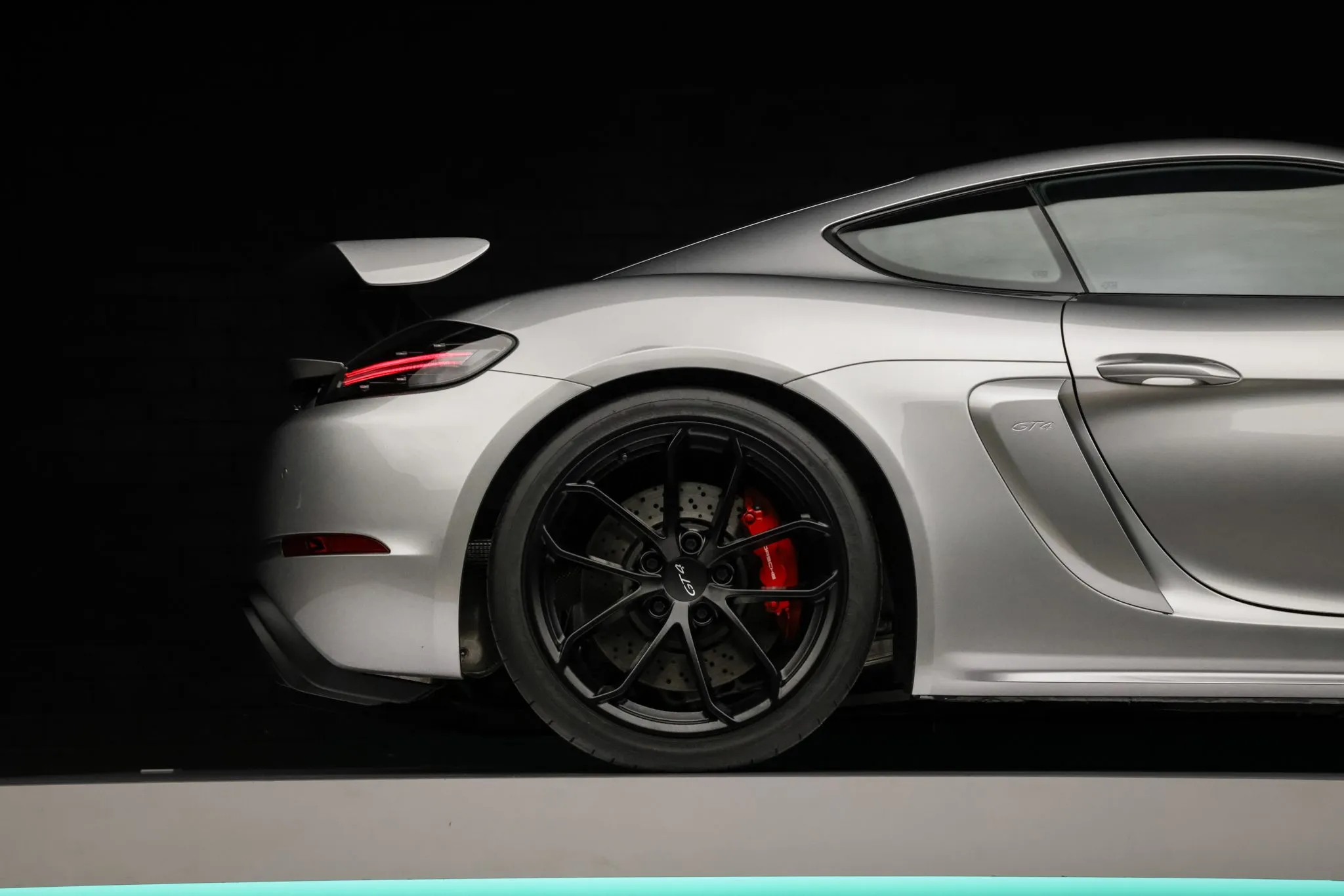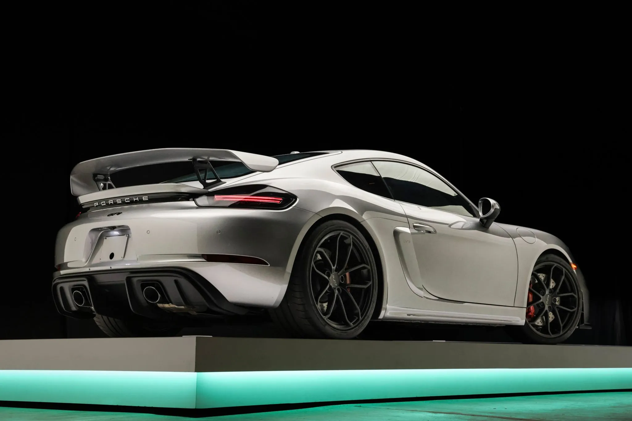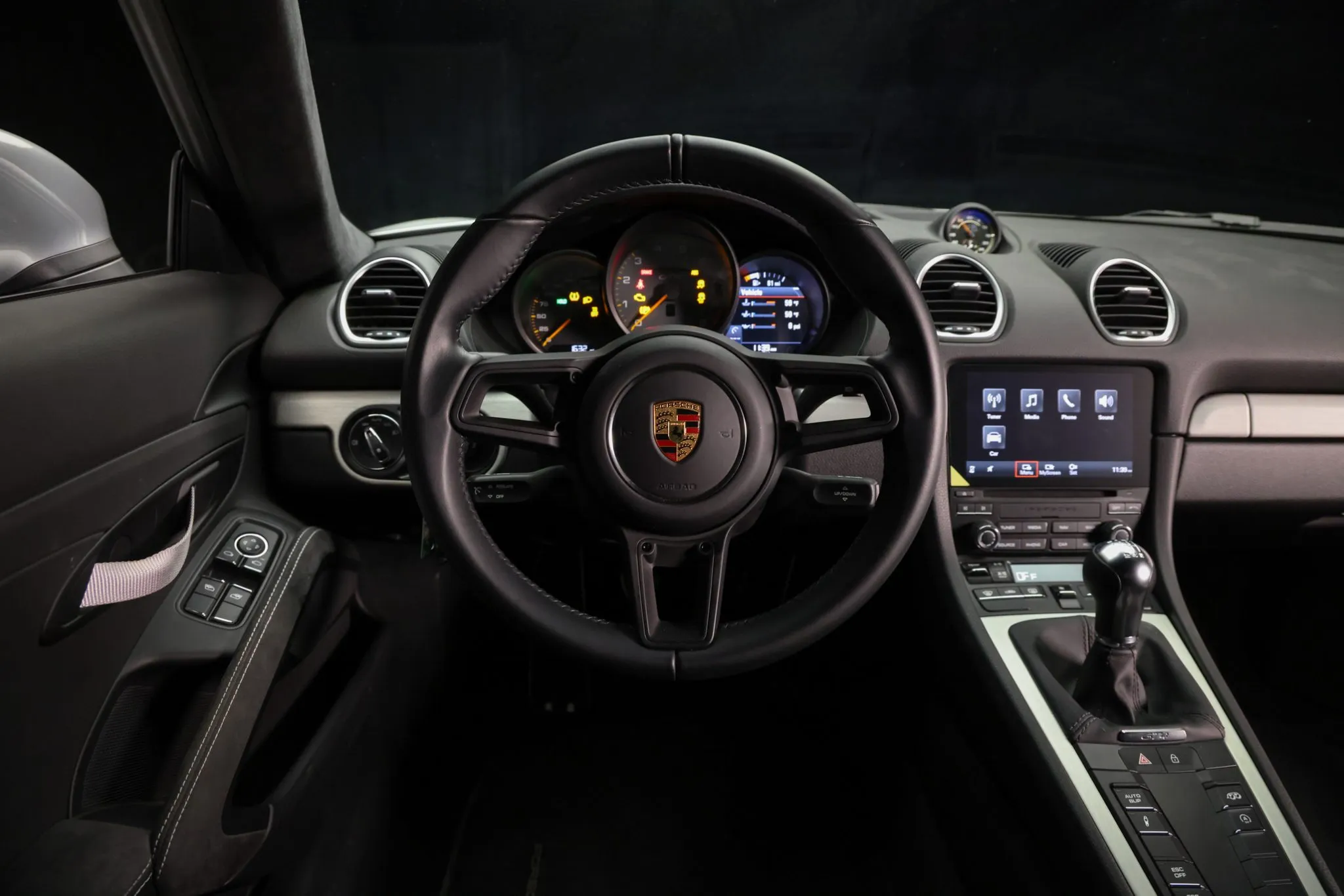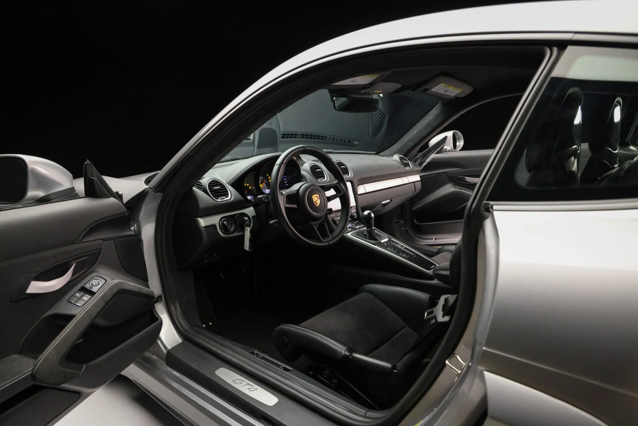 This 2021 Porsche 718 Cayman GT4 has 1,600 miles and is powered by a 4.0-liter flat-six paired with a six-speed manual transaxle and a limited-slip differential with Porsche Torque Vectoring. Finished in GT Silver Metallic over black leather and Race-Tex, the car is equipped with Satin Black 20″ Cayman GT4 alloy wheels, a rear wing, LED headlights with PDLS+, rear ParkAssist, carbon-fiber full bucket seats, the Sport Chrono Package, automatic climate control, a Bose sound system, and Porsche Communication Management. This 982 718 Cayman GT4 was purchased by the owner in 2021 and is now offered in California on dealer consignment by the selling dealer, a Local Partner, with a clean Carfax report and a clean Michigan title.