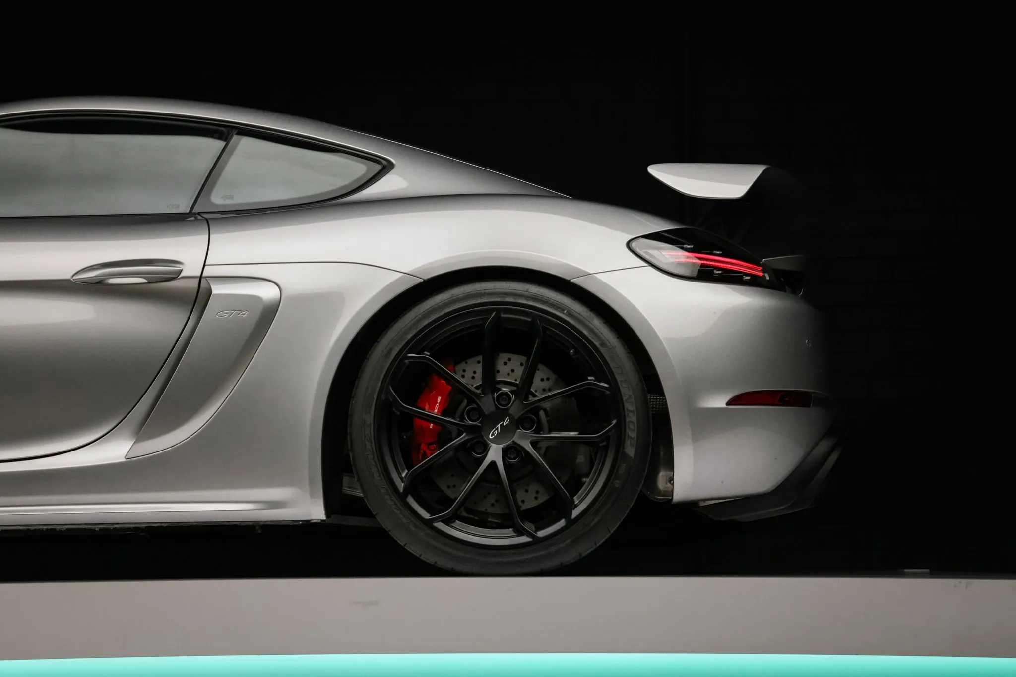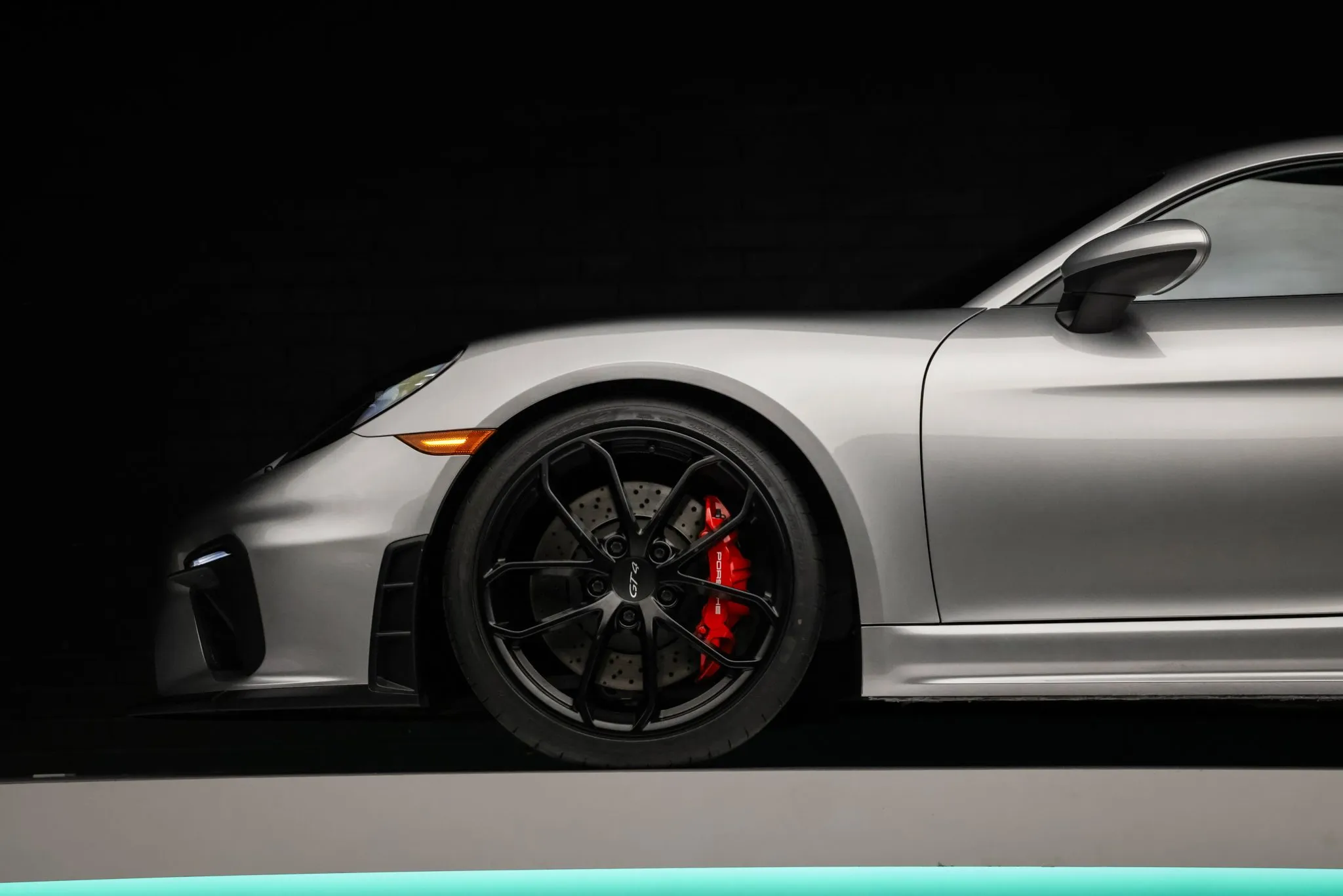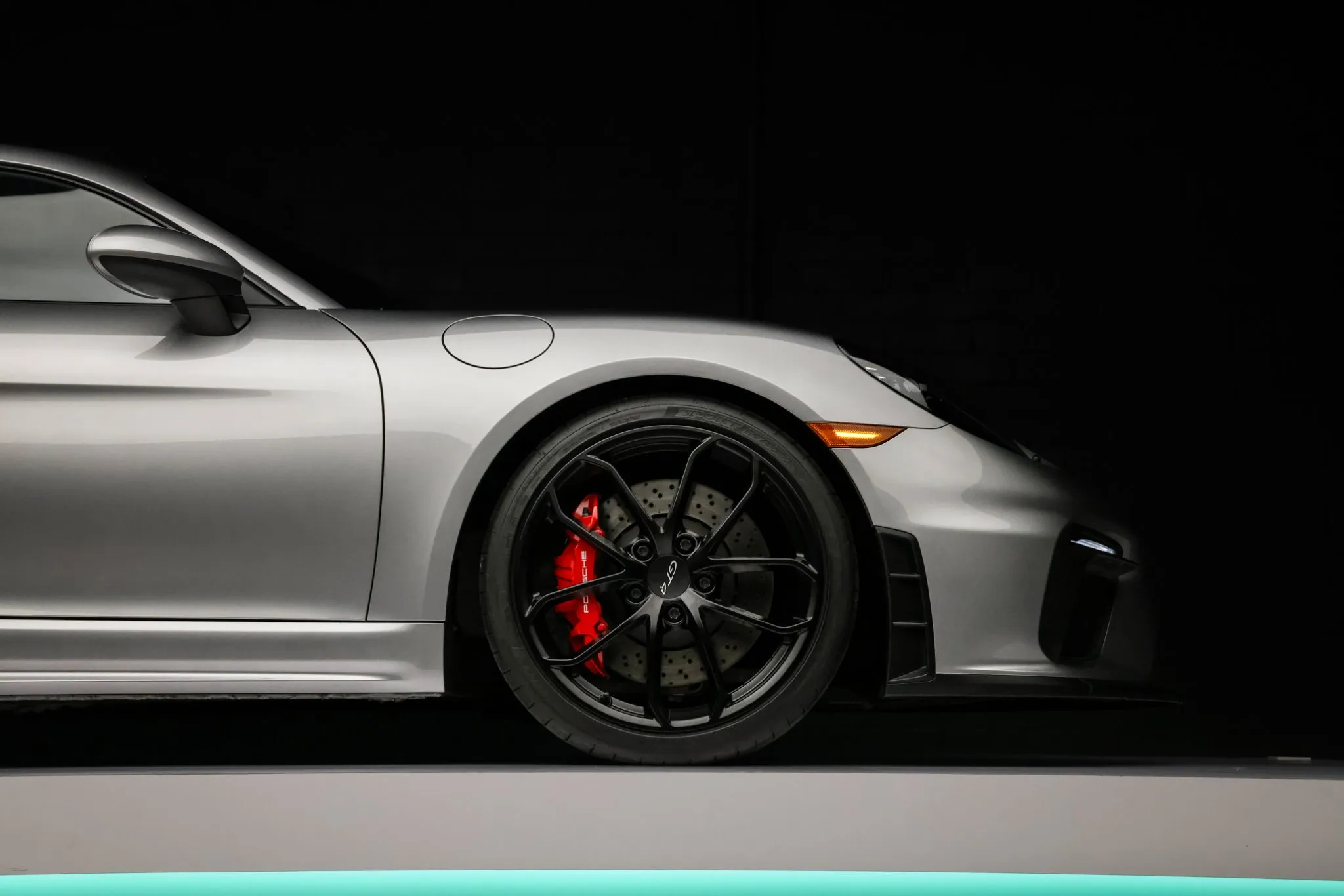 Satin Black-finished 20″ Cayman GT4 alloy wheels are mounted with Dunlop tires. Stopping power is provided by ventilated and dimpled rotors with red-finished calipers at each corner. The car is equipped with Porsche Active Suspension Management (PASM). A brake fluid flush was performed in May 2025.