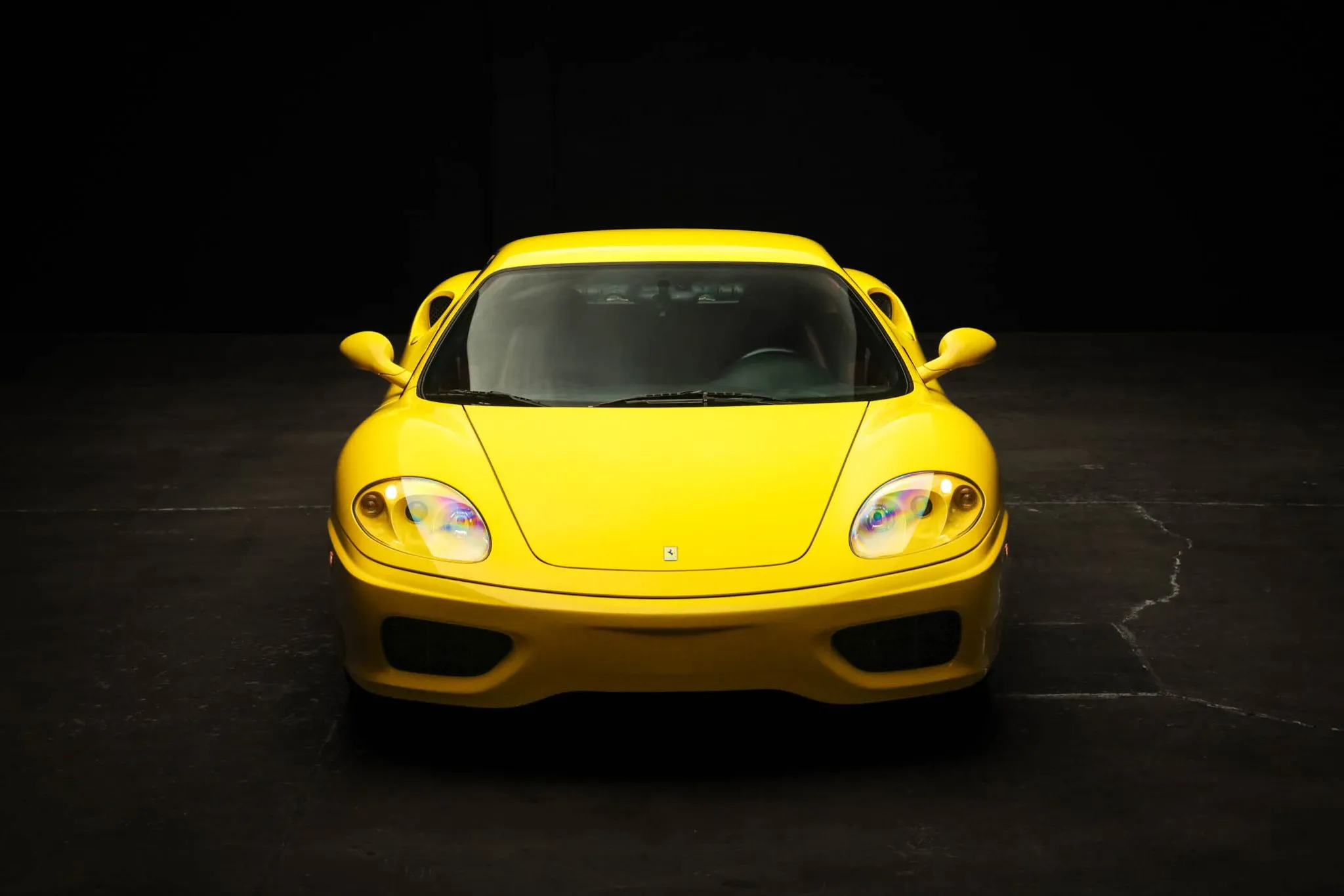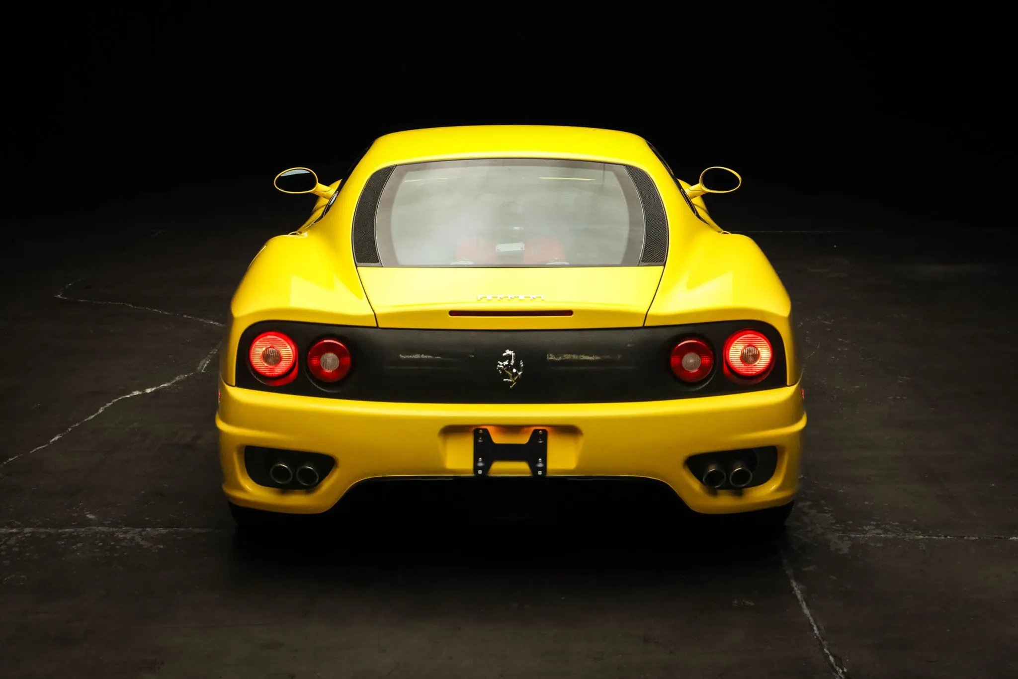 The Pininfarina-designed aluminum body is finished in Giallo Modena and features a Challenge-style mesh rear grille, xenon headlights, and quad exhaust outlets exiting through the rear fascia. The front bumper cover was repainted circa 2019. Close-up photos of paint chips are viewable in the gallery below.