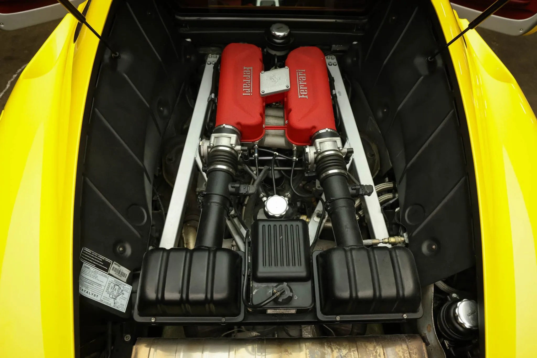 The mid-mounted 3.6-liter Tipo F131 V8 features a flat-plane crankshaft, dry-sump lubrication, dual overhead camshafts, and five valves per cylinder. Factory-rated output was 395 horsepower and 275 lb-ft of torque. The fuel pumps are said to have been replaced between 2019 and 2020. The timing belts, tensioners, and bearings were replaced in May 2025, at which time the alternator belt, A/C belt, and motor mounts were also changed.