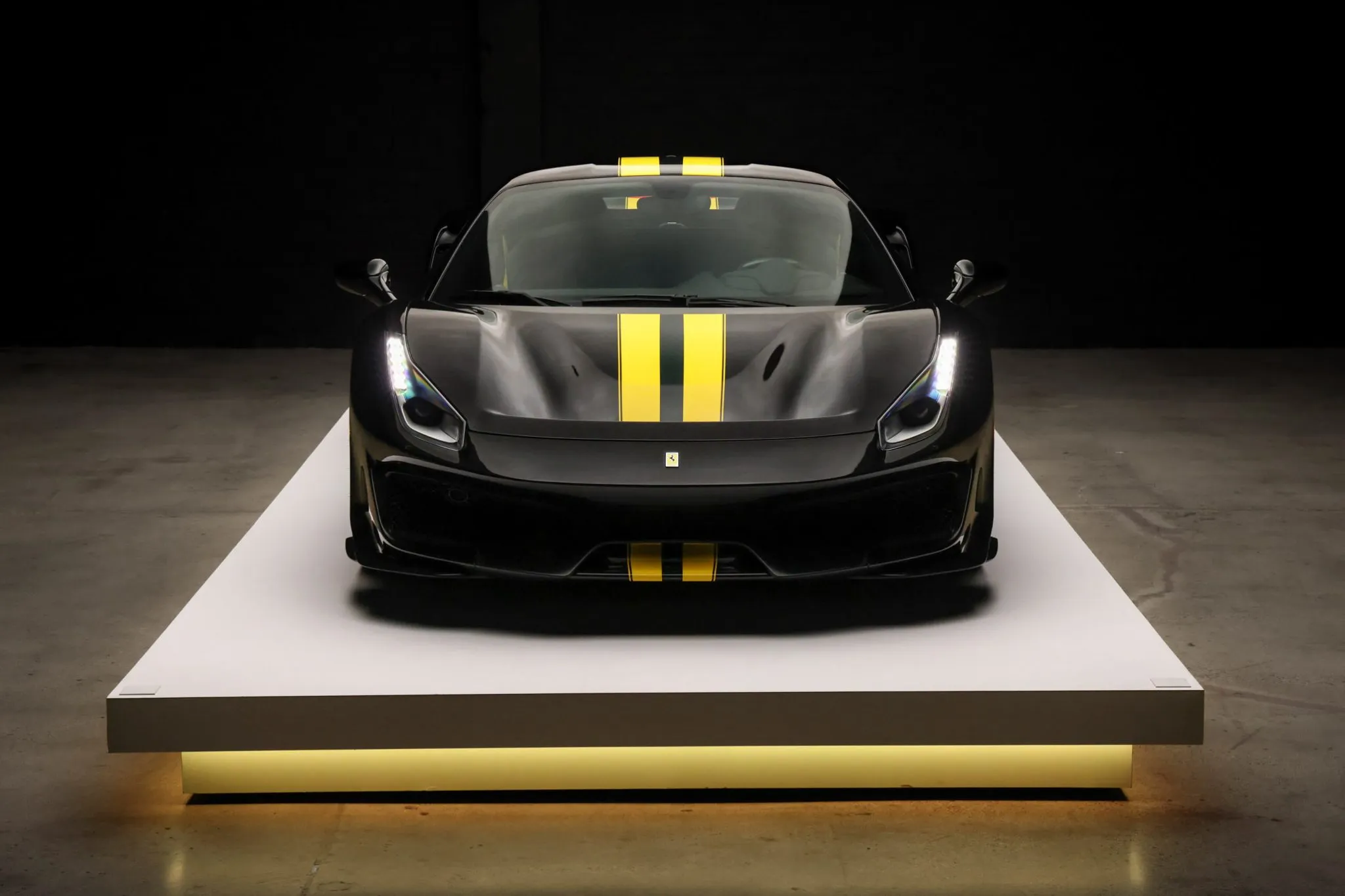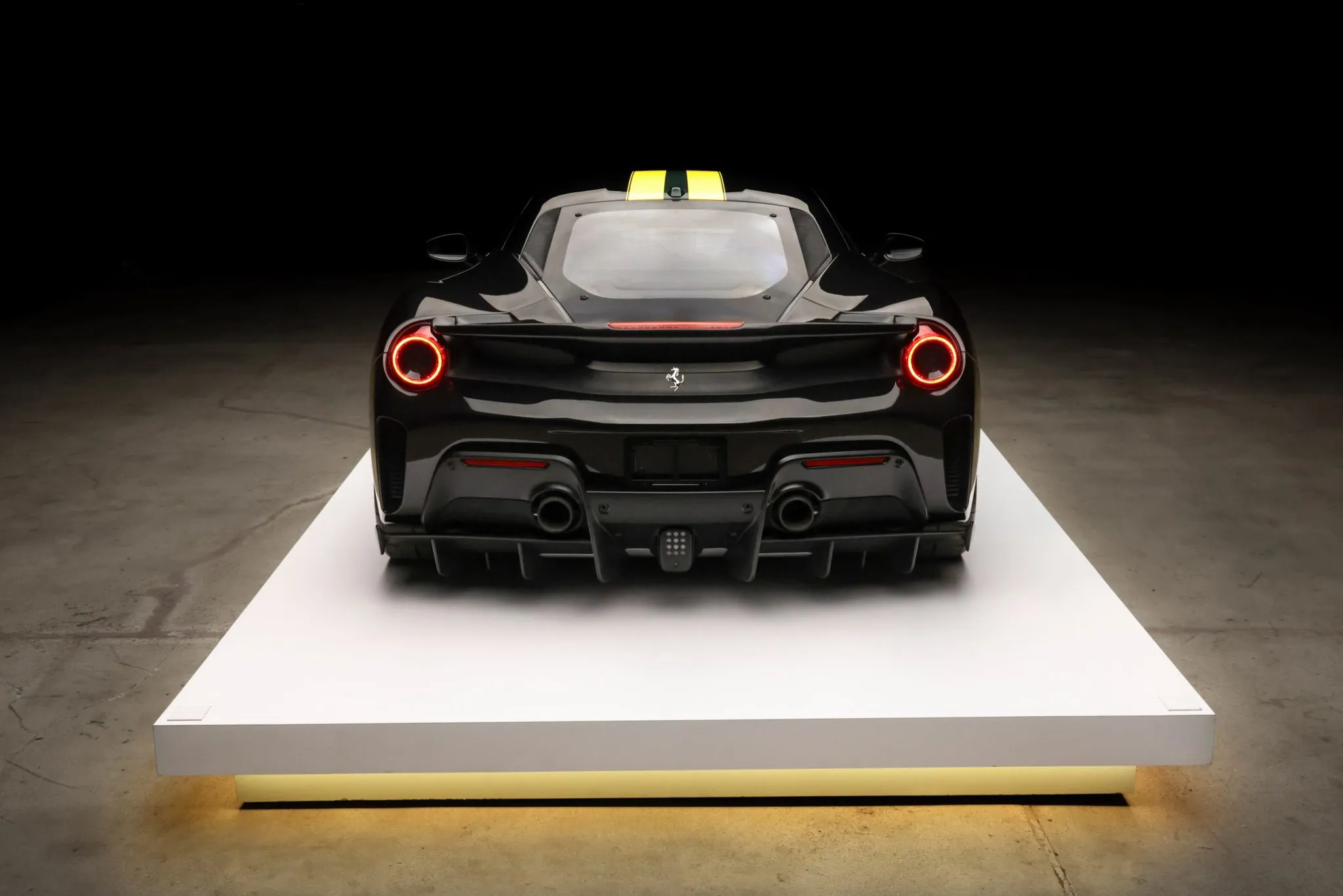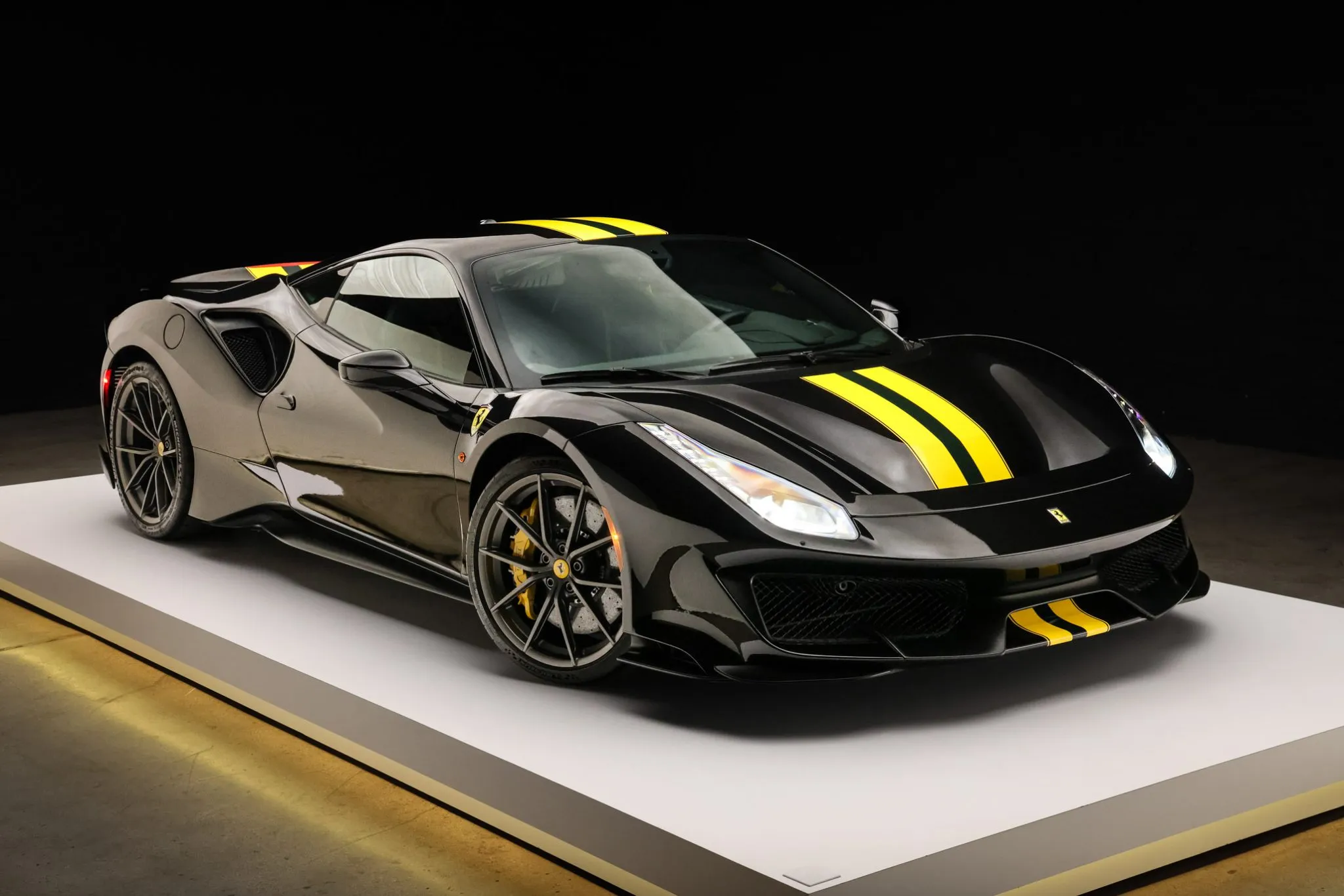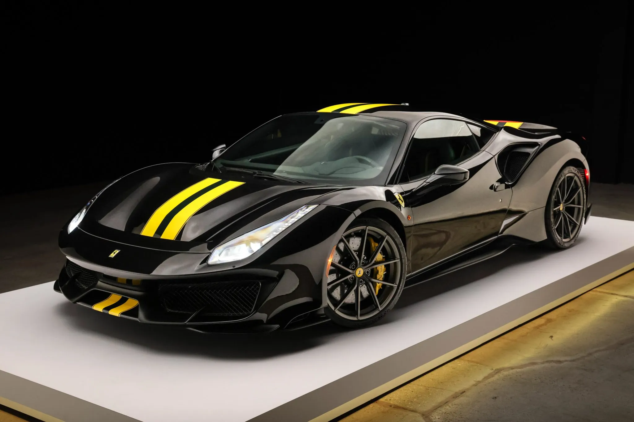 Compared with the standard 488, the Pista features revised bodywork including an underbody diffuser along with carbon-fiber construction of the rear spoiler, doors, and front and rear fascias that contributes to an approximately 200-pound reduction in curb weight. This example is finished in Nero Daytona with Verde British Racing and Giallo Modena stripes in addition to adaptive headlights, parking sensors, a backup camera, Scuderia Ferrari fender shields, and a vented deck lid.