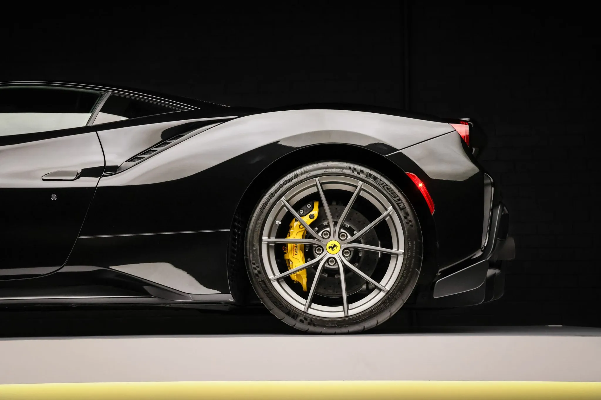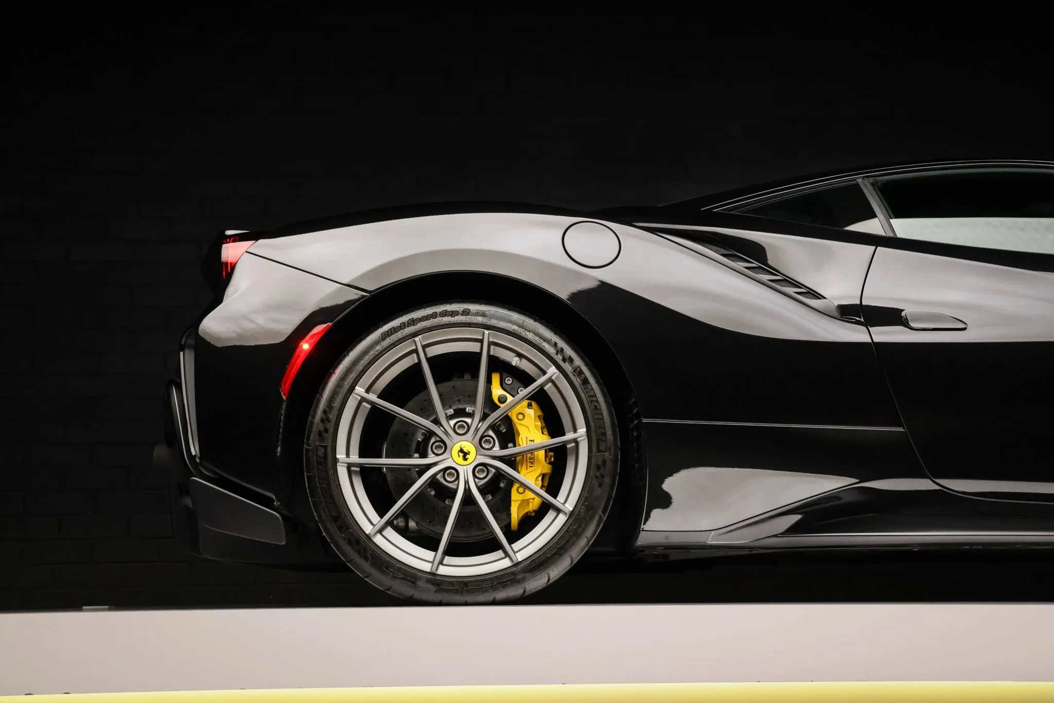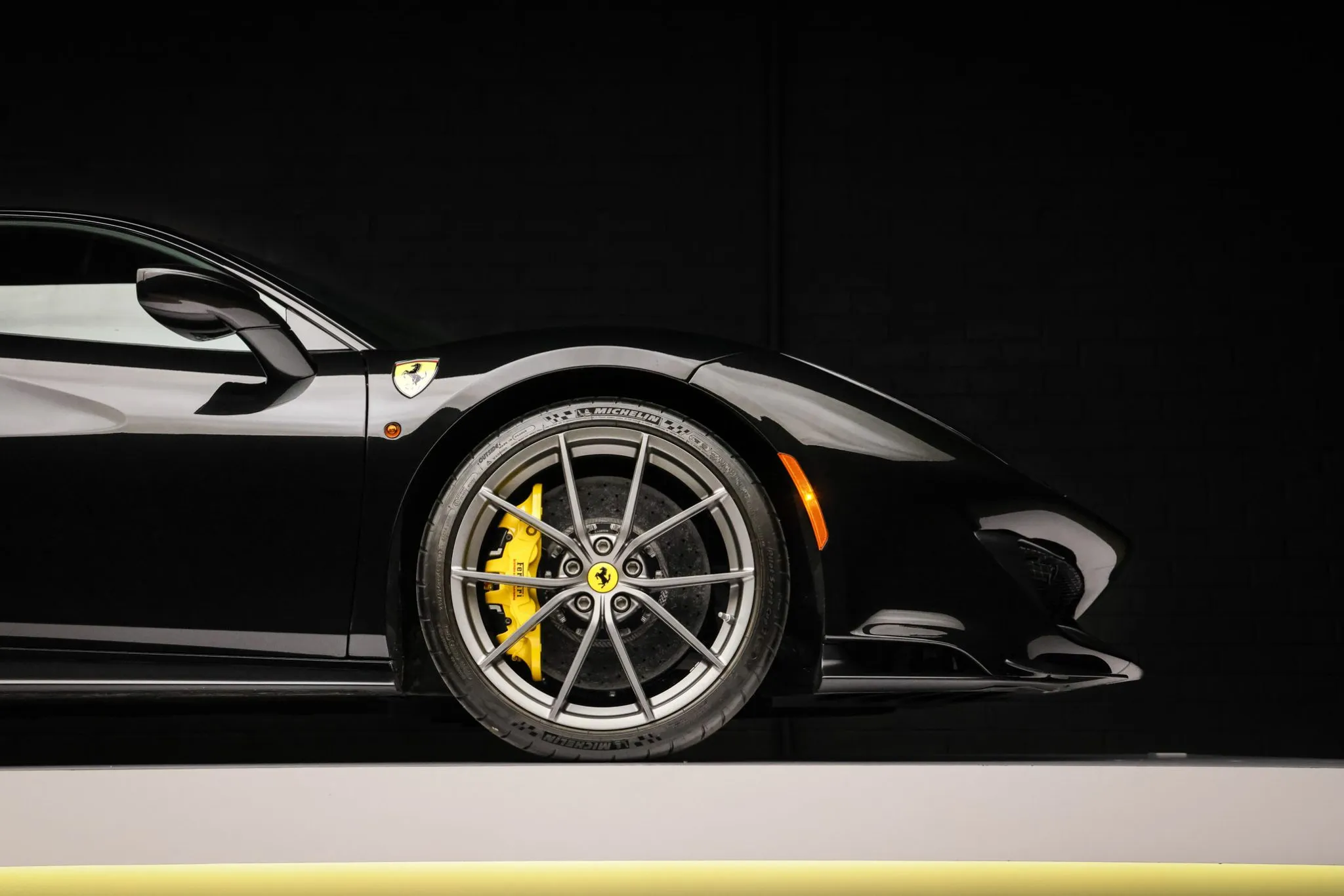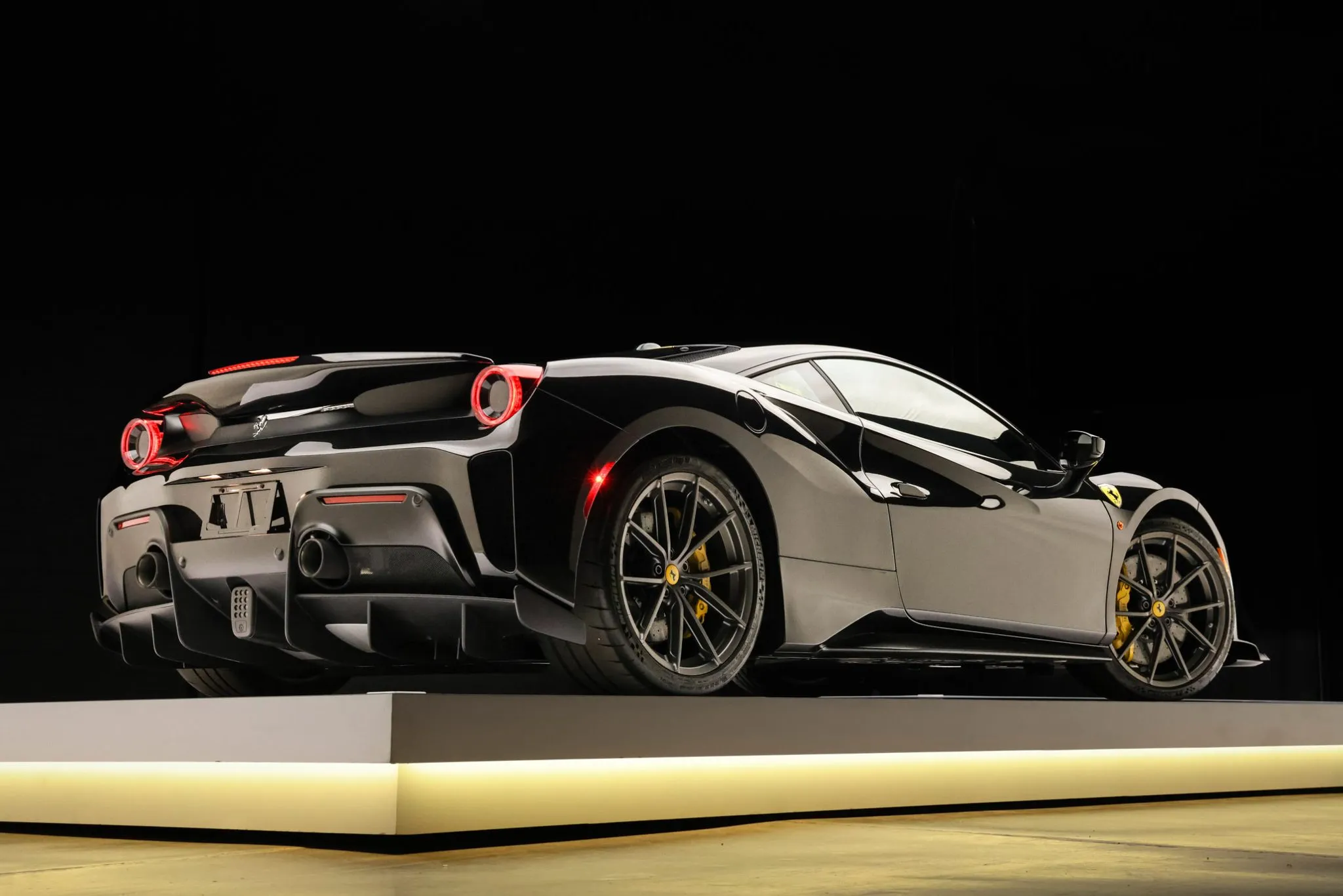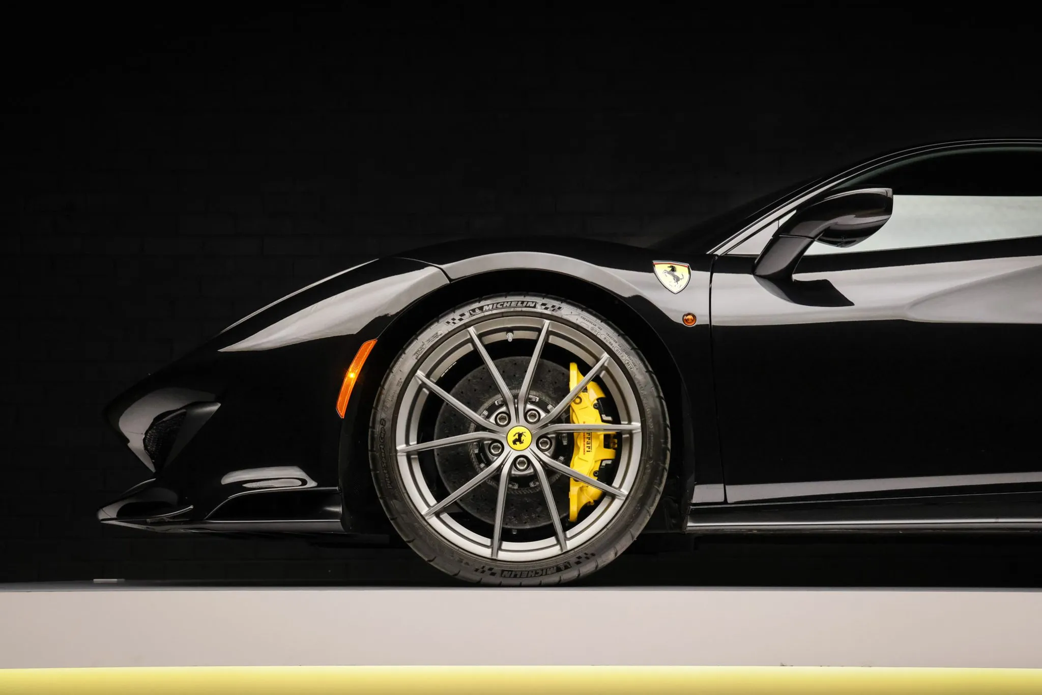Compared with the standard 488, the Pista features revised bodywork including an underbody diffuser along with carbon-fiber construction of the rear spoiler, doors, and front and rear fascias that contributes to an approximately 200-pound reduction in curb weight. This example is finished in Nero Daytona with Verde British Racing and Giallo Modena stripes in addition to adaptive headlights, parking sensors, a backup camera, Scuderia Ferrari fender shields, and a vented deck lid.