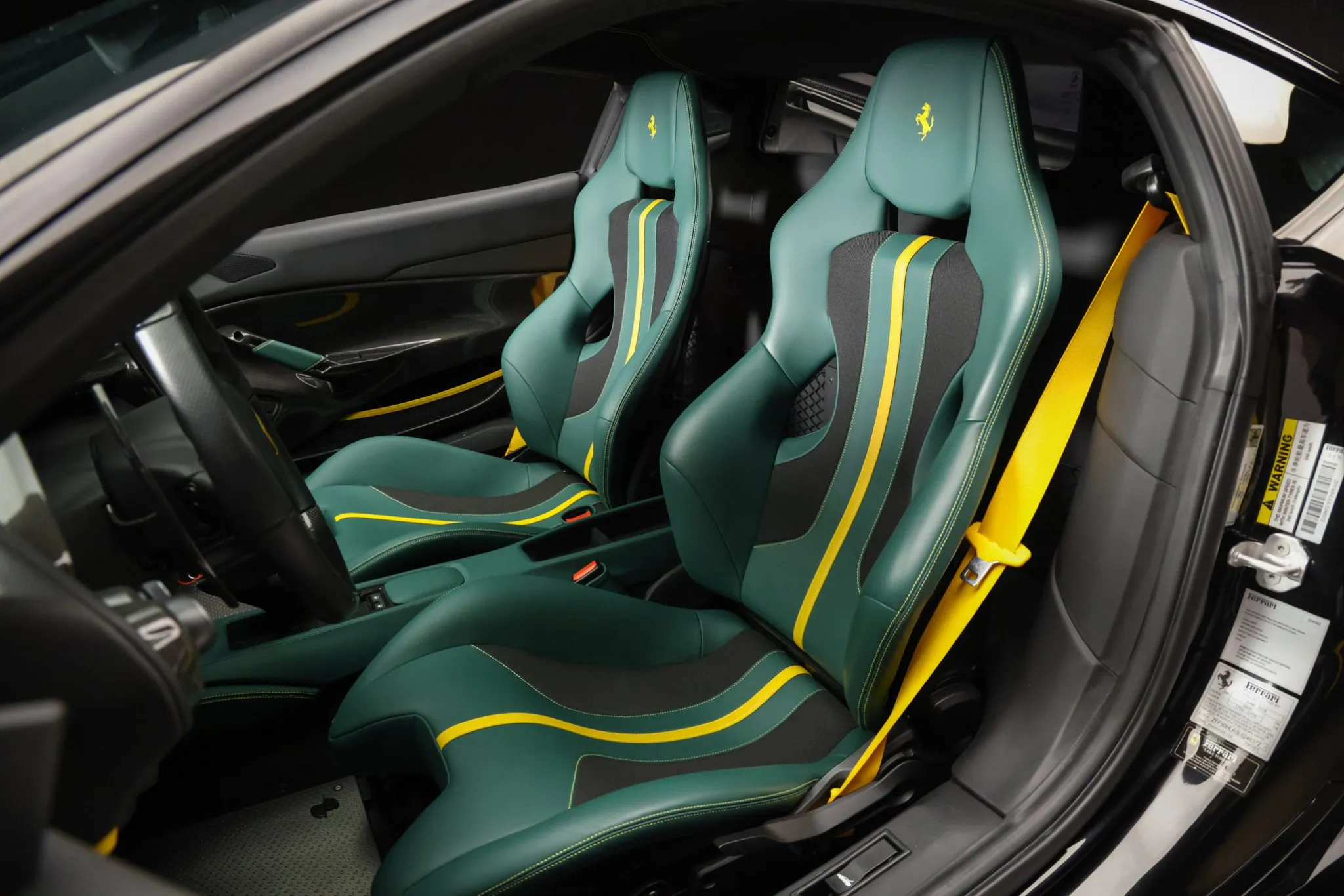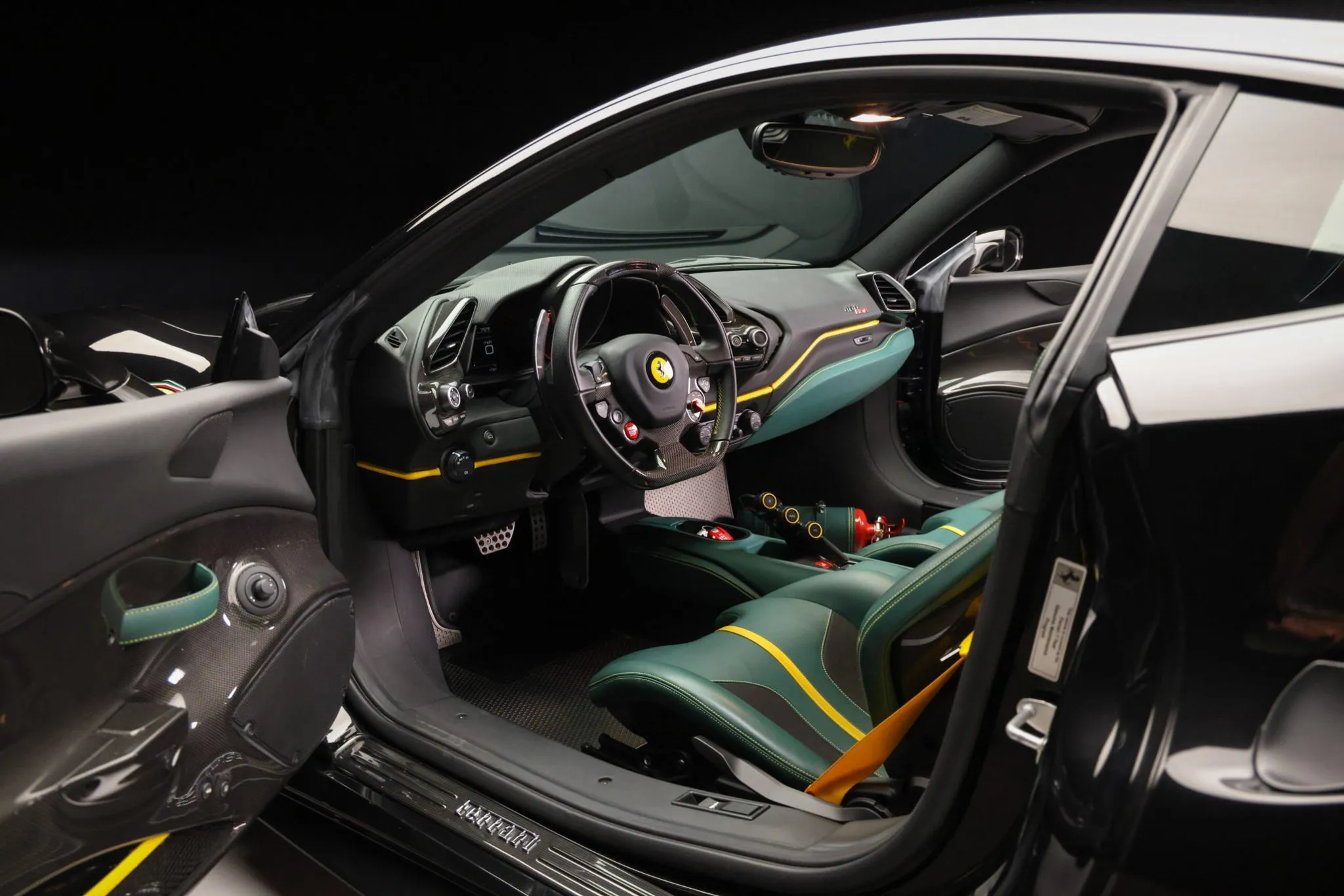 The large-sized carbon-fiber racing seats are trimmed in Verde and black upholstery with Cavallino Rampante logos on the headrests, Giallo center stripes, yellow seatbelts, and contrasting stitching that extends to the center console and door pull straps. Carbon-fiber trim accents the cabin, and additional appointments include yellow rings on the F1 button, a fire extinguisher, dual-zone automatic climate control, navigation, and cruise control.