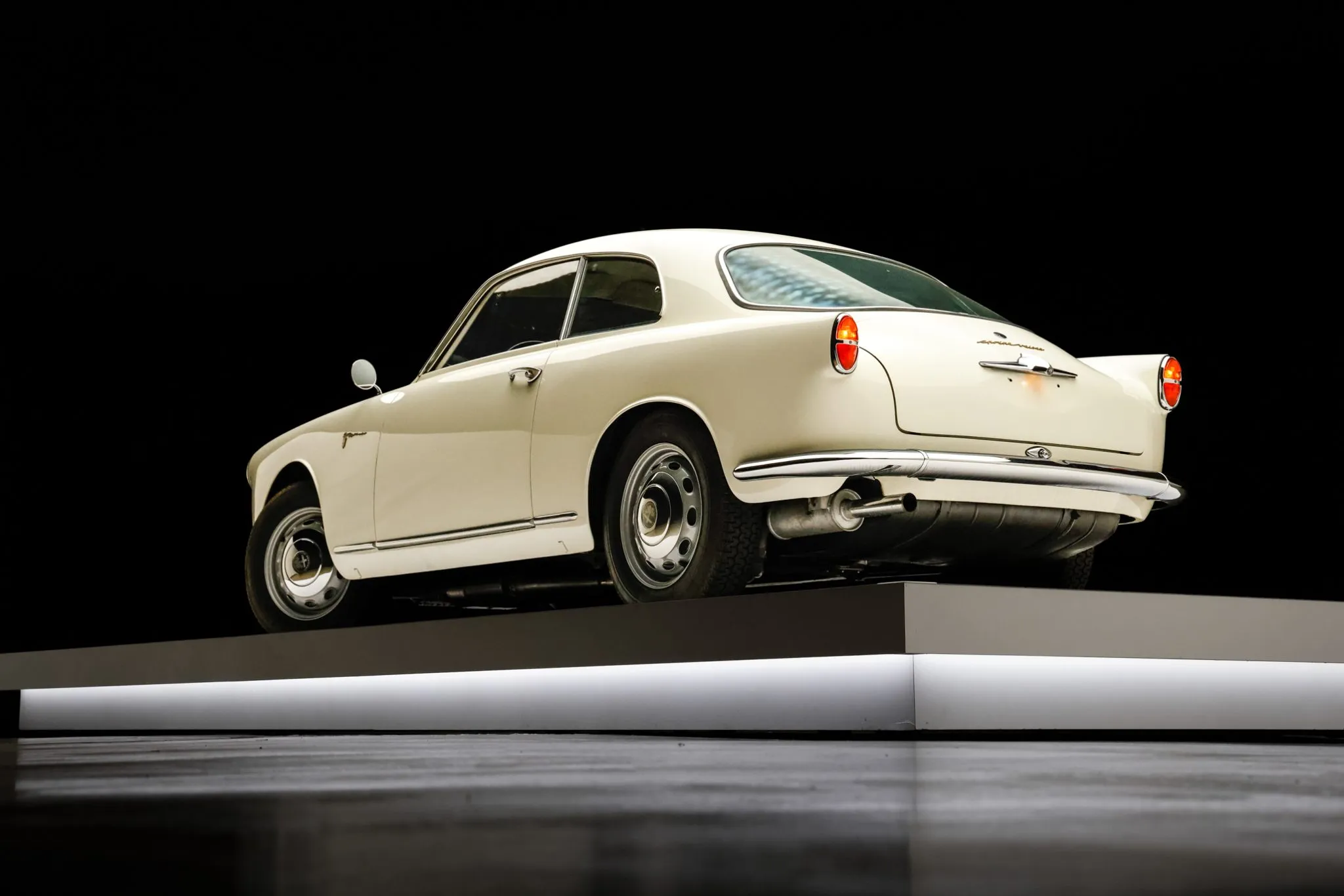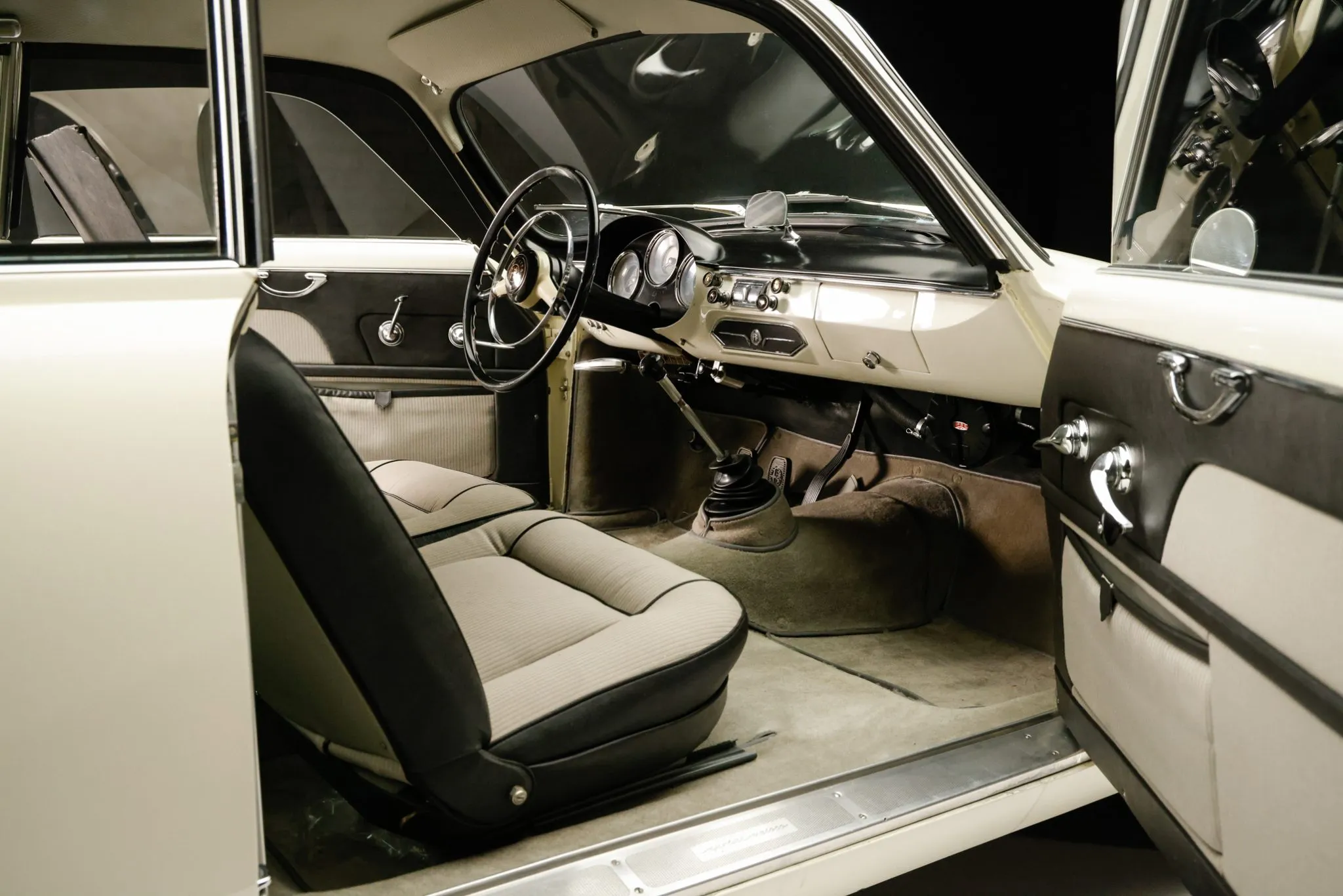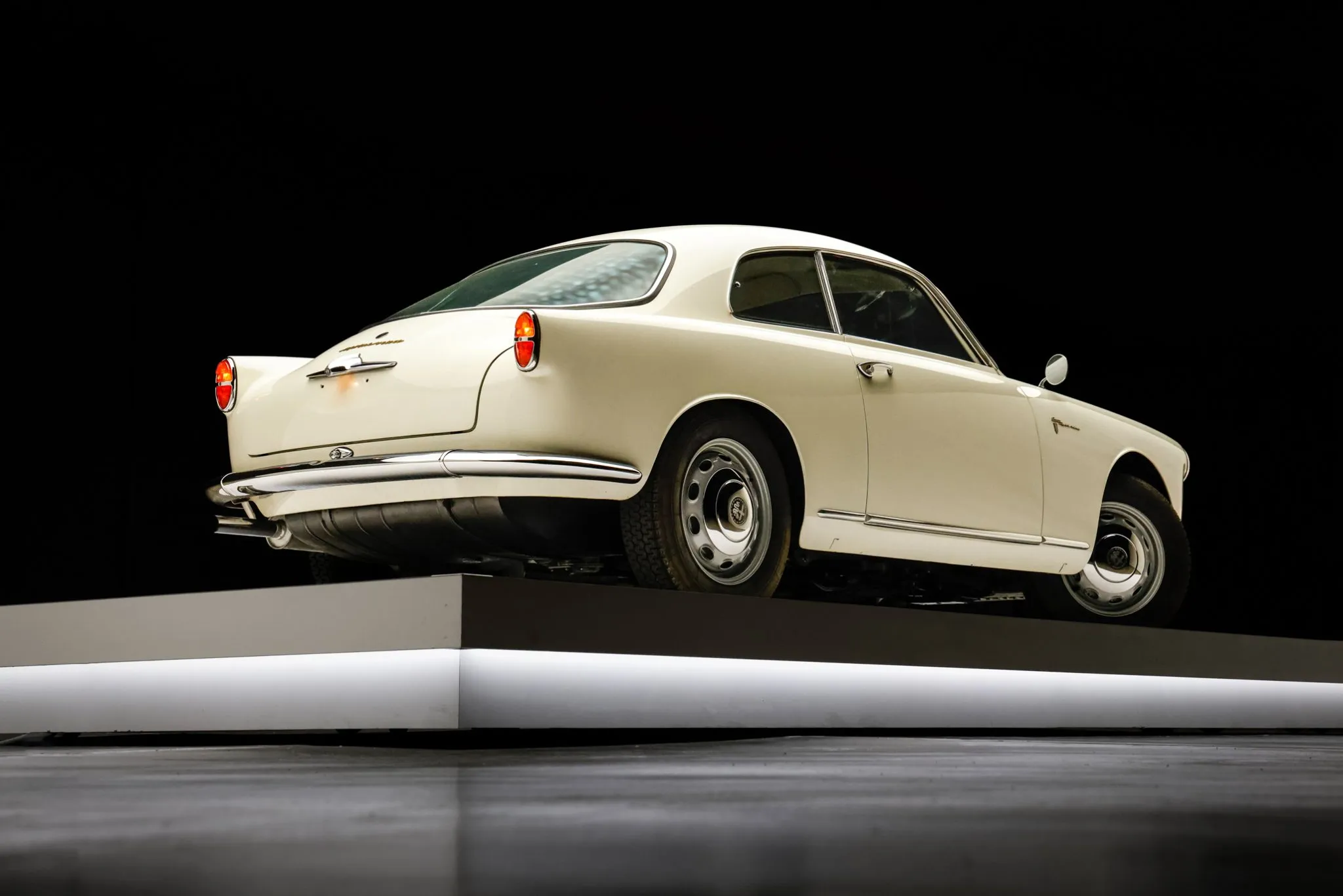 The Bertone-styled bodywork of this example is believed to have been repainted in its current ivory finish in the 1990s. The car features a chrome-finished tripartite grille up front as well as fintail-style quarter panels out back, and further details include Carello headlamps, Bertone fender badging, and a driver-side mirror.
