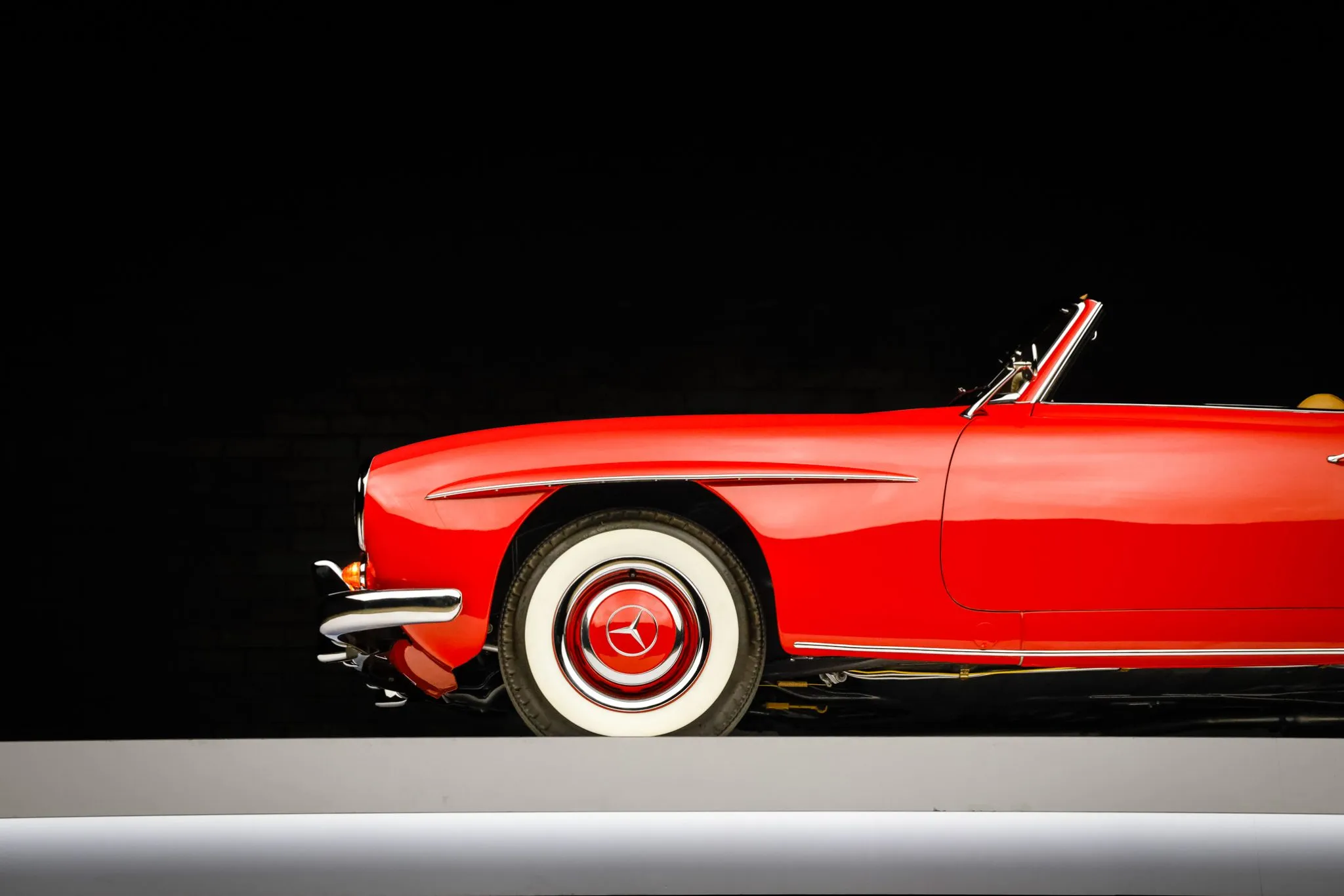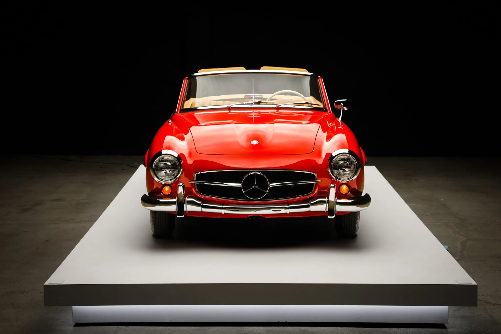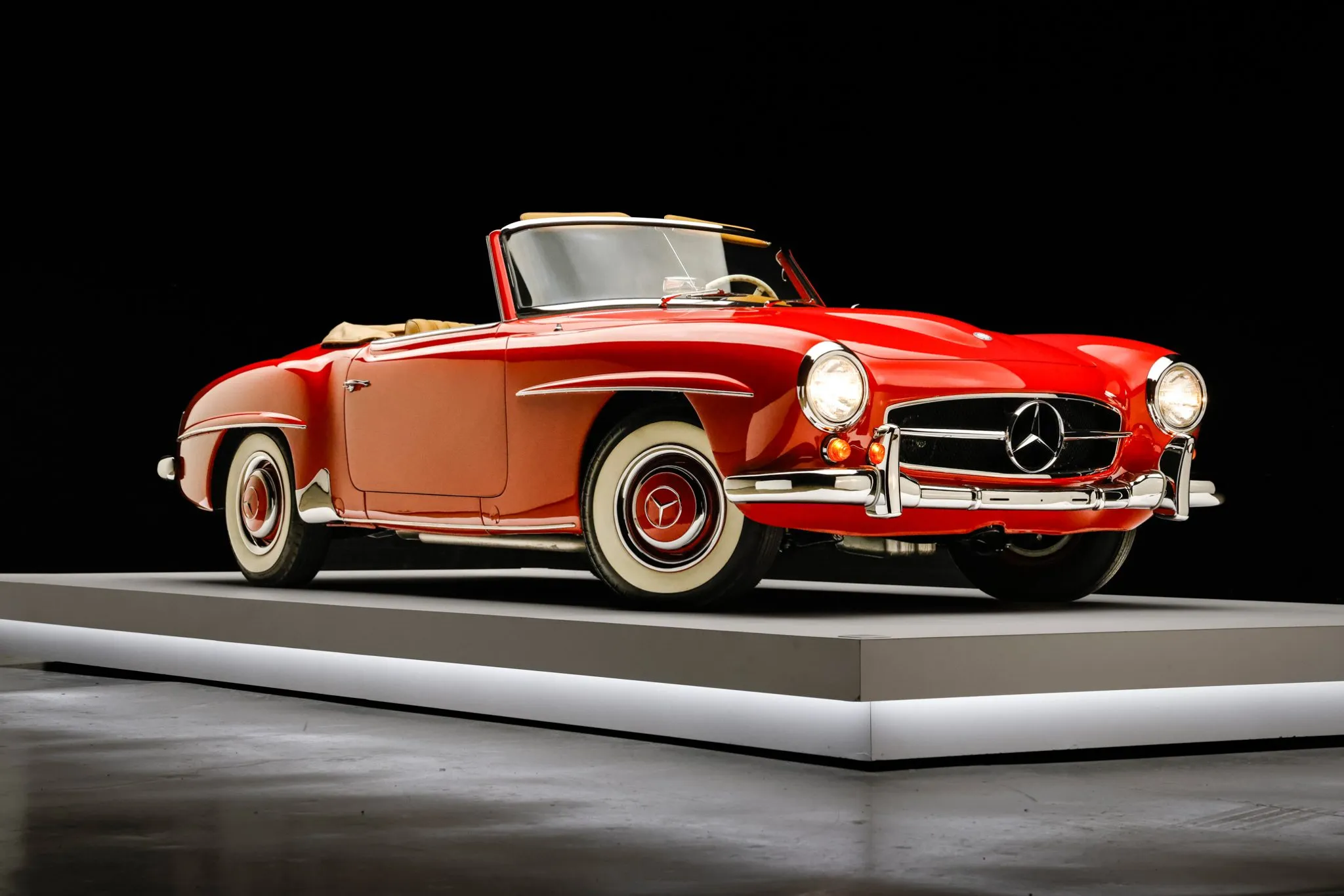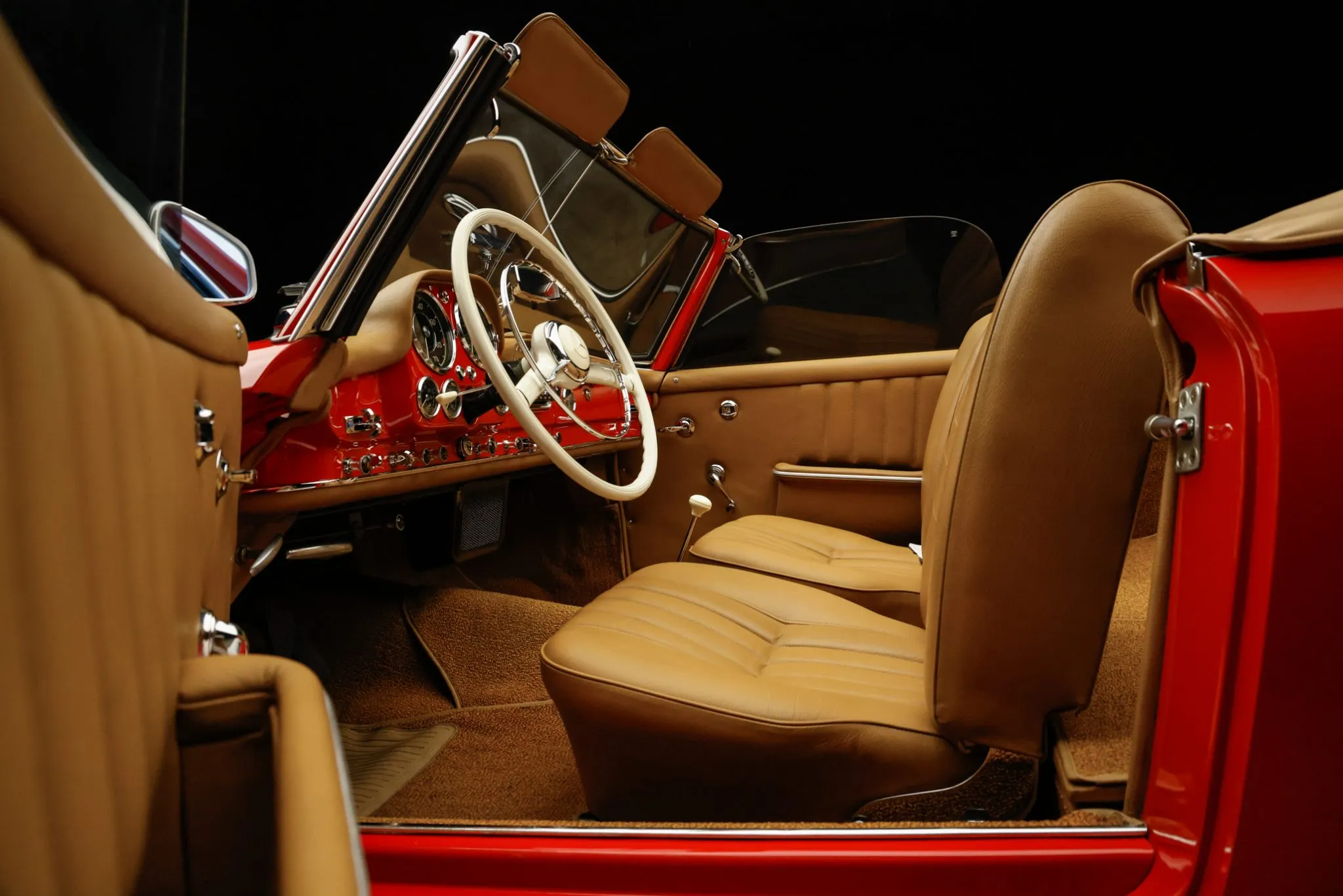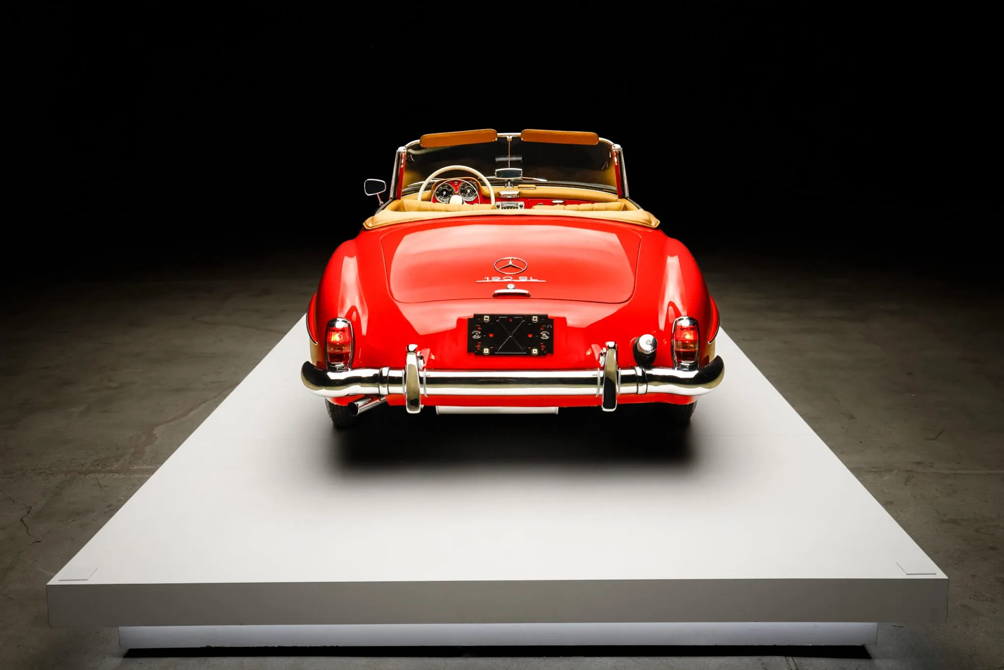 This 1959 Mercedes-Benz 190SL spent time in California prior to a multi-year restoration carried out between 2009 and 2013. Work involved repainting the car red, replacing the tan convertible top, refreshing the tan interior, overhauling the suspension, and rebuilding the 1.9-liter inline-four and four-speed manual transmission. The car has dual Solex carburetors and 13″ steel wheels with body-color hubcaps along with a boot cover and a Becker Europa AM/FM radio. This 190SL is now offered on dealer consignment in California with build sheet copies, manufacturer’s literature, a tool kit, and a clean Montana title.