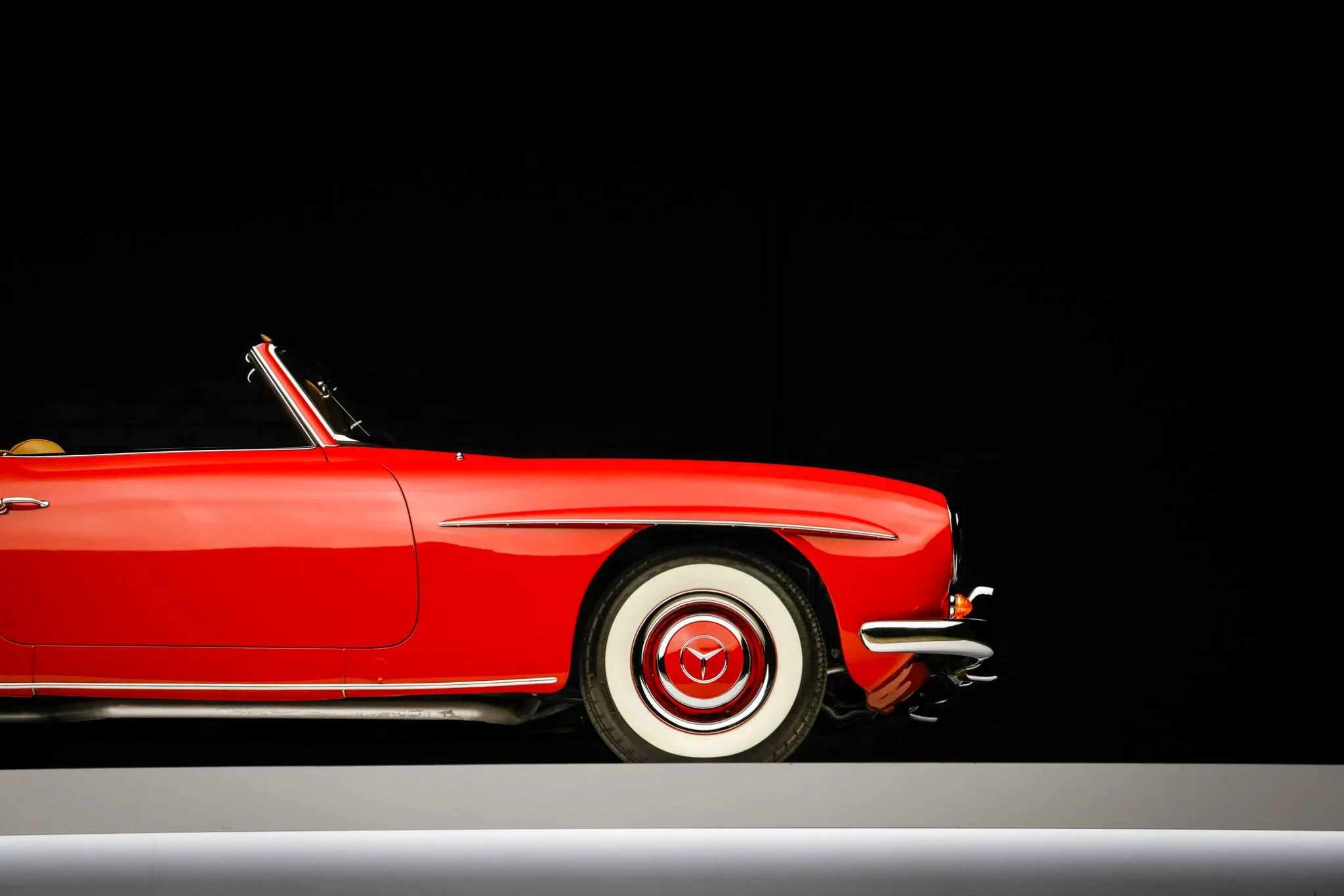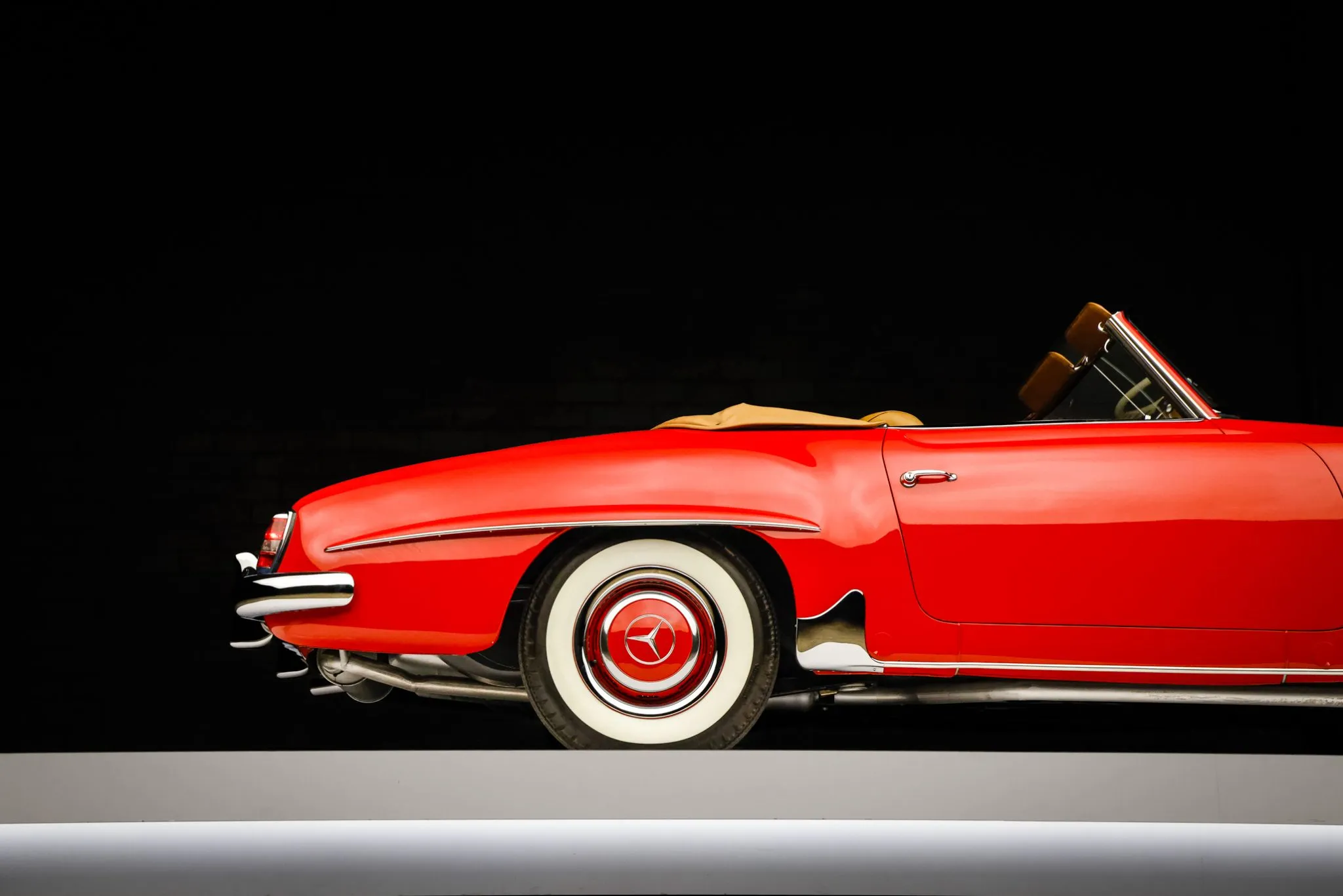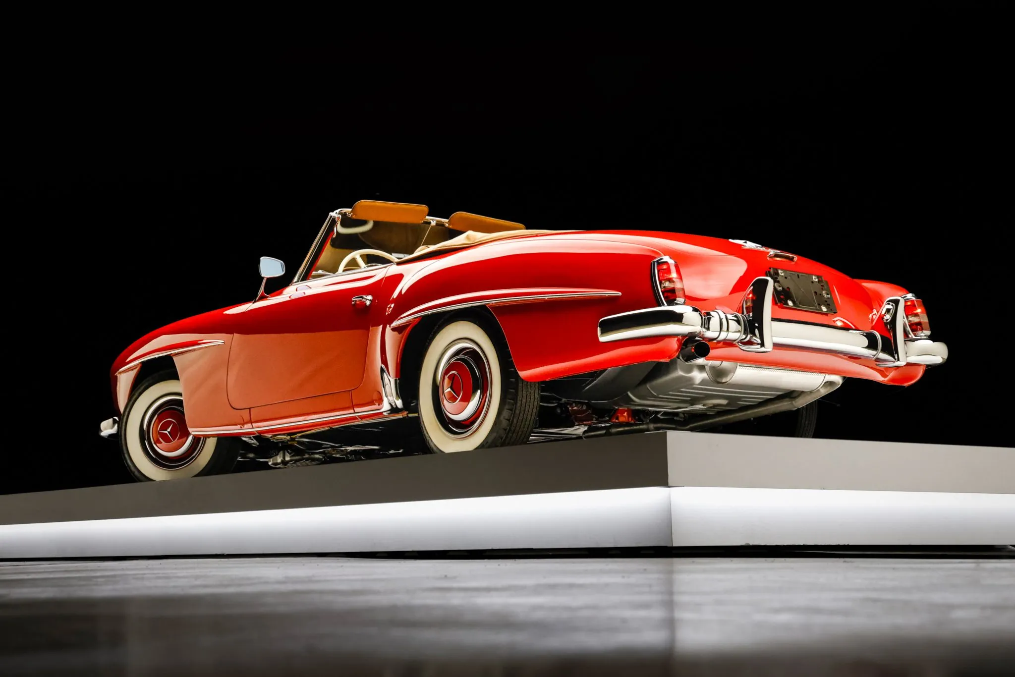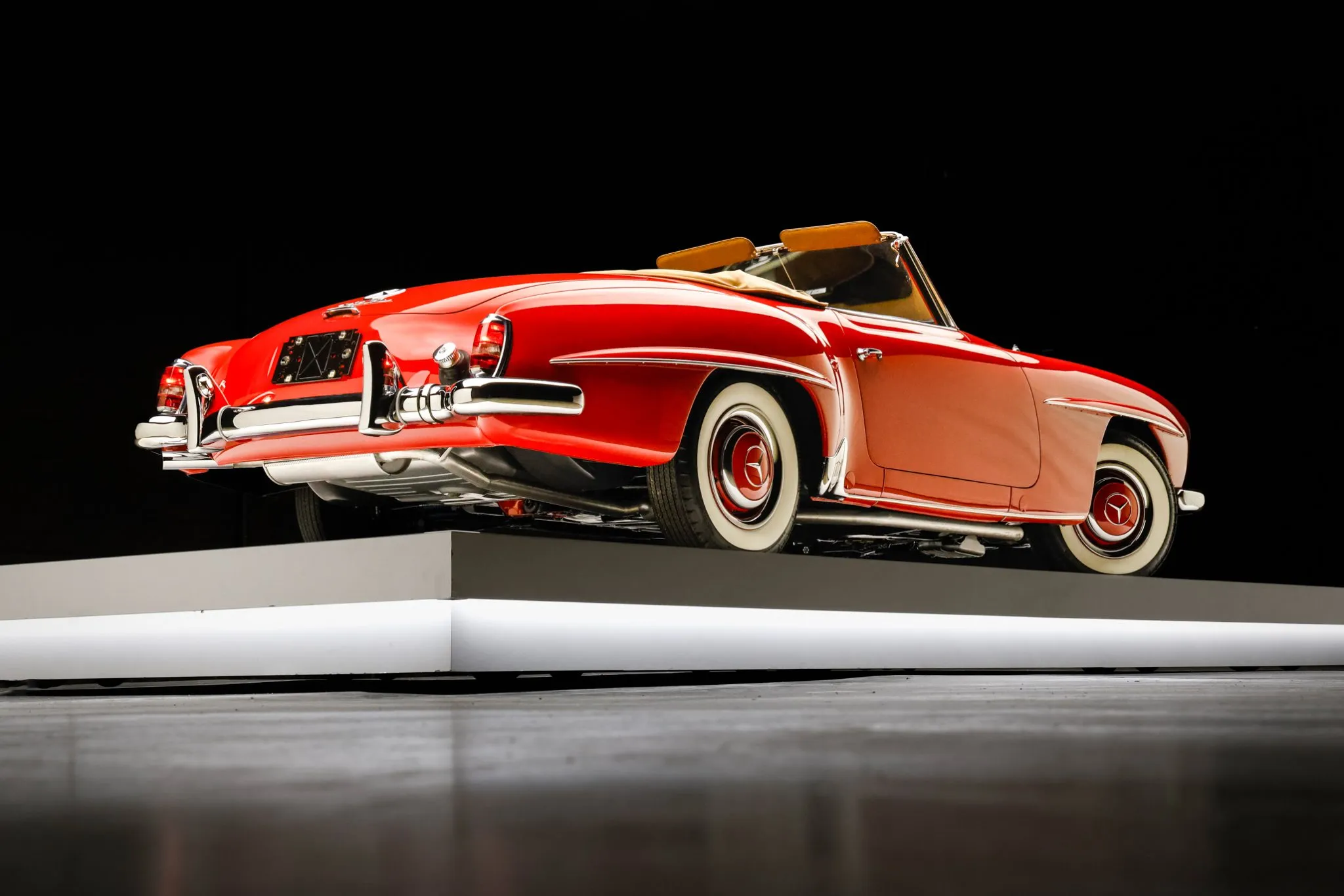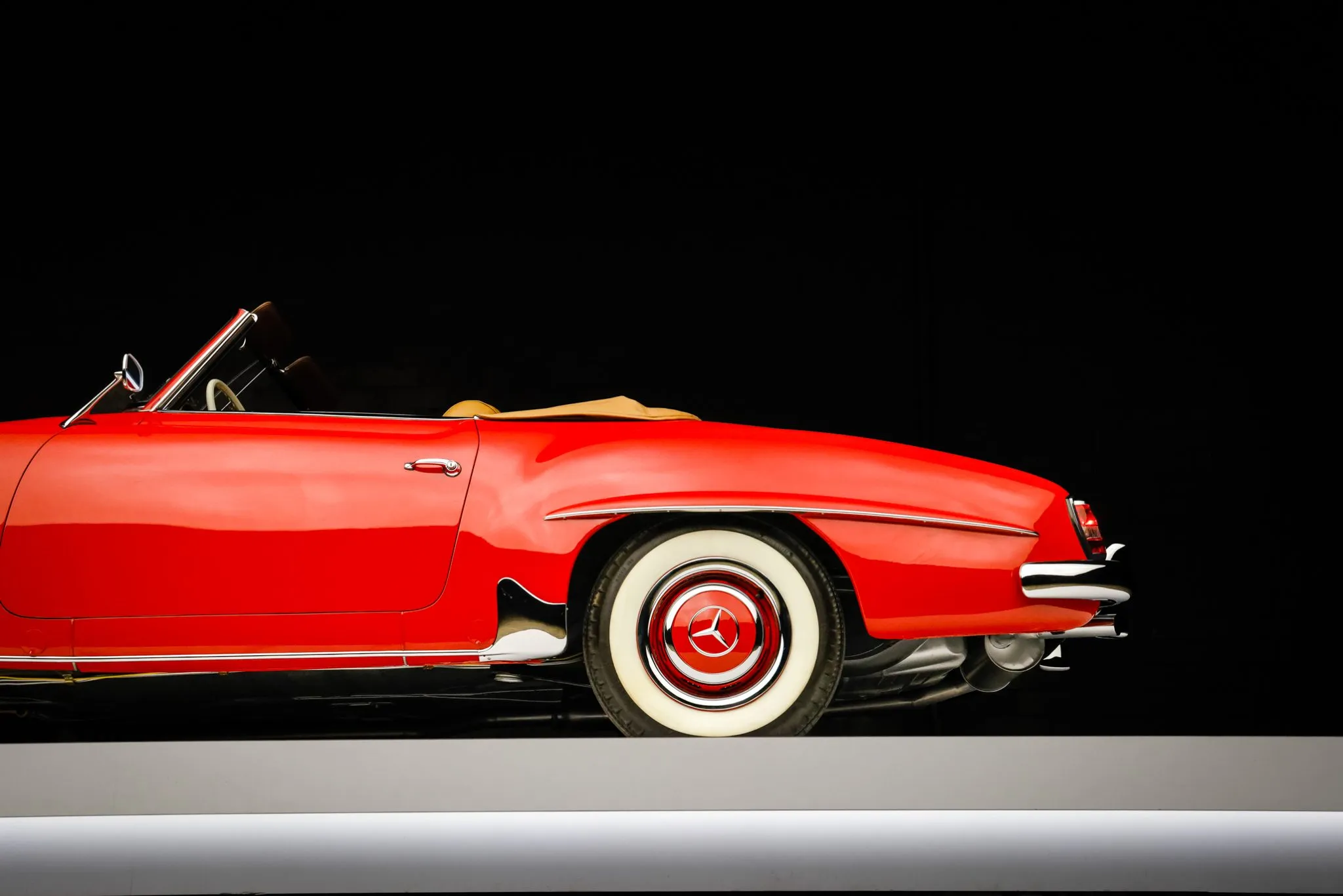 This 1959 Mercedes-Benz 190SL spent time in California prior to a multi-year restoration carried out between 2009 and 2013. Work involved repainting the car red, replacing the tan convertible top, refreshing the tan interior, overhauling the suspension, and rebuilding the 1.9-liter inline-four and four-speed manual transmission. The car has dual Solex carburetors and 13″ steel wheels with body-color hubcaps along with a boot cover and a Becker Europa AM/FM radio. This 190SL is now offered on dealer consignment in California with build sheet copies, manufacturer’s literature, a tool kit, and a clean Montana title.