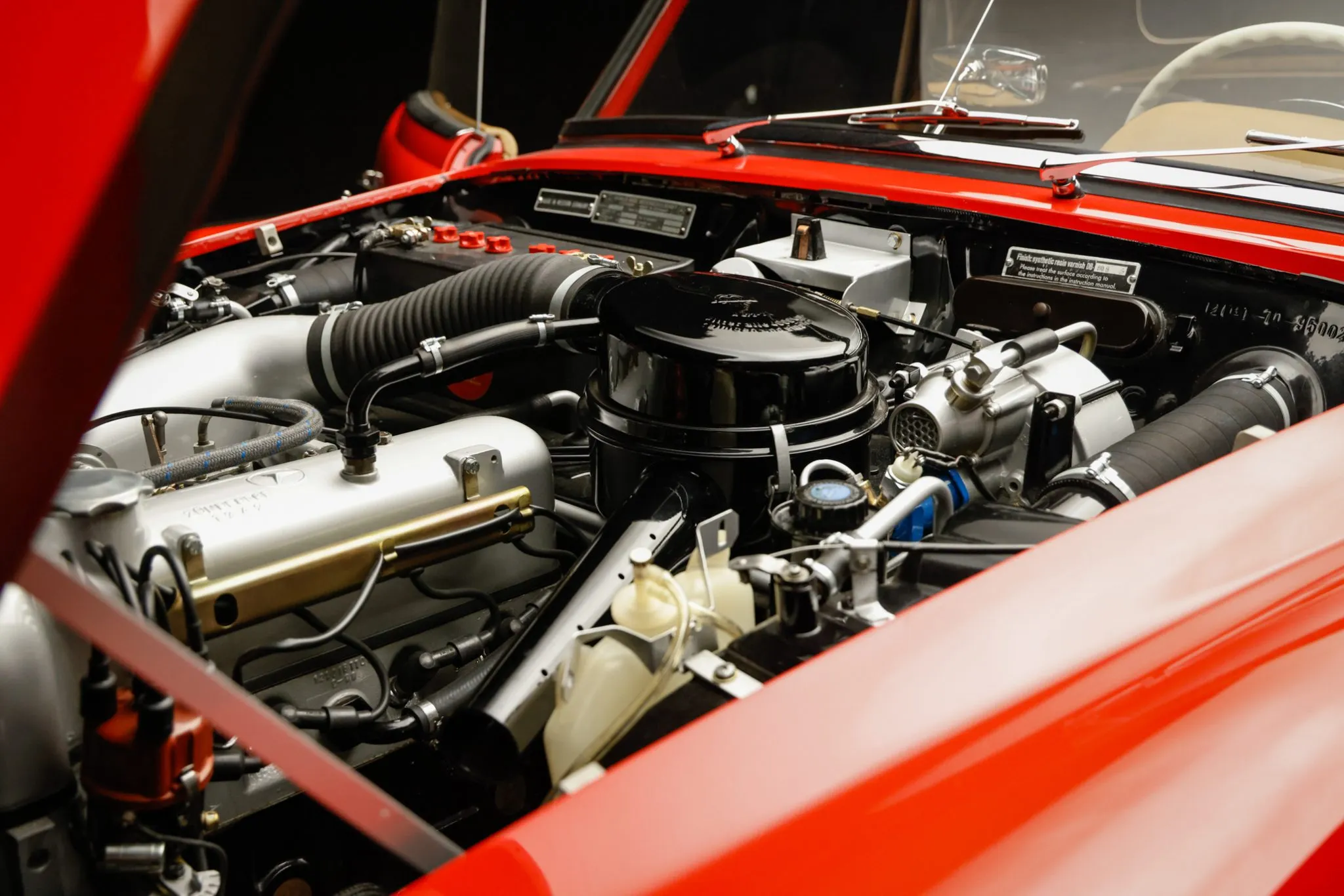 The 1.9-liter M121 inline-four was overhauled under prior ownership and is equipped with Solex PHH 44 carburetors, zinc-plated hardware, and a black-painted air cleaner. Work in 2023 included rebuilding the starter, changing the oil, and replacing the spark plugs, fuel pump, and fuel filter.
