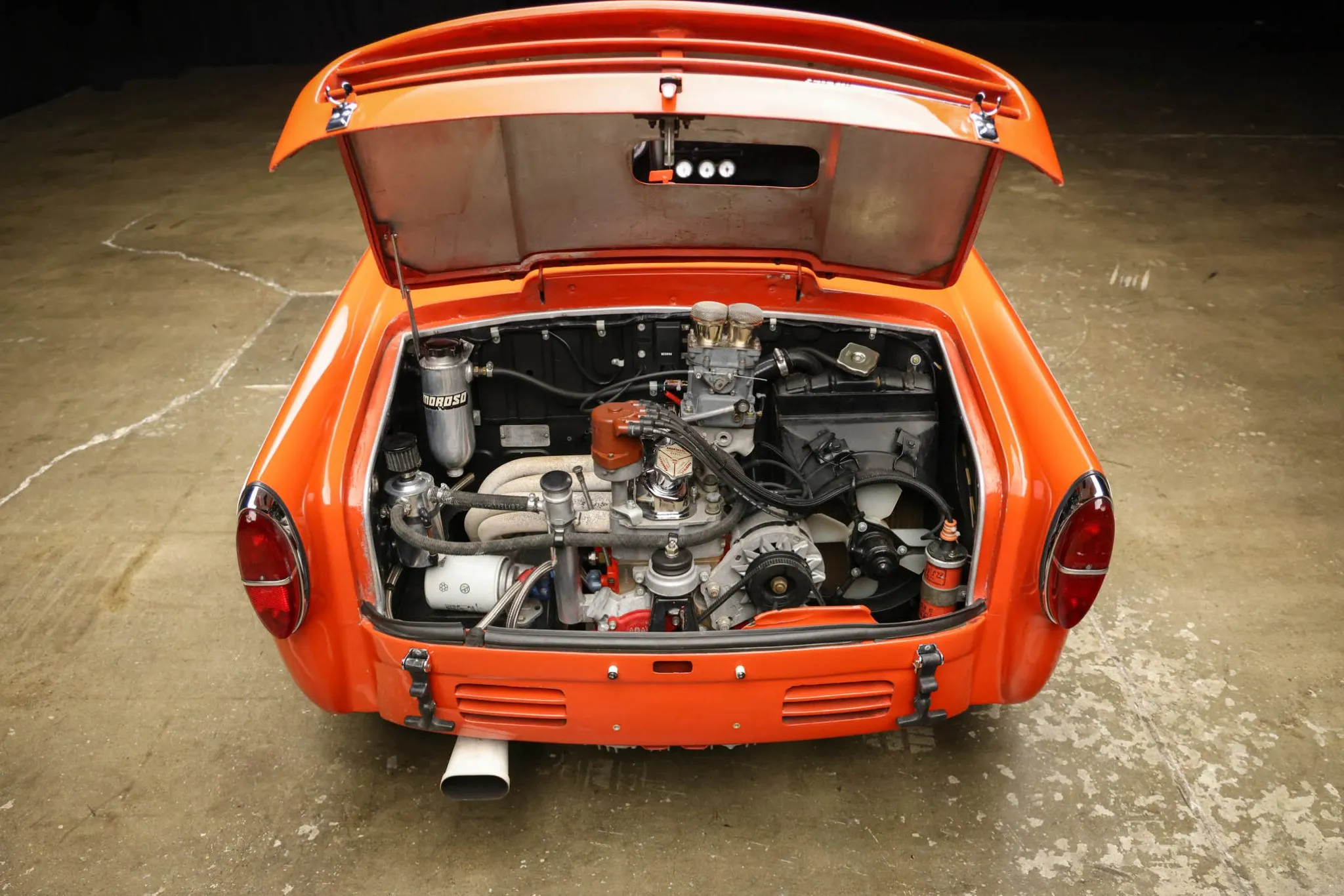The replacement 1.0-liter inline-four is mounted out back and is outfitted with Abarth-branded parts. It sends power to the rear wheels through a four-speed manual transaxle. A single downdraft carburetor protrudes through the rear decklid, while an auxiliary radiator is stored in the front trunk compartment. The selling dealer recommends carrying out race preparations prior to track use.