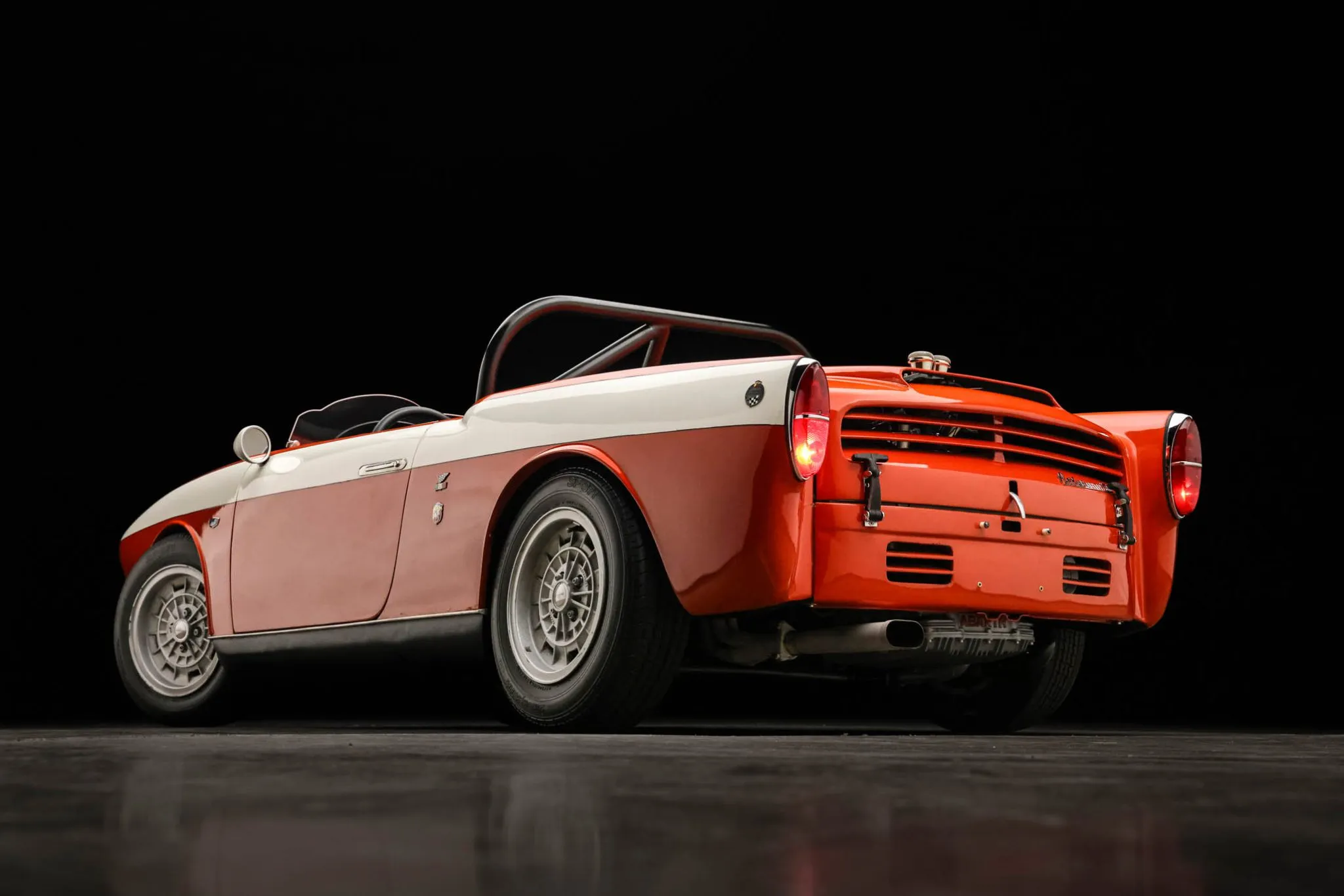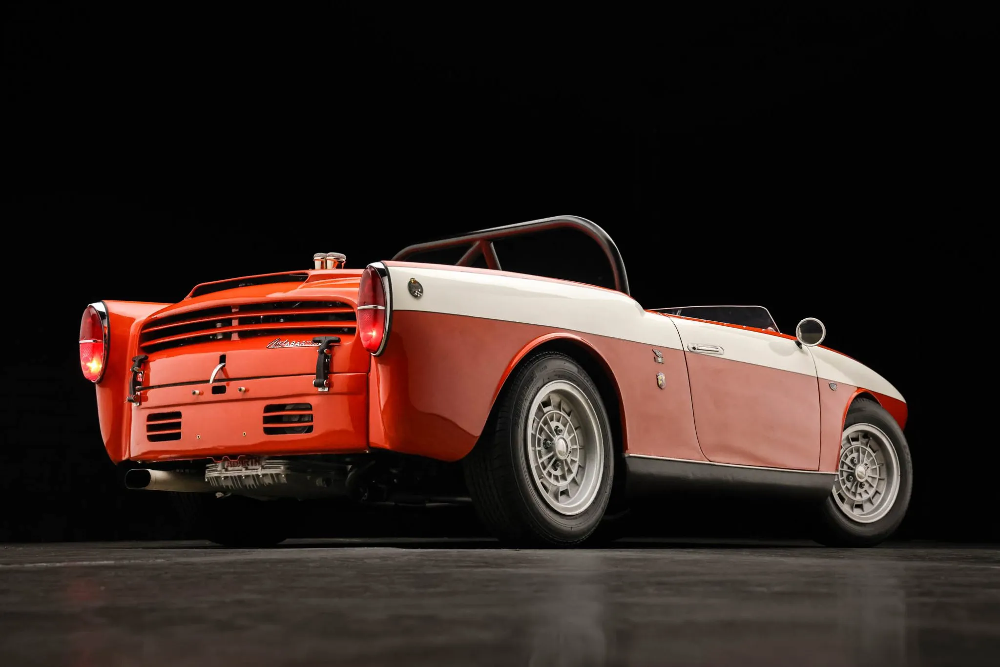 This 1960 Fiat-Abarth 750 GT Spider features bodywork by Carrozzeria Allemano of Turin, Italy, over Fiat 600 underpinnings. Chassis 615921 was modified for racing, including the installation of a cut-down windshield, and was campaigned in US racing events before eventually making its way to Europe. It was later owned by a descendant of Giovanni Bertone before being relocated back to the US. Power is supplied by a 1.0-liter inline-four mounted at the rear and outfitted with a single downdraft carburetor, while shifting is via a four-speed manual transaxle. It has been refinished in red with white stripes and rides on 13″ Campagnolo wheels. Inside, fixed-back bucket seats trimmed in black upholstery are accompanied by multi-point harnesses and a roll bar. This Allemano 750 GT Spyder was sold on BaT in May 2025 and was later acquired by the selling dealer. It is now offered in Newbury Park, California, with a bill of sale.