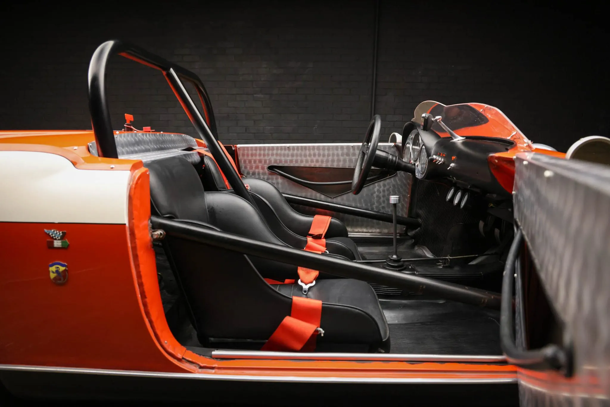 The cockpit houses fixed-back bucket seats trimmed in black vinyl with multi-point harnesses. The roll bar incorporates door bars, and a row of vehicle control switches is mounted on the black dashboard. Engine-turned metal trim adorns the door panels and instrument surround, while black rubber linings cover the floors.