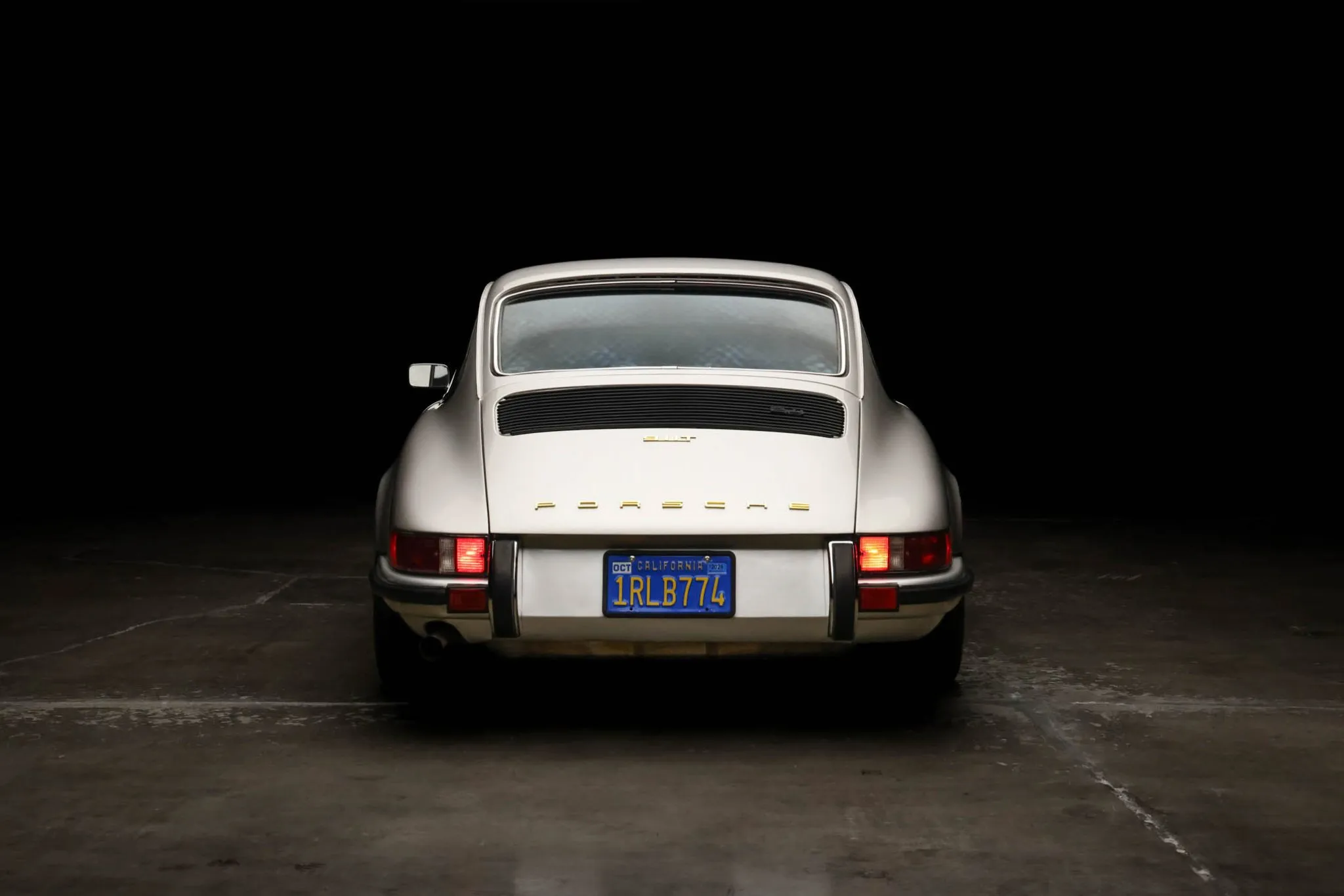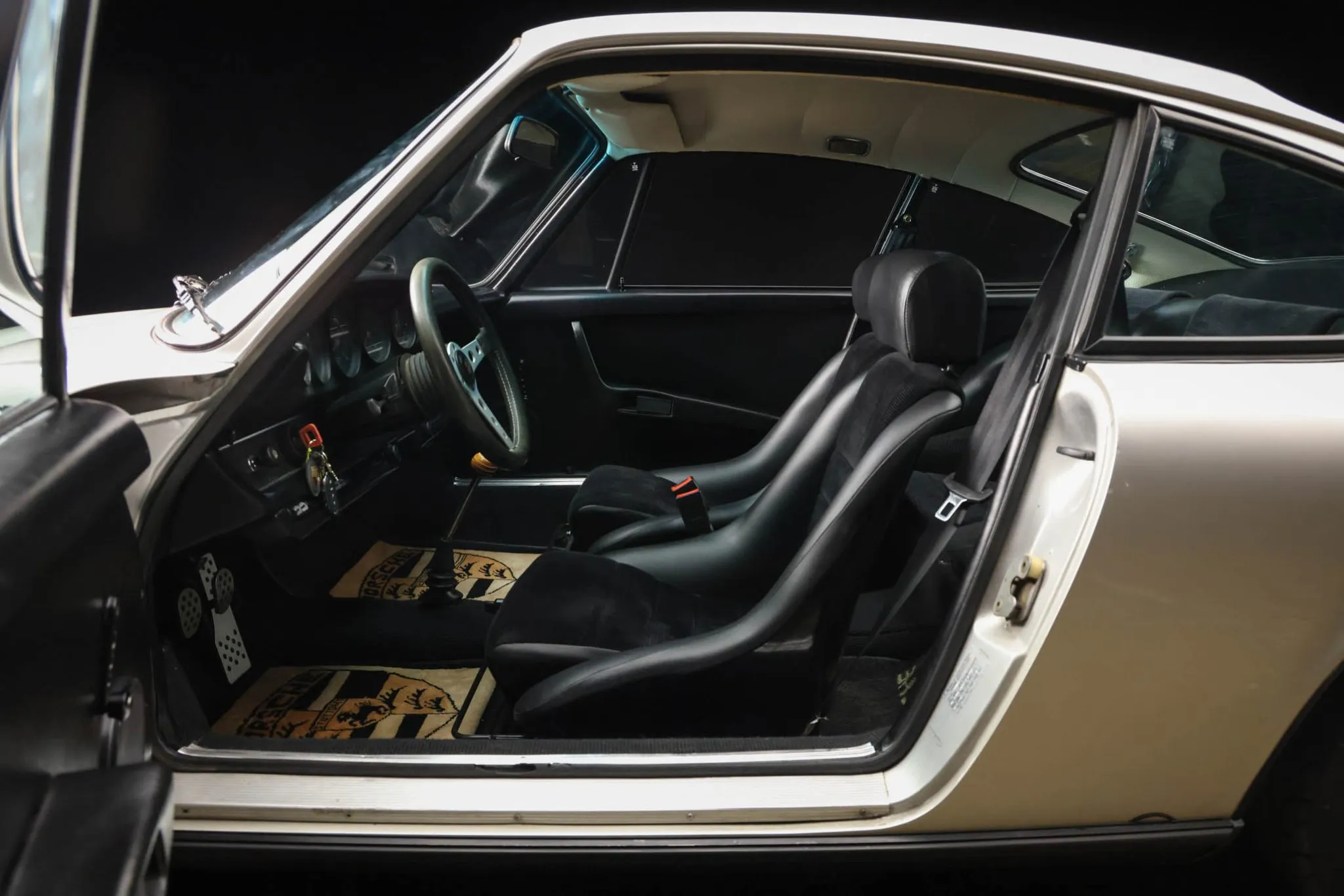 The aftermarket fixed-back bucket seats and fold-down rear seats are upholstered in black leather and corduroy, and interior appointments include squareweave carpets, drilled window cranks, Focal door speakers, a Porsche Classic navigation radio, three-point seatbelts, drilled pedals, air conditioning, Porsche crest floor mats, a 917-style wood shift knob, and a heater.