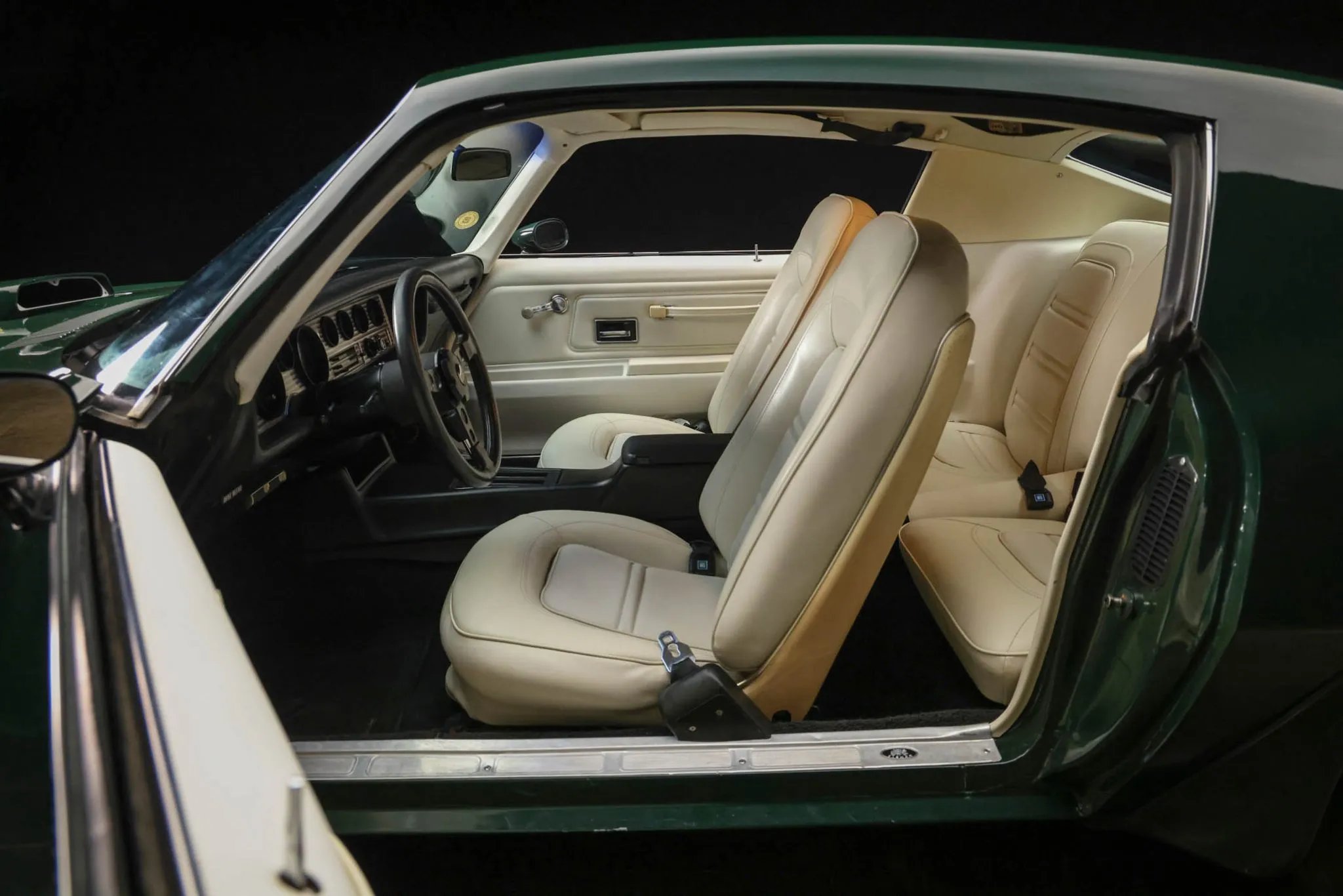 This 1973 Pontiac Firebird Trans Am is one of 4,802 examples produced for the model year and was acquired by the current owner on BaT in March 2024. The car is powered by a 455ci V8 mated to a Turbo Hydra-Matic three-speed automatic transmission and is finished in Brewster Green over white vinyl. Equipment includes a shaker hood, a Trans Am hood decal, 15″ Rally II wheels, power-assisted brakes, power steering, front bucket seats, an AM/FM radio, and air conditioning. This Firebird Trans Am is now offered on dealer consignment with a California title.
