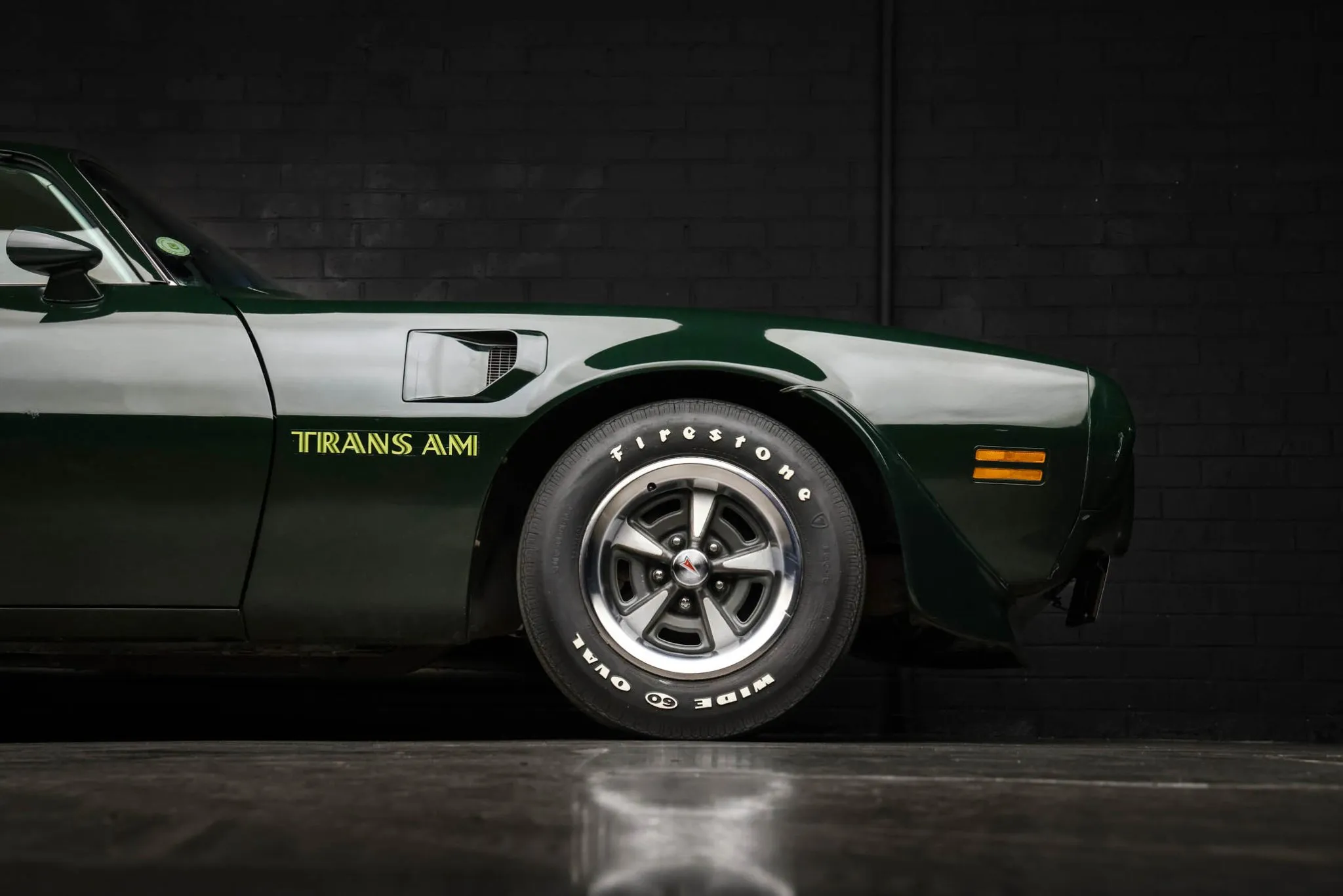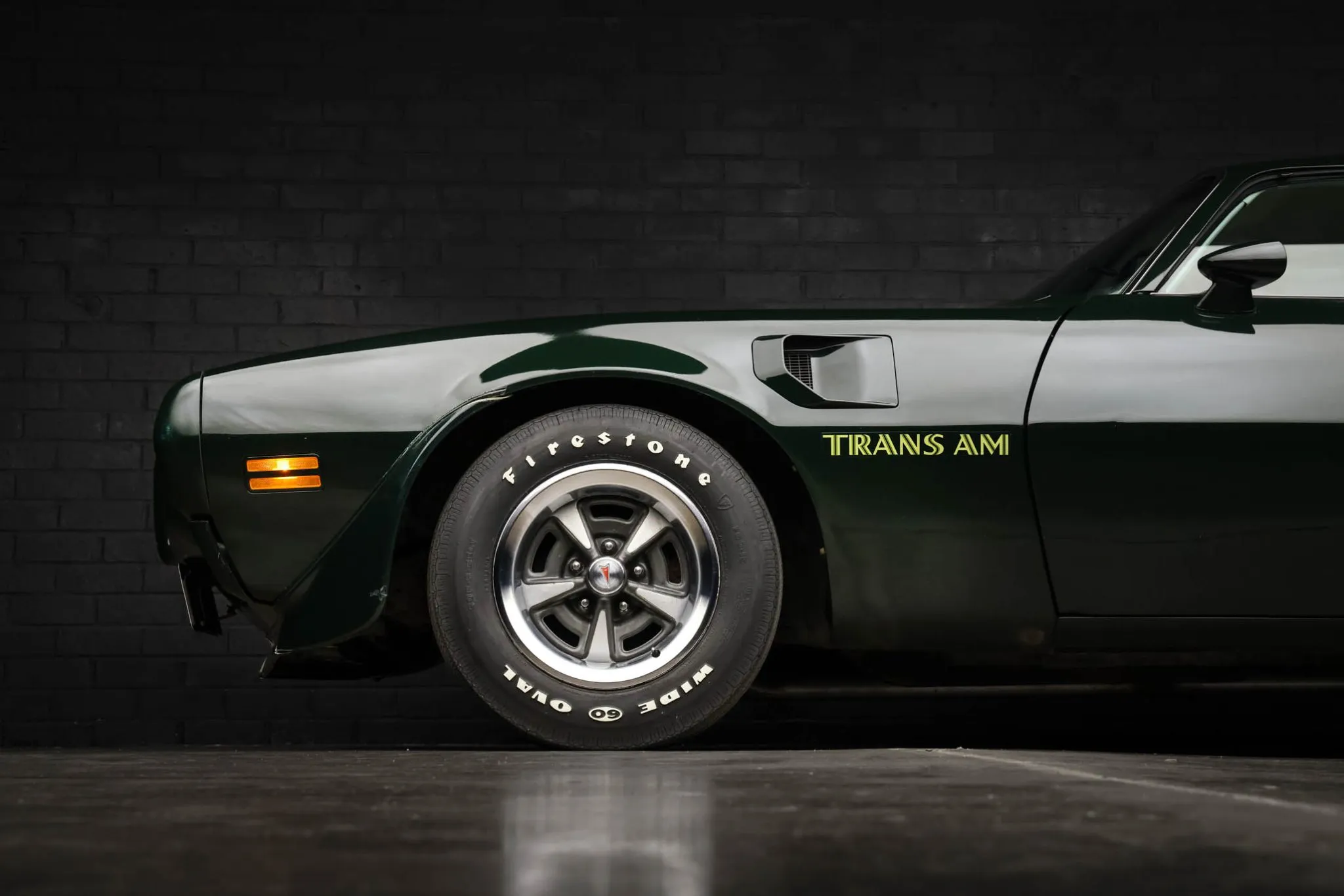 The car was finished at the factory in Brewster Green (M), and exterior equipment includes a shaker hood, a front air dam and spoiler, front fender vents, a Trans Am hood decal, bright trim, a rear decklid spoiler, and dual exhaust outlets. Paint and body blemishes are displayed in the gallery.