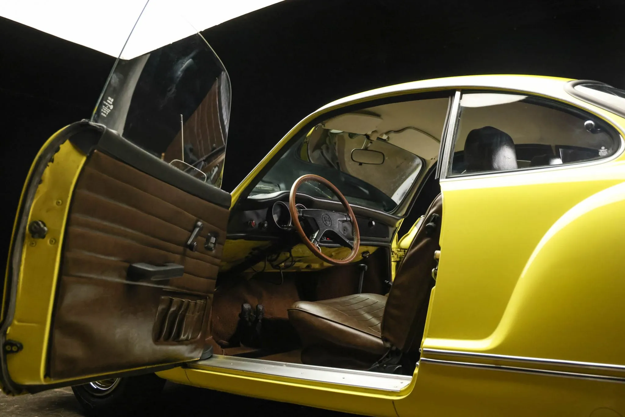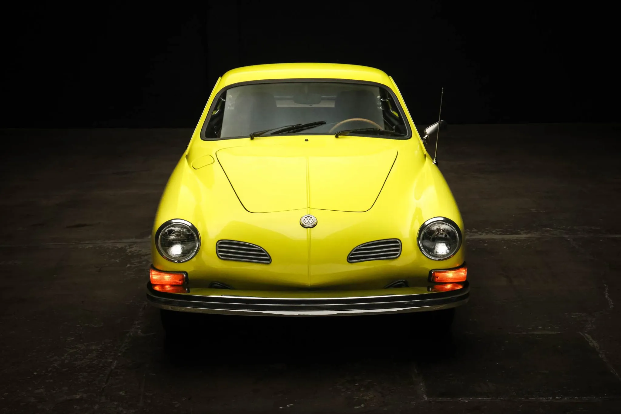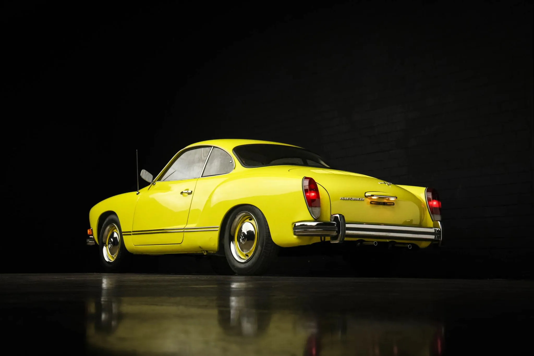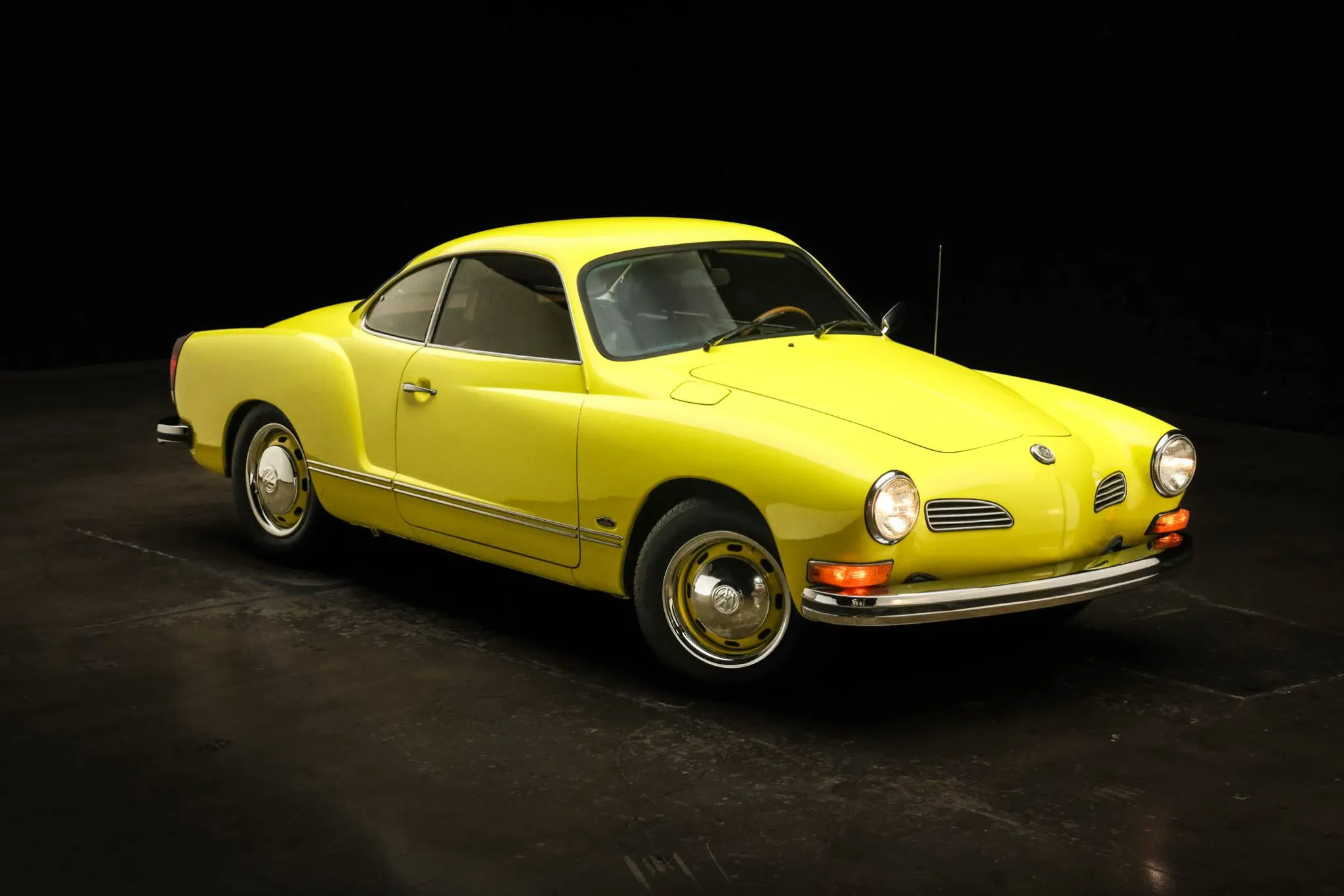 This 1974 Volkswagen Karmann Ghia coupe is finished in Saturn Yellow over brown leatherette upholstery and is powered by an air-cooled 1.6L flat-four paired with a four-speed manual transaxle. The car rides on body-color 15″ steel wheels and is further equipped with front disc brakes, a left side mirror, halogen headlights, a push-button AM/FM radio, and VDO instrumentation. This Karmann Ghia coupe is now offered on dealer consignment at no reserve with a California title.