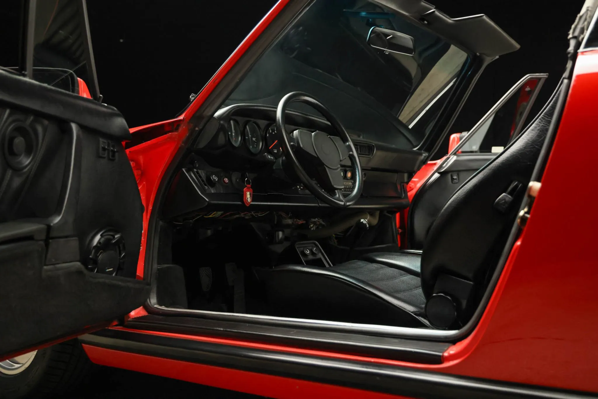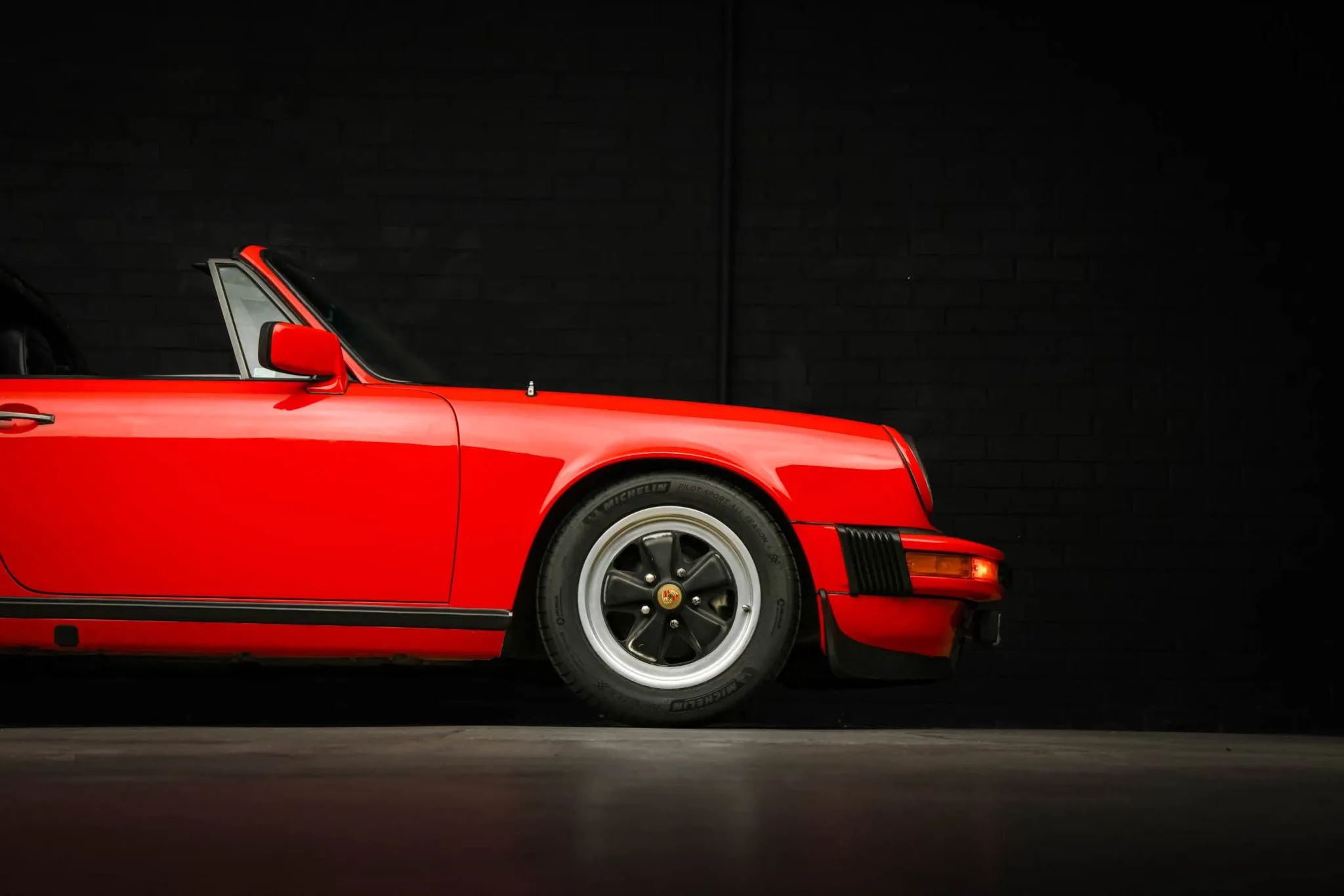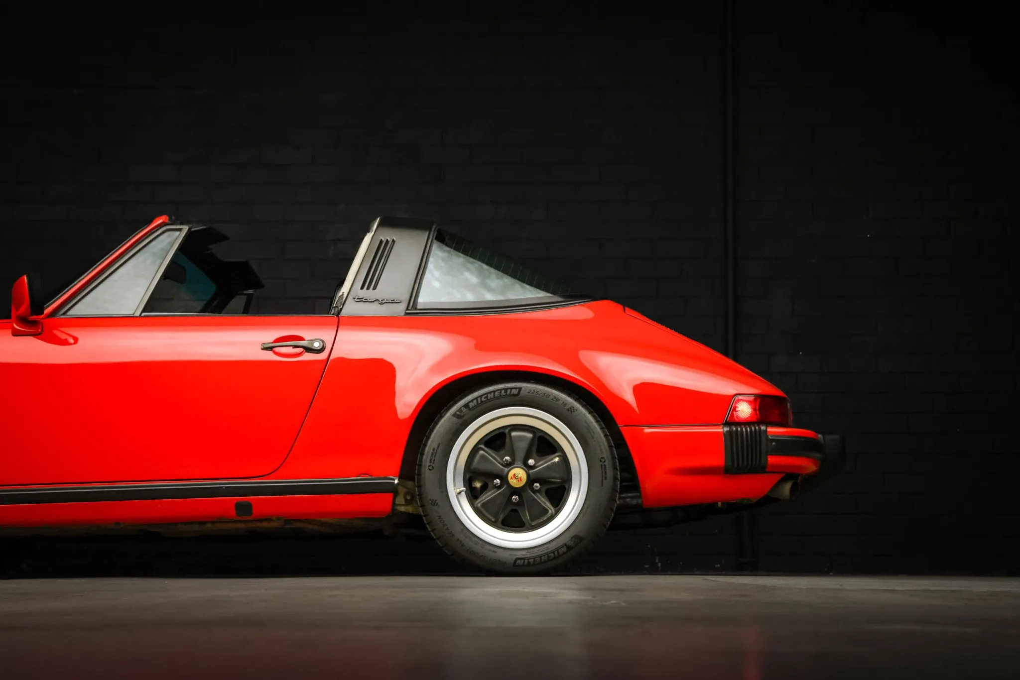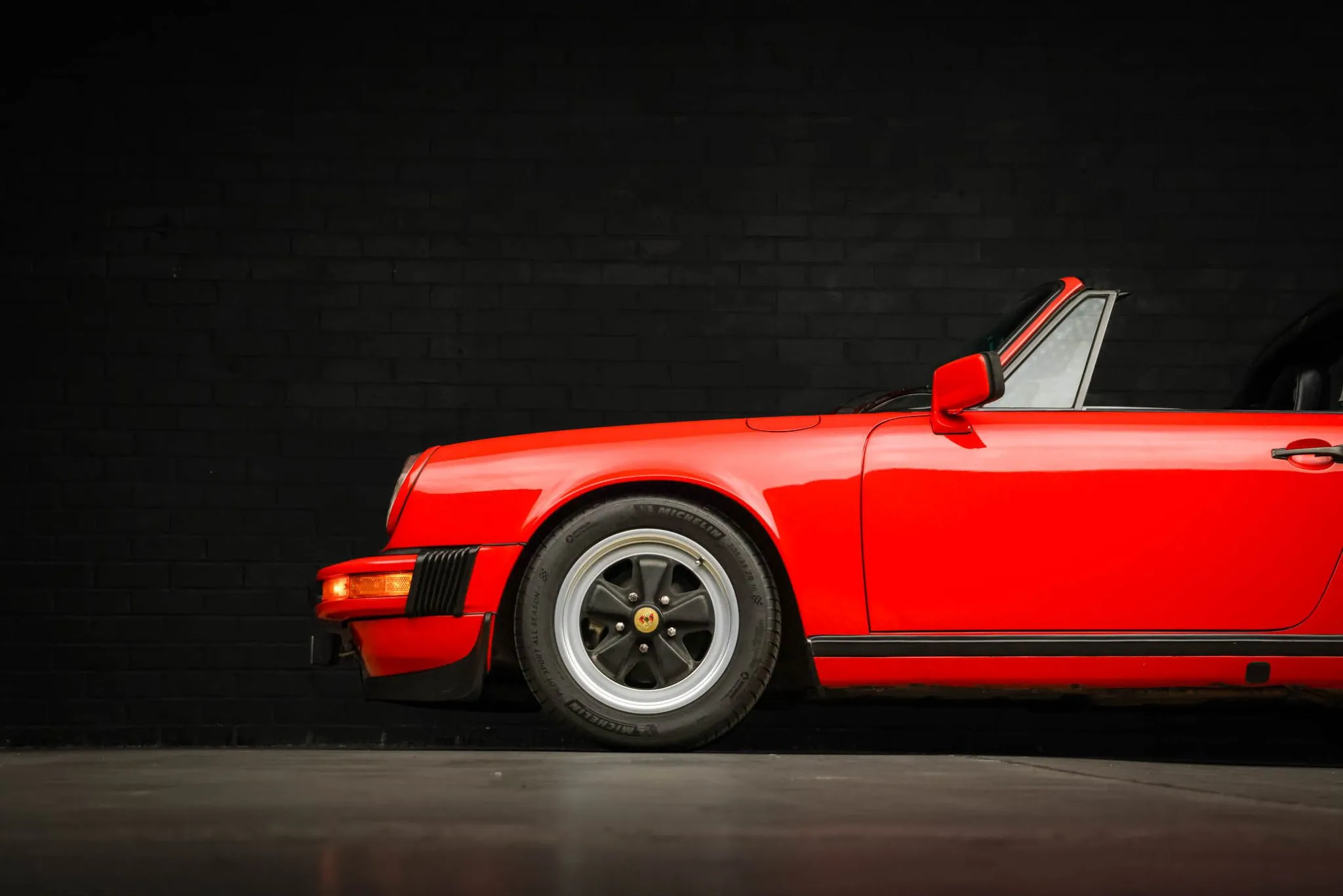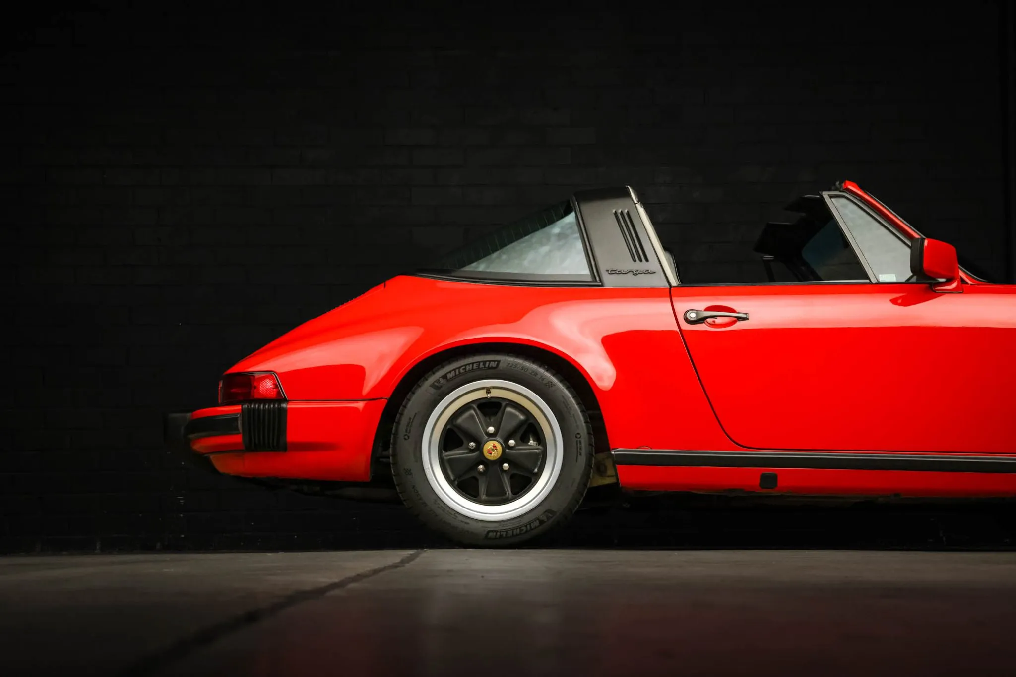 The car was factory-finished in Guards Red (027) and was repainted under prior ownership. Exterior details include body-color mirror caps, a black Targa bar and removable roof panel, and fog lights as well as a power antenna, a heated rear window, and rear bumperettes.