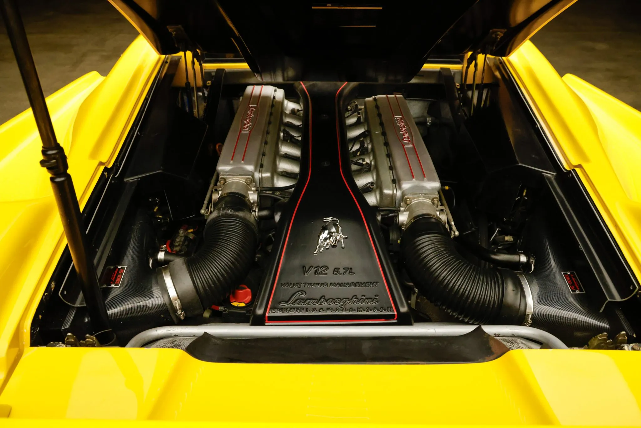 The 5.7-liter V12 features electronic multi-point fuel injection, dual overhead camshafts, and four valves per cylinder. Factory rated output was 492 horsepower and 428 lb-ft of torque. A replacement exhaust manifold, coolant temperature sensor, and valve cover gasket were installed in June 2019, while work in November 2021 involved fitting a replacement ignition relay and aftermarket engine bay panels.