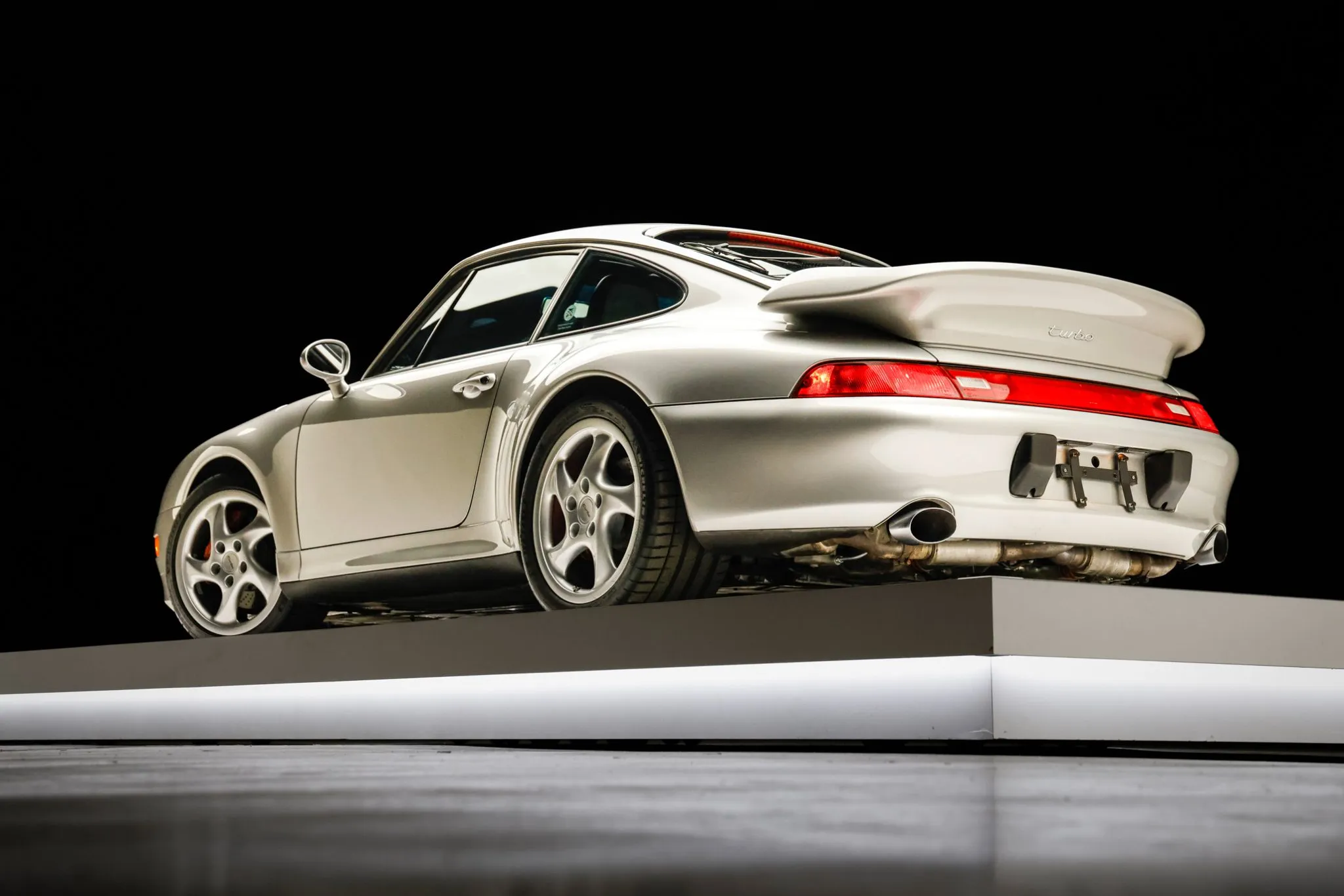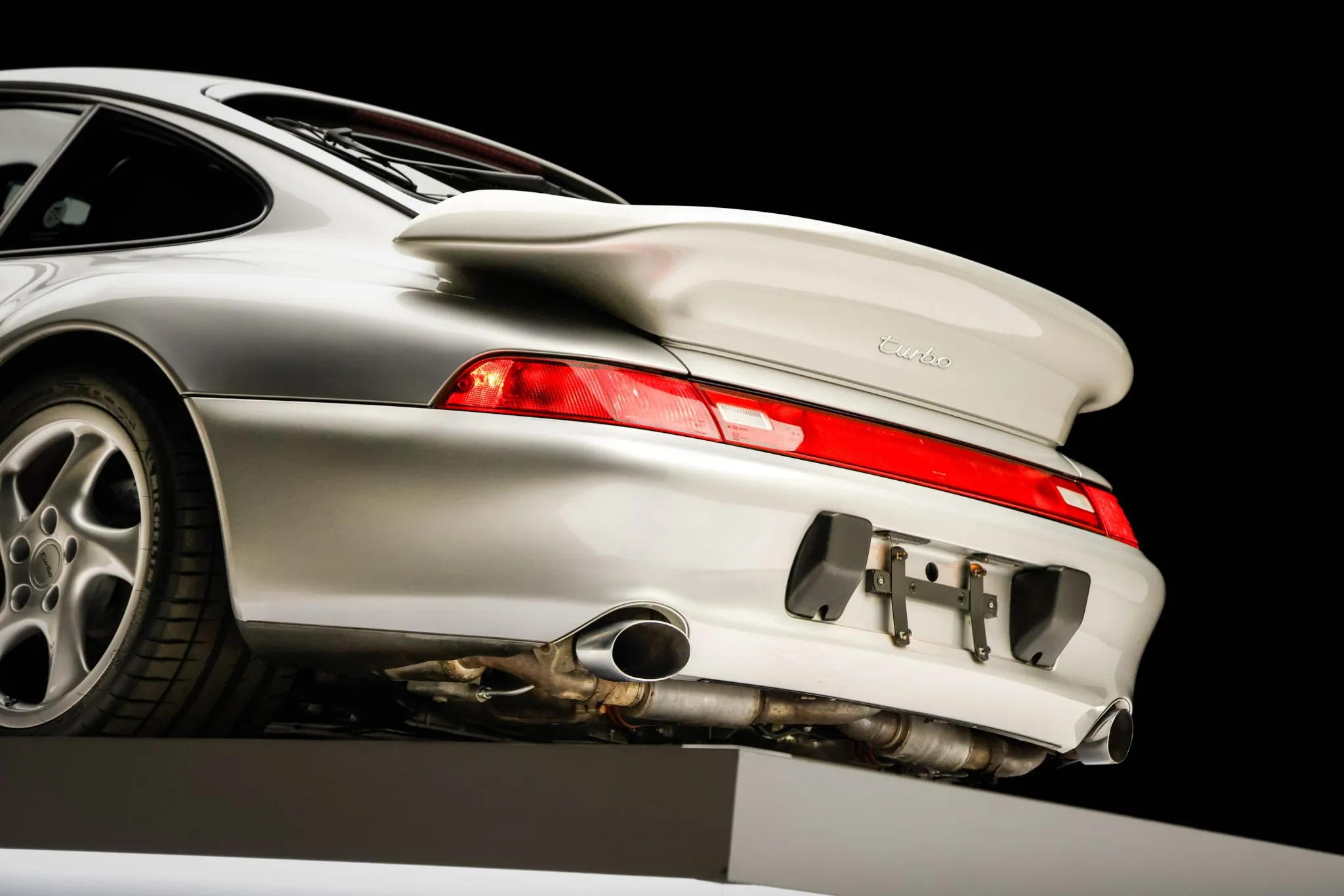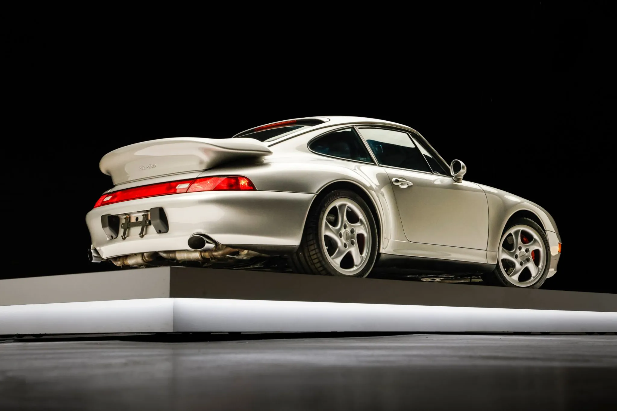 The 993 Turbo featured wider bodywork, revised bumper covers, and a fixed rear spoiler to accommodate top-mount intercoolers when compared with the standard 993 coupe. This example is finished in Arctic Silver Metallic (92U) and features xenon headlights with washers, integrated fog lights, and polished exhaust outlets. Close-up photographs of the exterior finish and trim are shown in the gallery below.