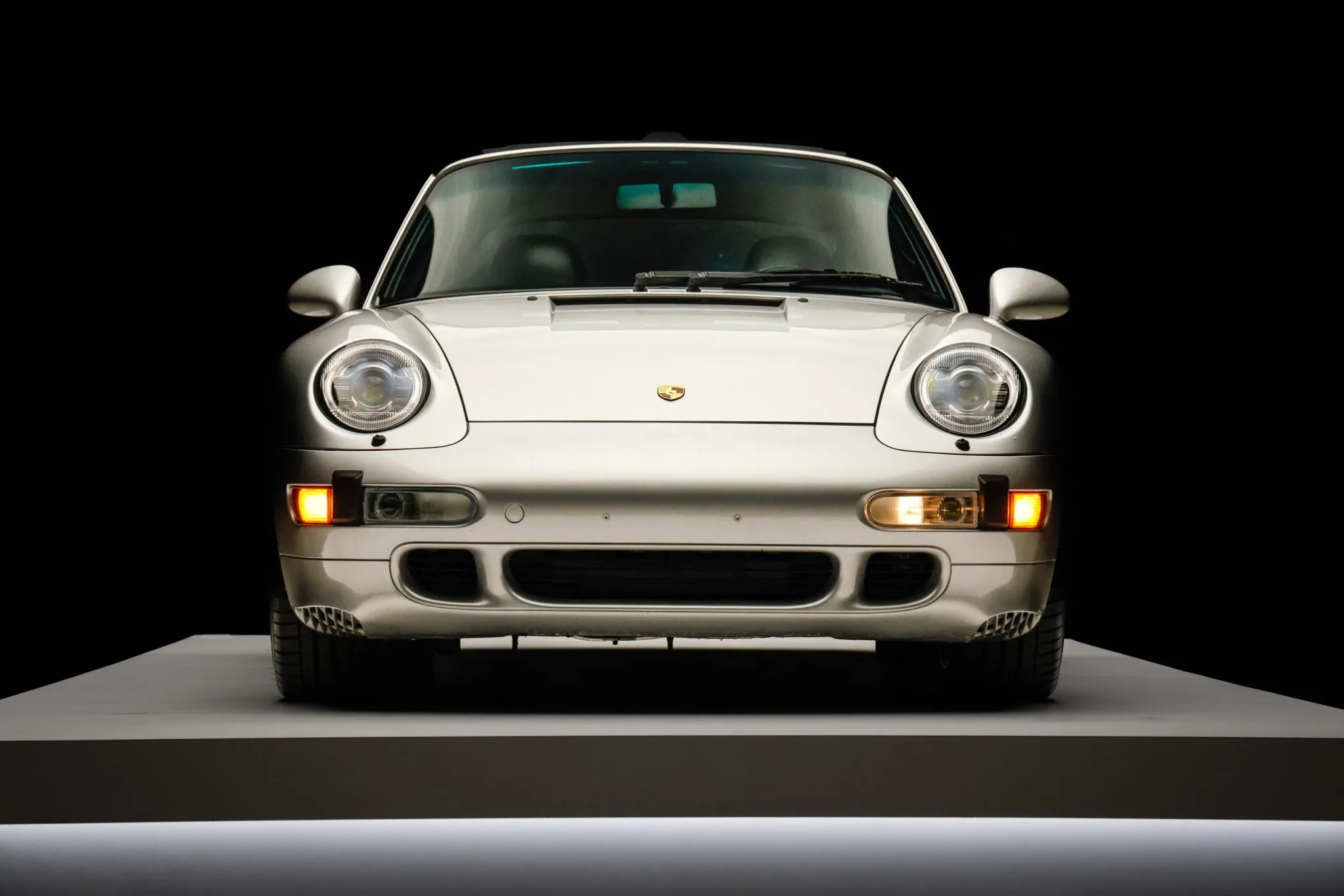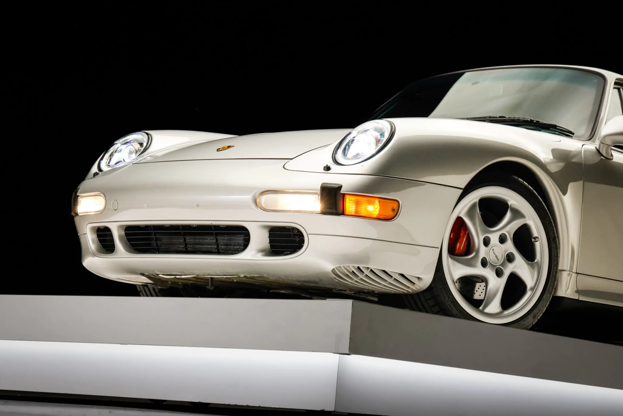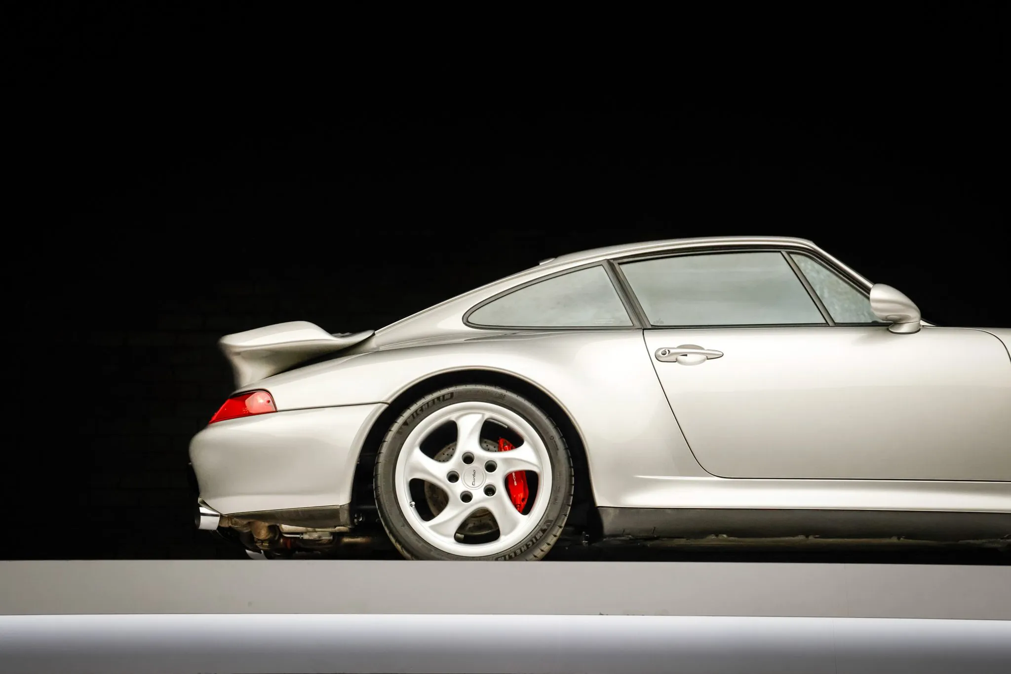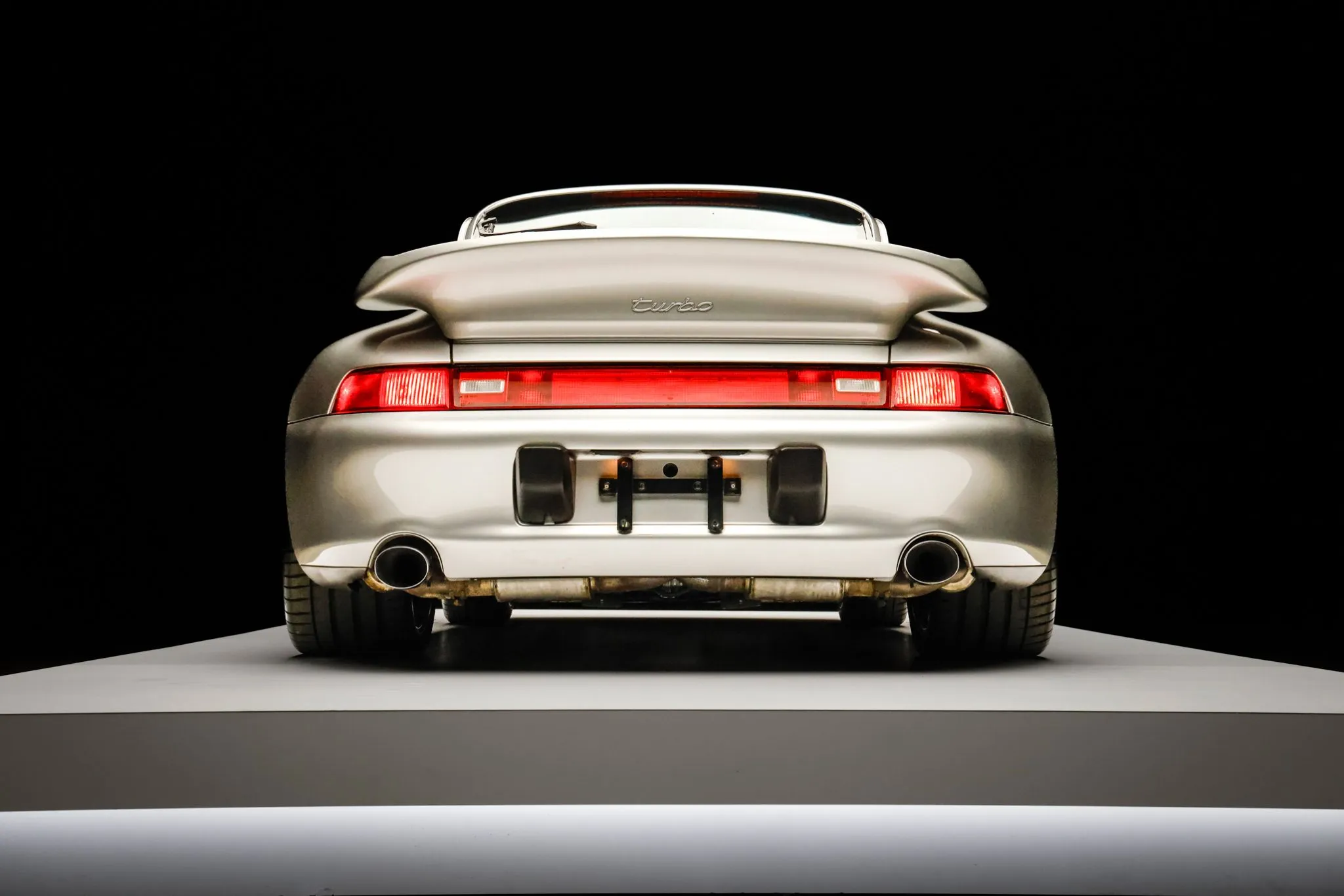 The 993 Turbo featured wider bodywork, revised bumper covers, and a fixed rear spoiler to accommodate top-mount intercoolers when compared with the standard 993 coupe. This example is finished in Arctic Silver Metallic (92U) and features xenon headlights with washers, integrated fog lights, and polished exhaust outlets. Close-up photographs of the exterior finish and trim are shown in the gallery below.