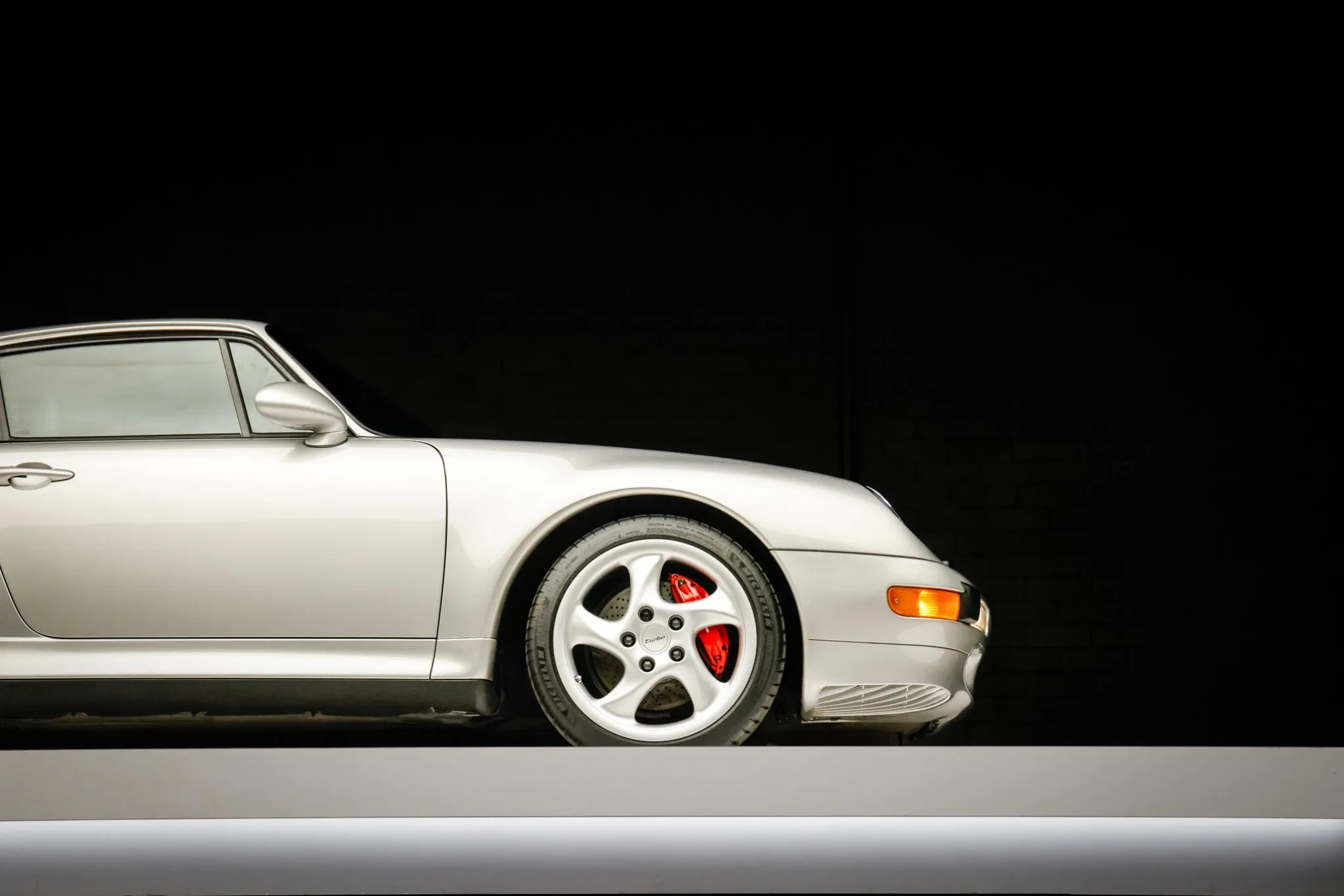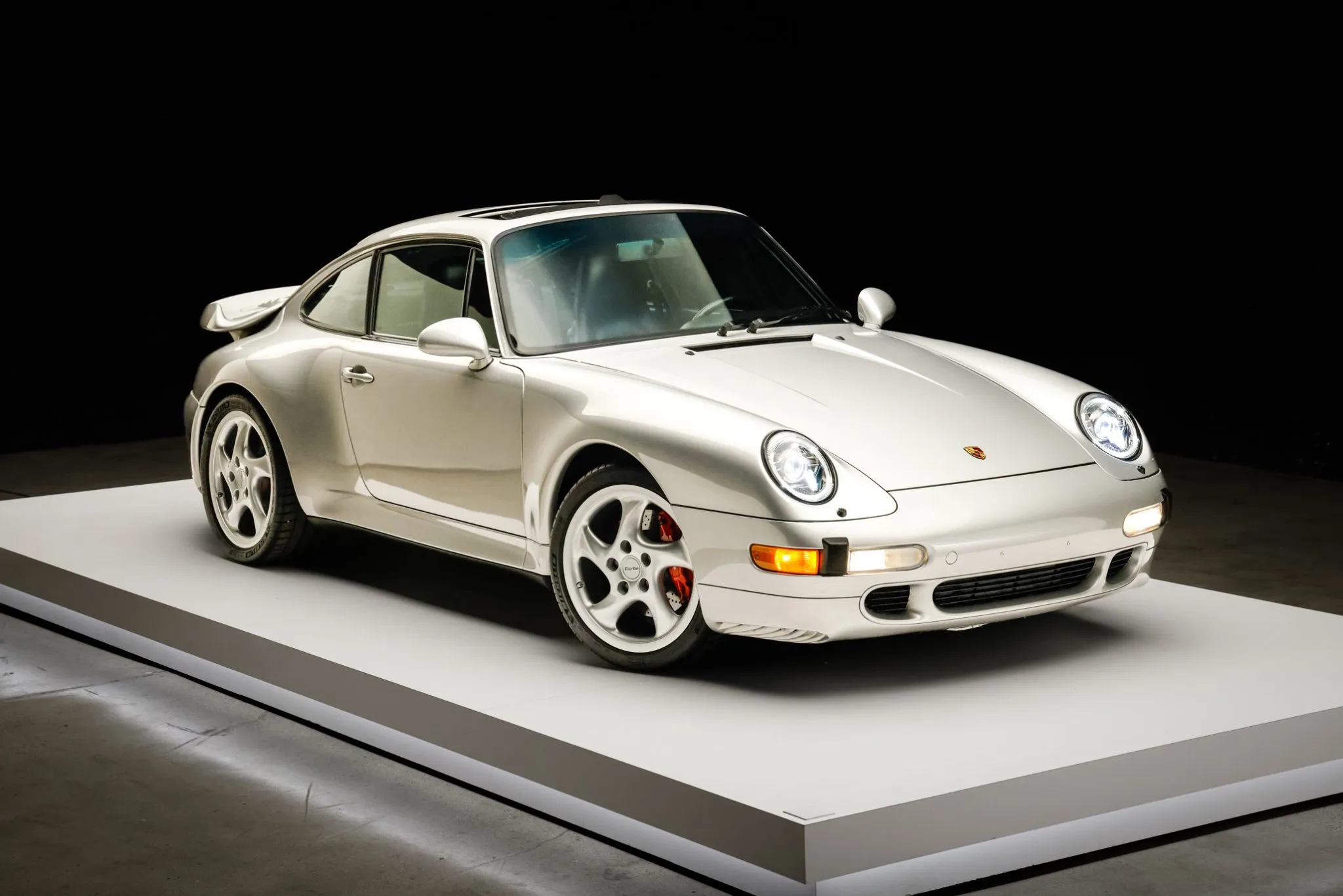 The silver-finished 18″ Turbo Twist wheels are mounted with Michelin Pilot Sport tires. The car features an Automatic Brake Differential (ABD), and the 993 was the first 911 to feature multi-link rear suspension. Braking is provided by red Porsche-branded four-piston calipers over cross-drilled rotors.