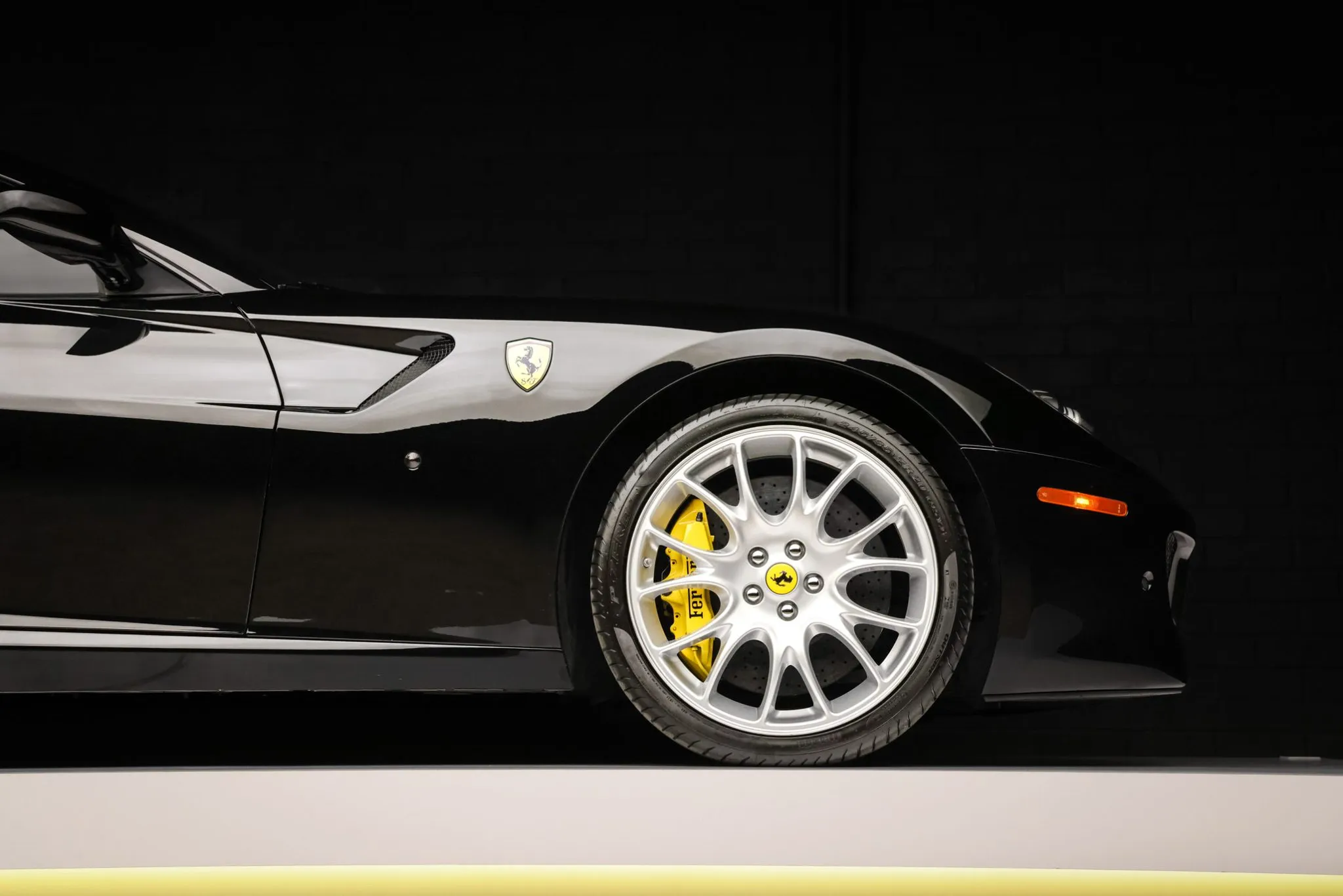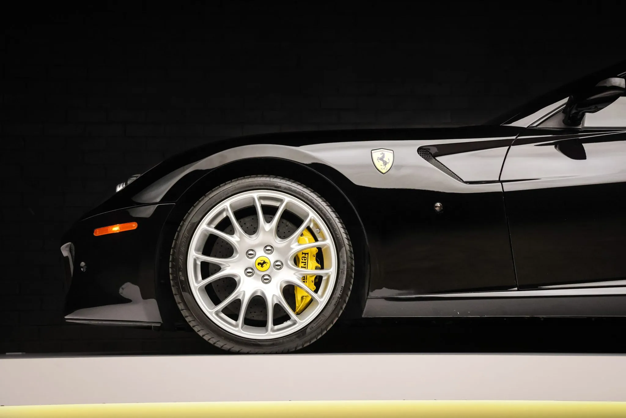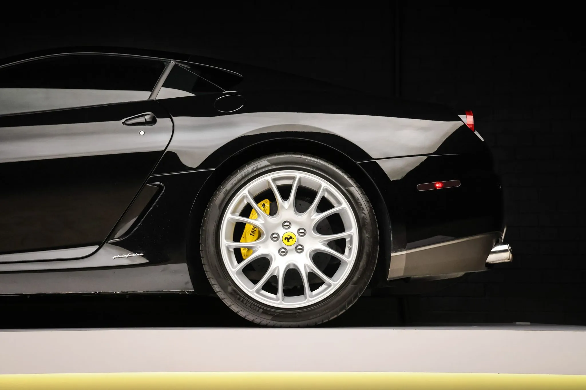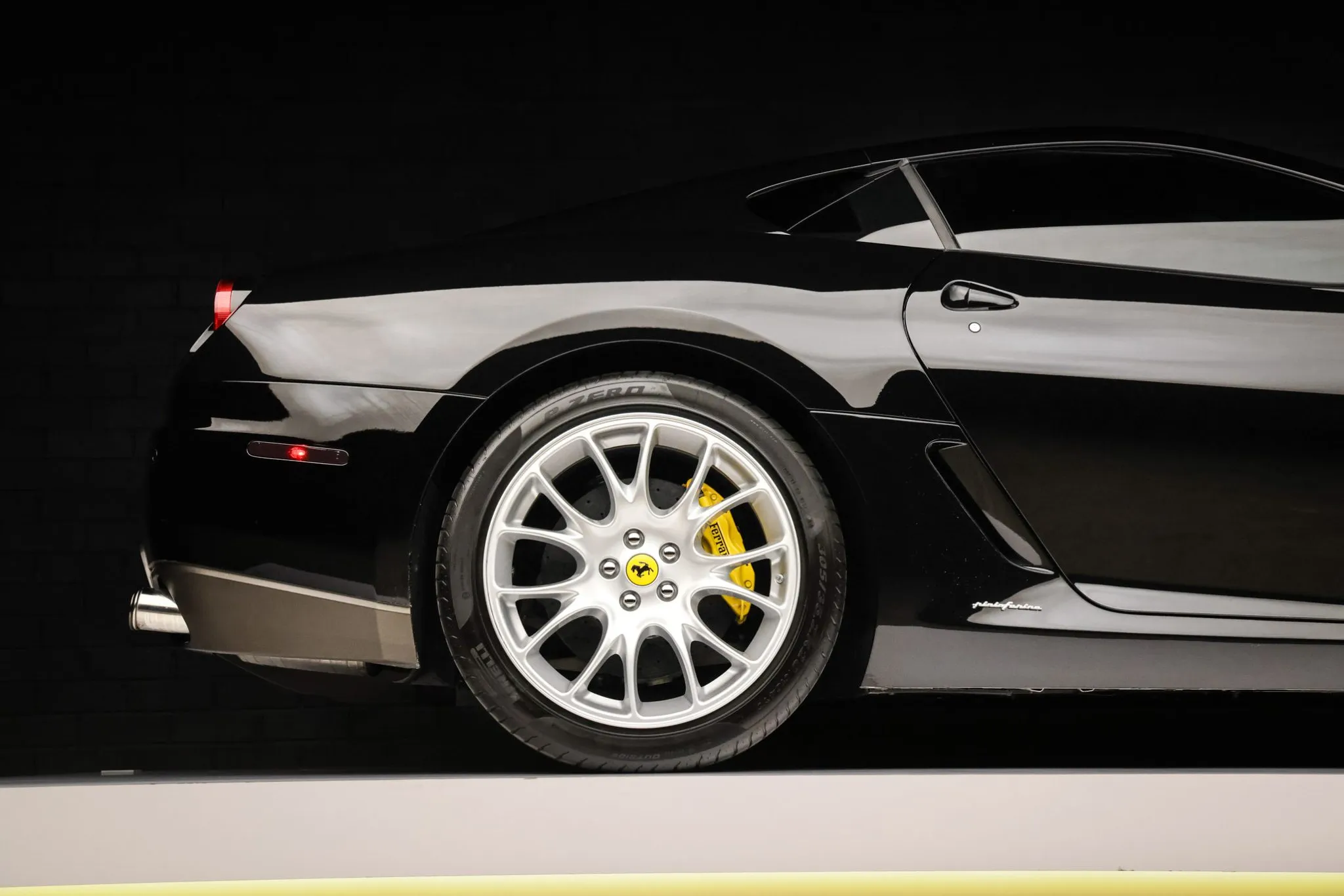 The 20″ Challenge alloy wheels are mounted with 245/35 front and 305/35 rear Pirelli P Zero tires. The suspension features magnetorheological dampers. Stopping power is provided by Ferrari-branded multi-piston brake calipers over cross-drilled and ventilated rotors at each corner.