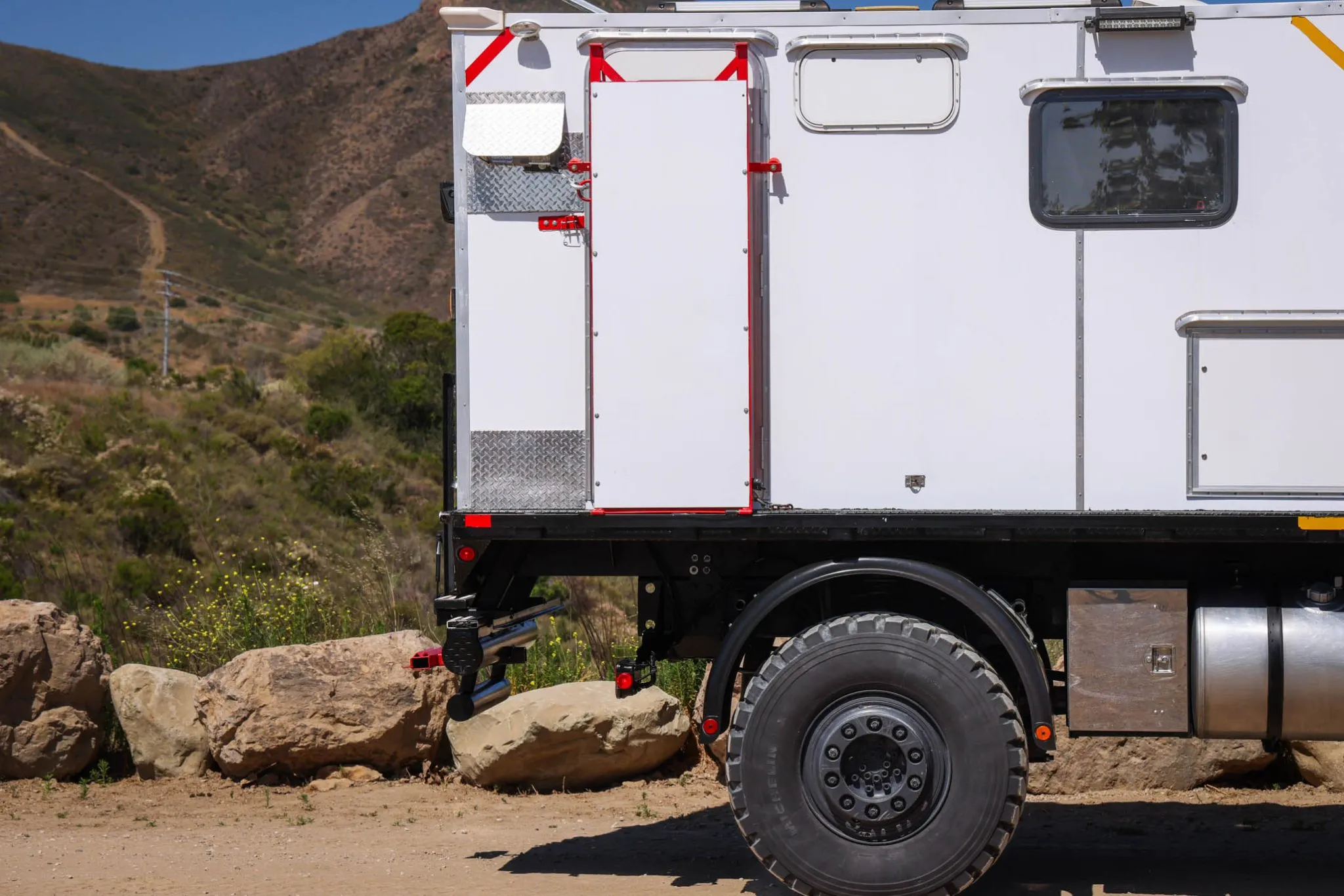 Black-finished 20″ steel wheels are mounted with 395/85 Michelin X tires, while a spare is secured to a hoist system behind the cab. Stopping power is from air-actuated brakes.