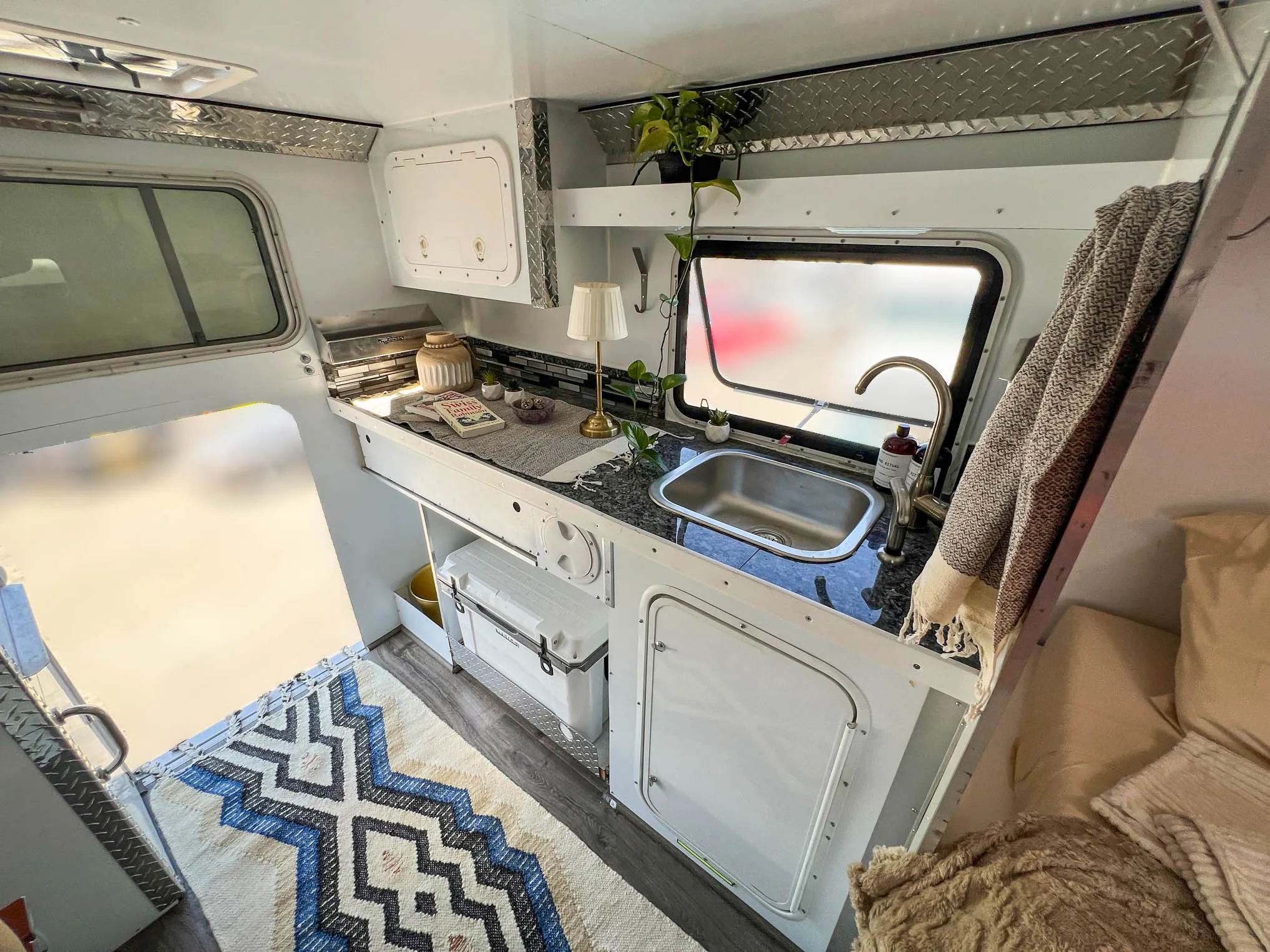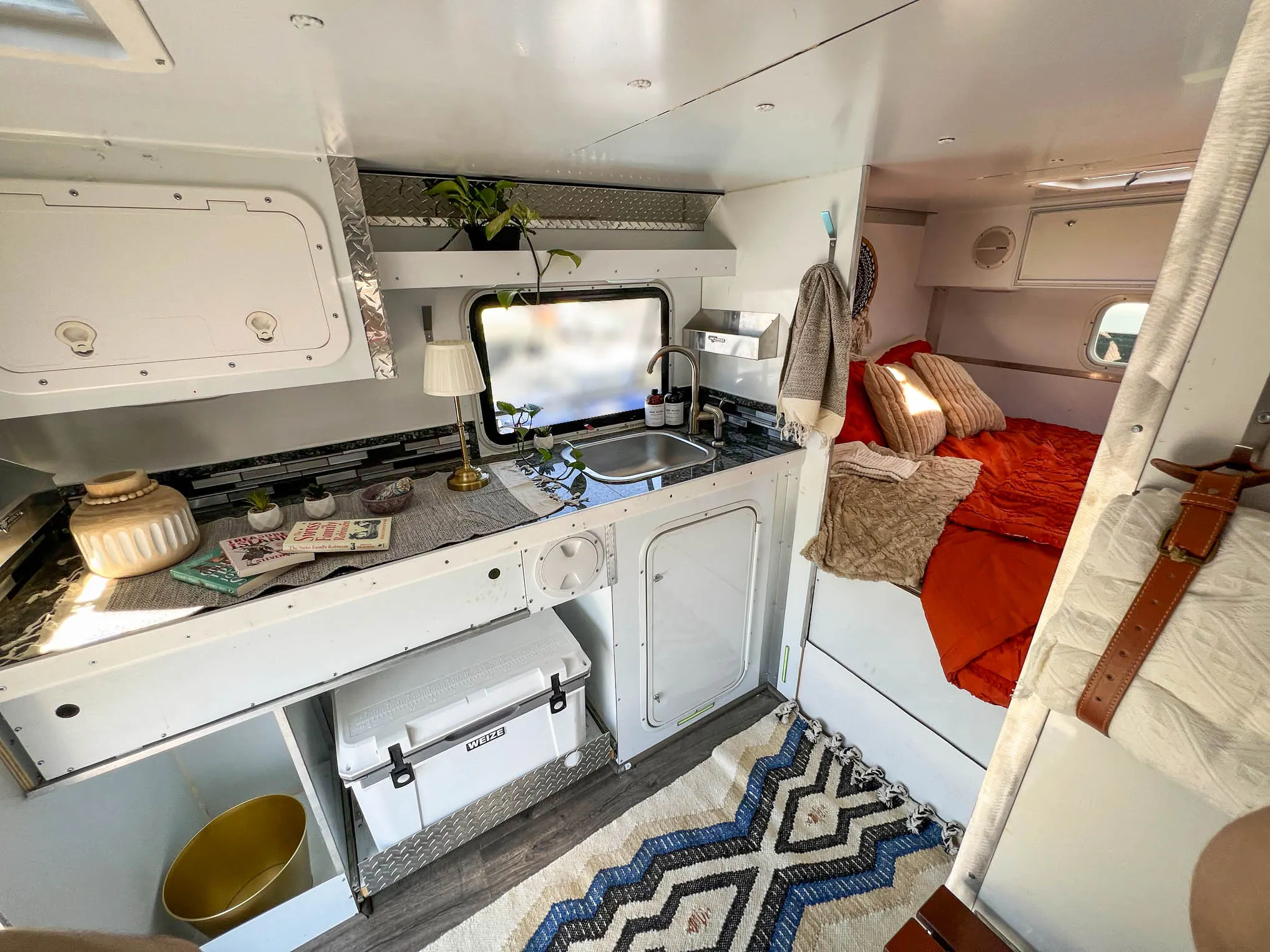The sleeping compartment is furnished with a memory foam mattress, a ceiling vent, a polished shelf, and a hinged window with a screen.