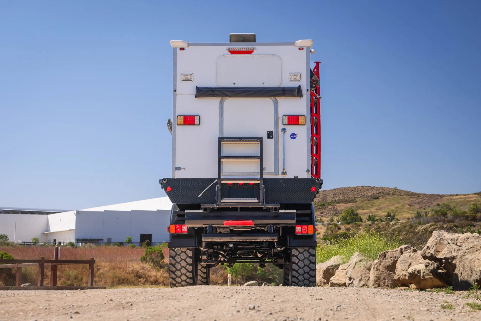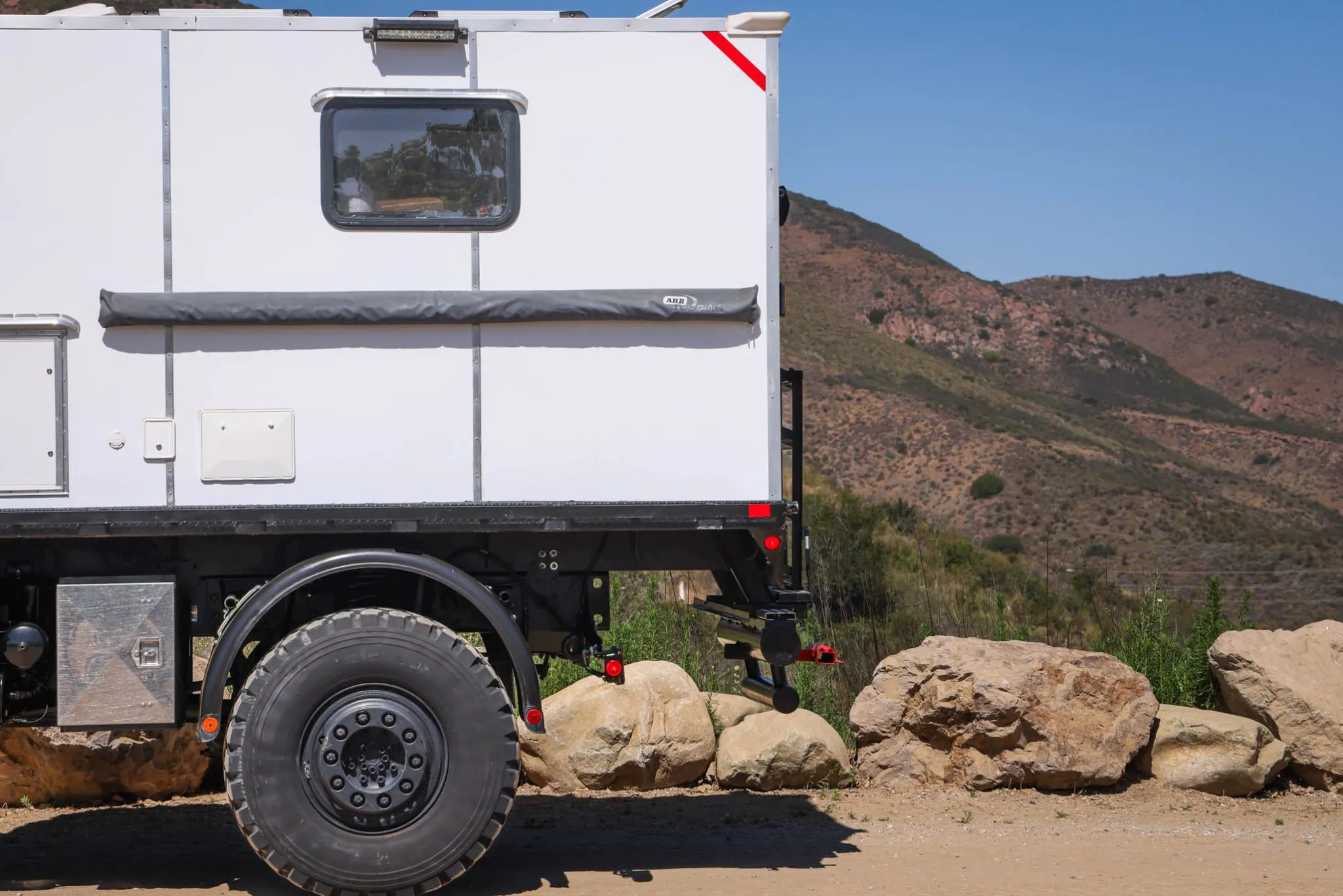 The vehicle is finished in white with black wheel arch trim. Fabricated bumpers are fitted, and other equipment includes clearance lights, towing mirrors, side steps, a polished fuel tank, and front and rear receiver hitches. The camper cabin has a rear entry door accompanied by folding steps, while the right-side entry door is accessed via stairs that can be raised and lowered via a power-operated winch. Equipment includes rooftop solar panels, underbody equipment boxes, a freshwater inlet, and a compressed air outlet aft of the left door. The windshield wipers were recently replaced.
