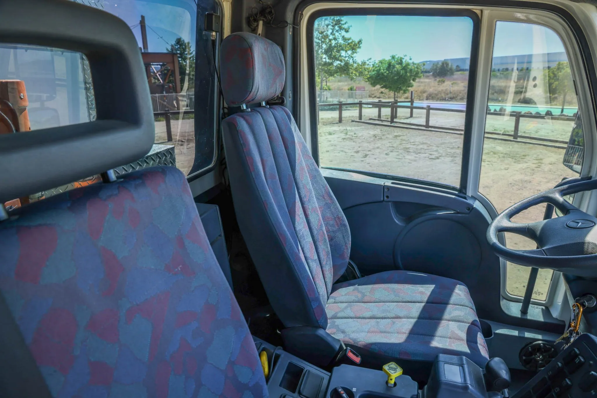 The cab houses a driver’s seat and a pair of passenger seats trimmed in gray patterned cloth. A Lowrance GPS receiver is mounted atop the dash, and the semi-floating center console has controls for the locking differentials, pneumatic emergency brake, lights, and power windows. Amenities include air conditioning, a JVC CD stereo, and a Pyle drop-down display screen mounted overhead.
