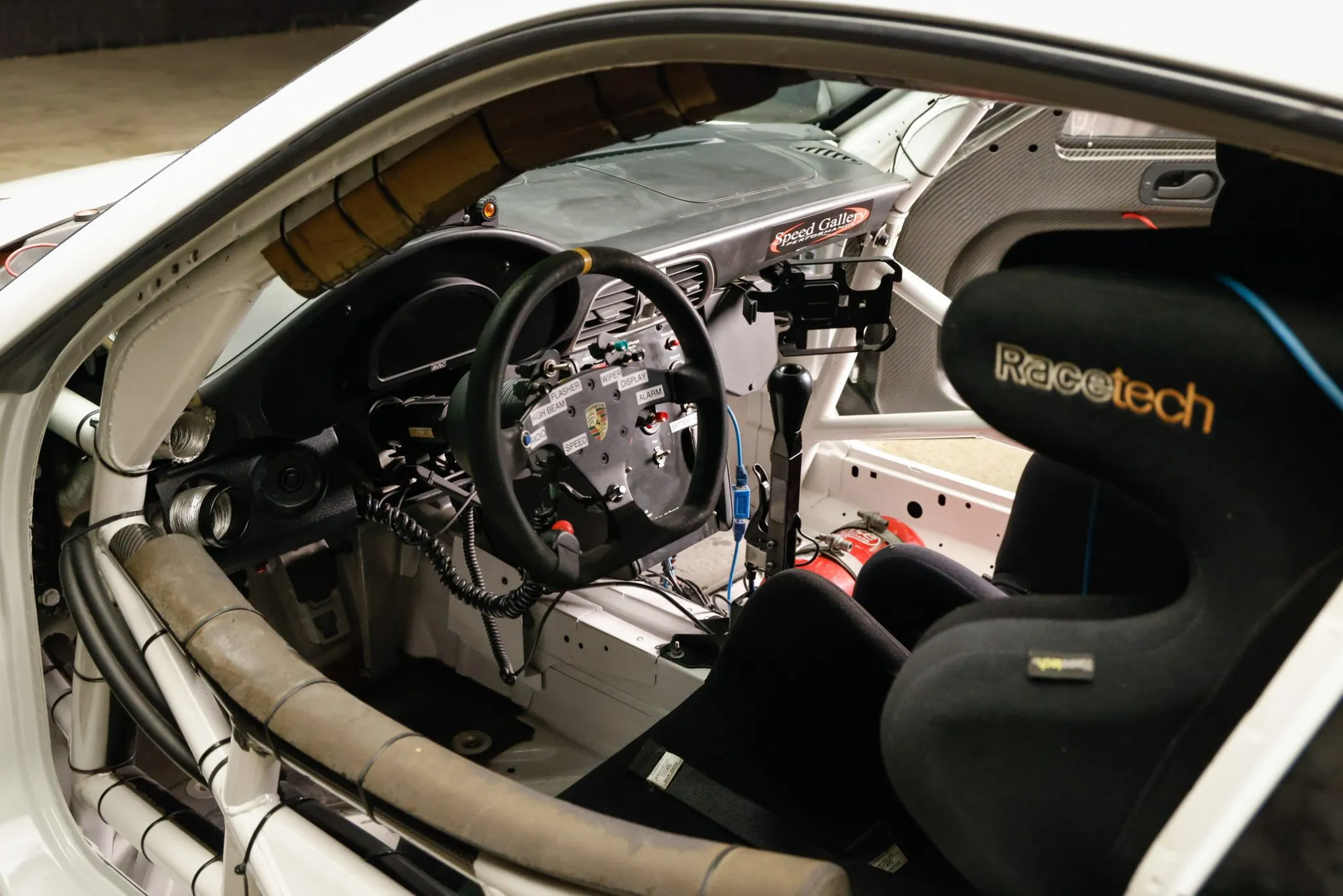 The stripped cabin houses a Racetech 119-series bucket seat for the driver along with a MOMO Daytona unit for the passenger paired with Sparco and Safecraft six-point harnesses, respectively. The carbon-fiber-reinforced plastic (CFRP) door panels are outfitted with red door pulls, and additional racing equipment includes a roll cage with door bars as well as a SPA Technique fire suppression system.