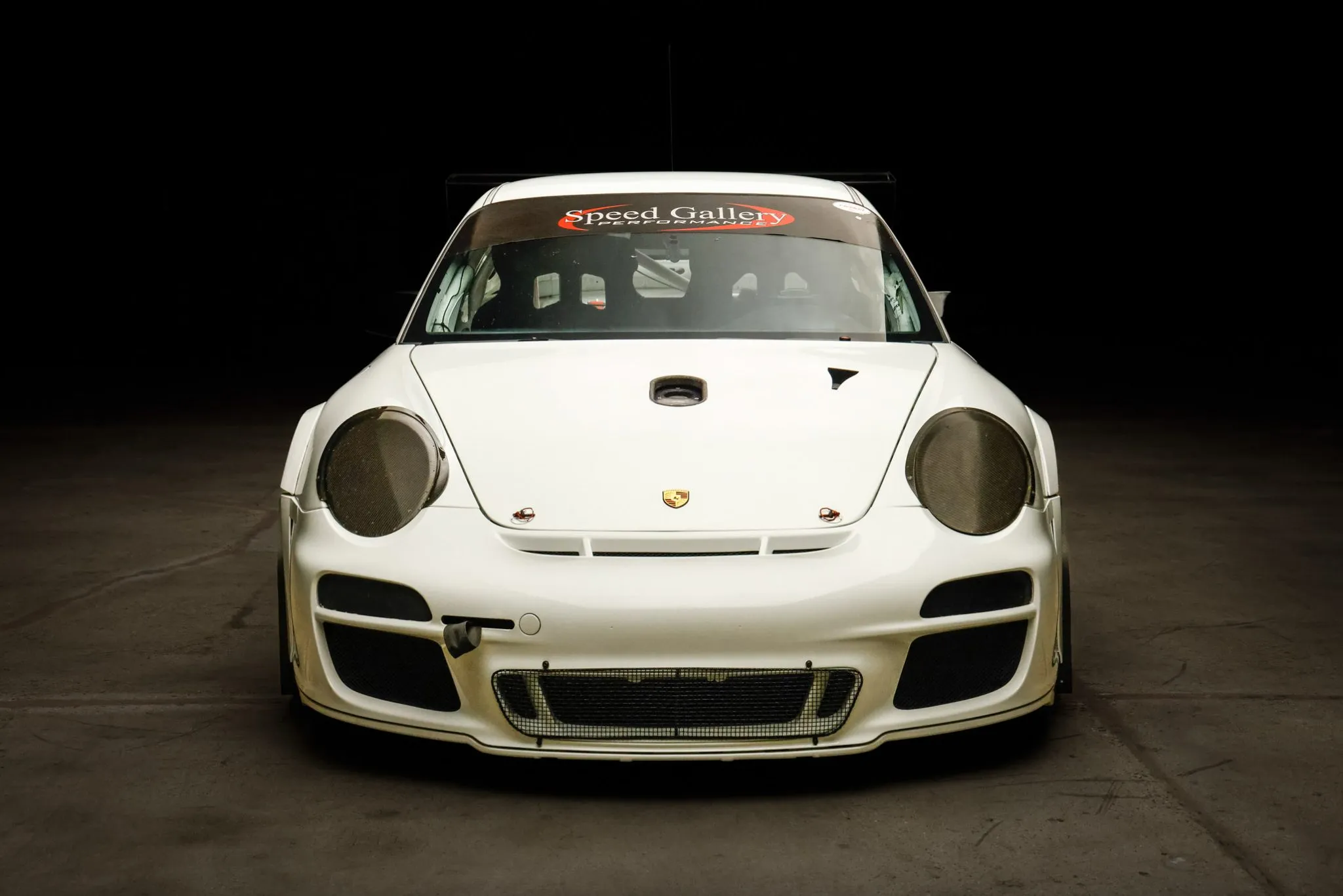 Carbon-fiber guards have been fitted over the headlamp openings, and a grille protects the central air inlet. Further details include trunk and hood pins, front and rear tow straps, and vented rear quarter windows.