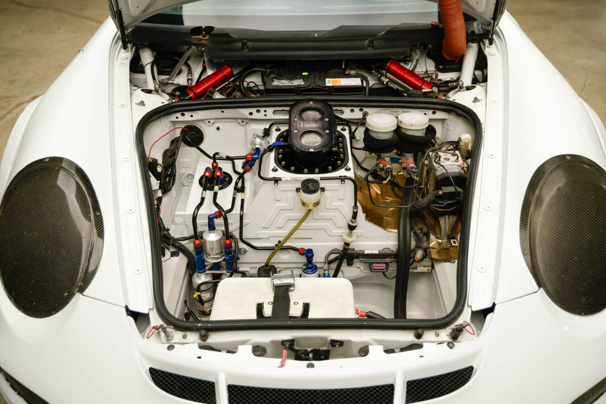 The car is equipped with a fuel cell and quick-fuel setup from Premier Fuel System featuring dual valves that are accessible through the hood. The cooler for the Coolshirt system is installed in the front trunk.