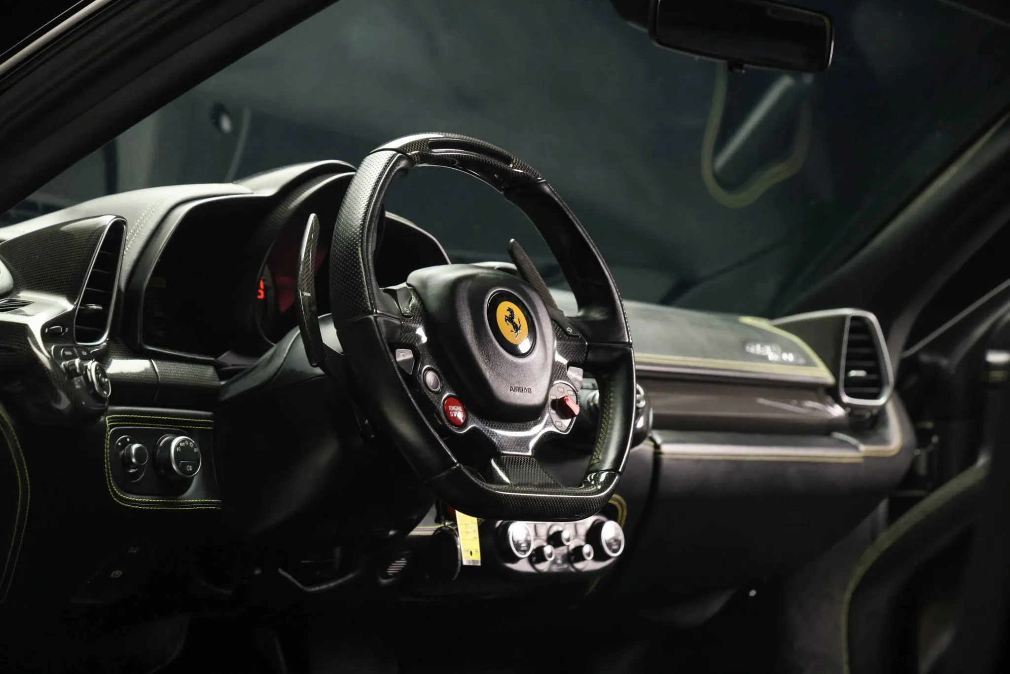 The carbon-fiber- and leather-trimmed steering wheel fronts column-mounted carbon-fiber shift paddles and features LED shift indicator lights as well as a red engine-start button and an adjustable manettino that toggles among several traction control and vehicle settings. Instrumentation consists of a central tachometer with a 9k-rpm redline flanked by two configurable displays. The digital odometer indicates 25k miles.