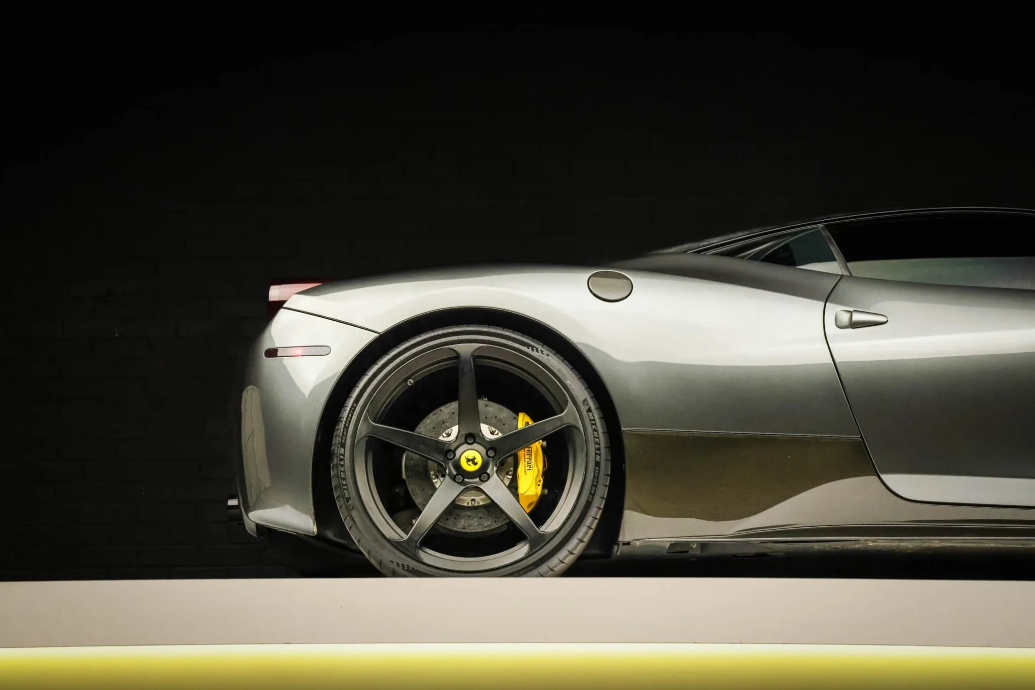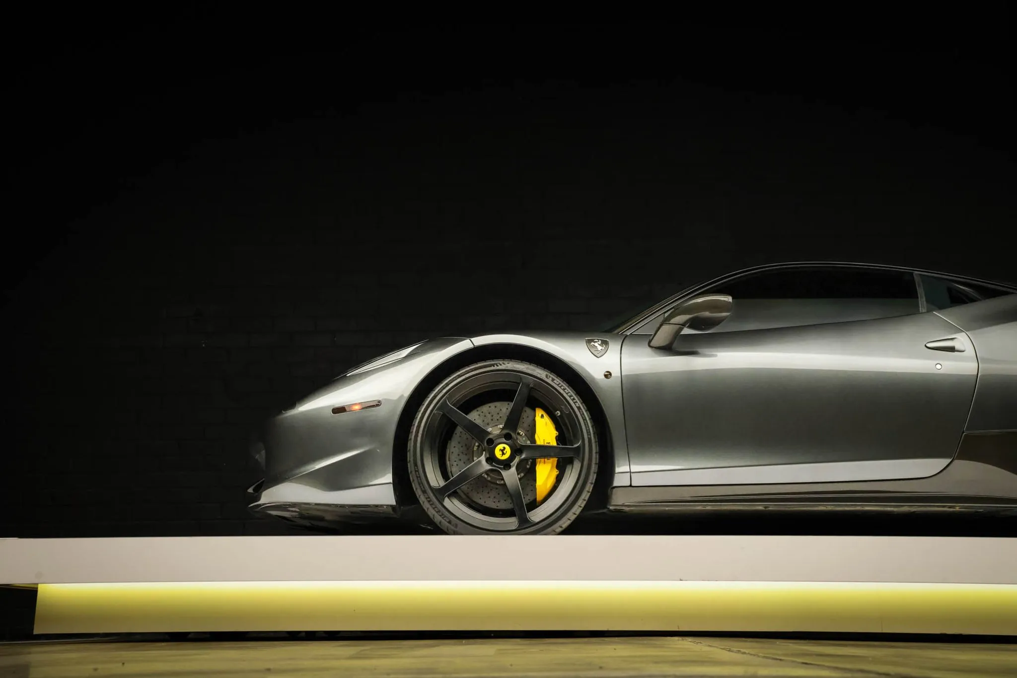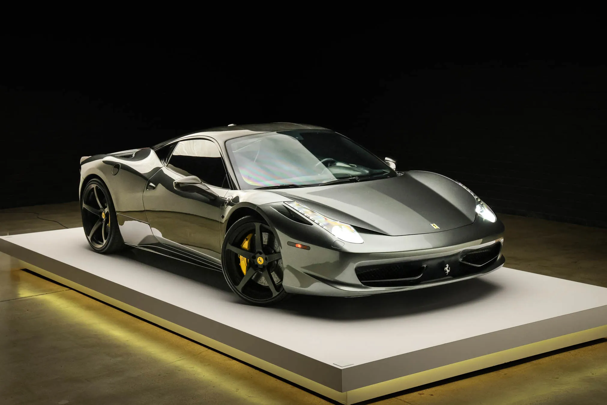 This 2013 Ferrari 458 Italia has 25k miles following registration history in New Jersey and California, and it is powered by a 4.5-liter DOHC V8 linked with a seven-speed dual-clutch automatic transaxle and an electronic differential. Finished in gray over black leather, the car is equipped with black-finished 21″ and 22″ five-spoke alloy wheels, xenon headlights, carbon-fiber exterior and interior accents, a yellow intake plenum, carbon-ceramic brakes, a JBL sound system, power-adjustable seats, a carbon-fiber roof, navigation, carbon-fiber racing seats, and dual-zone automatic climate control. This 458 Italia was purchased by the owner in 2025 and is now offered on dealer consignment by the selling dealer, a Local Partner, with spare parts, a Carfax report, and a clean California title.