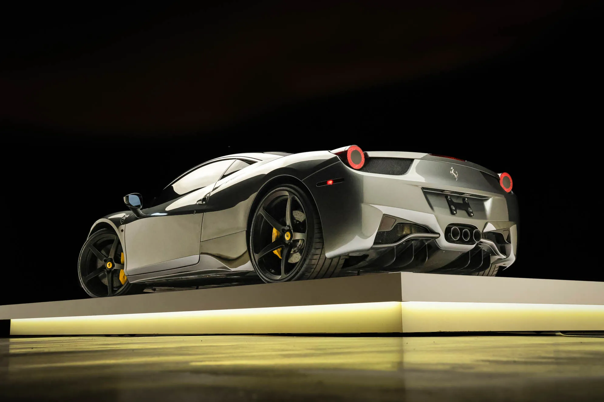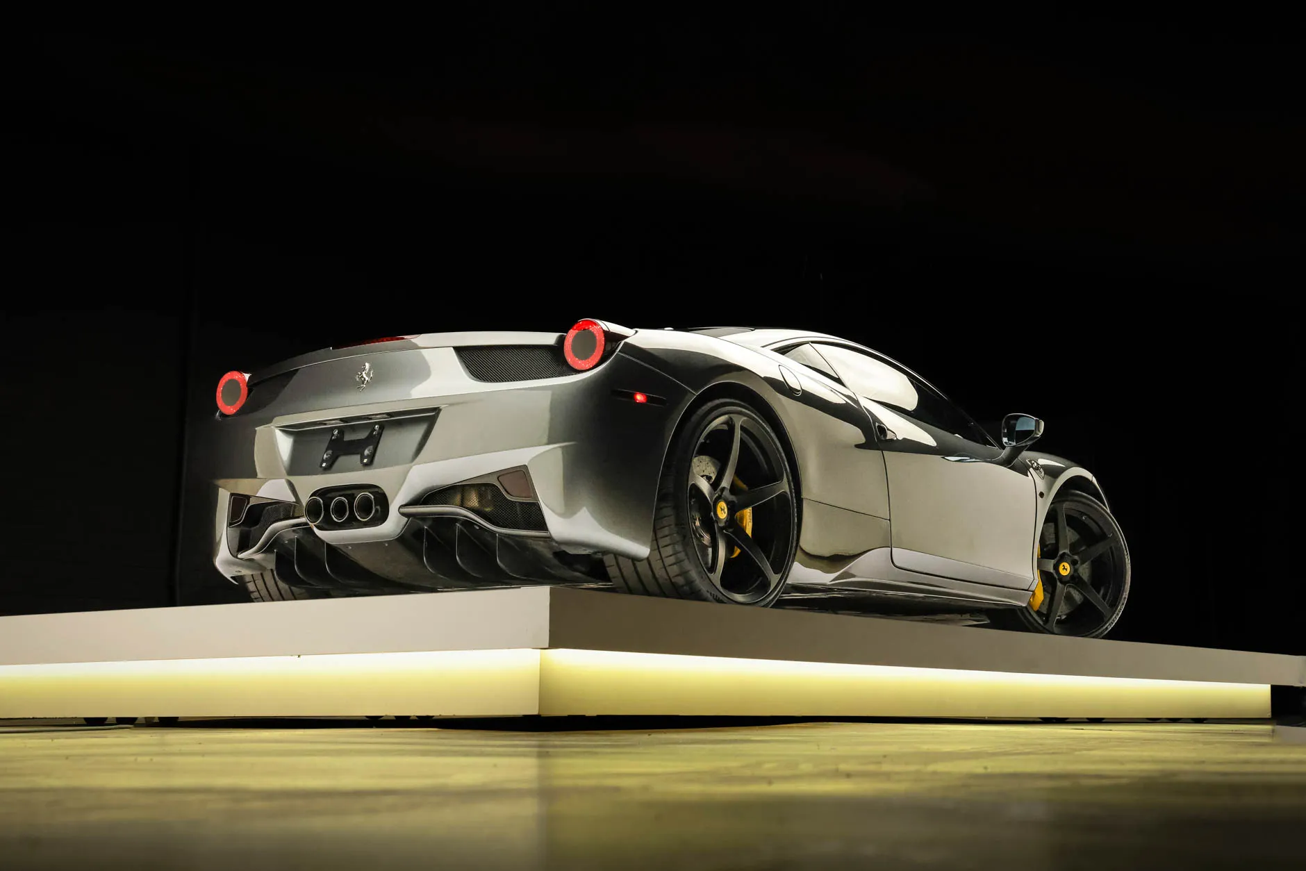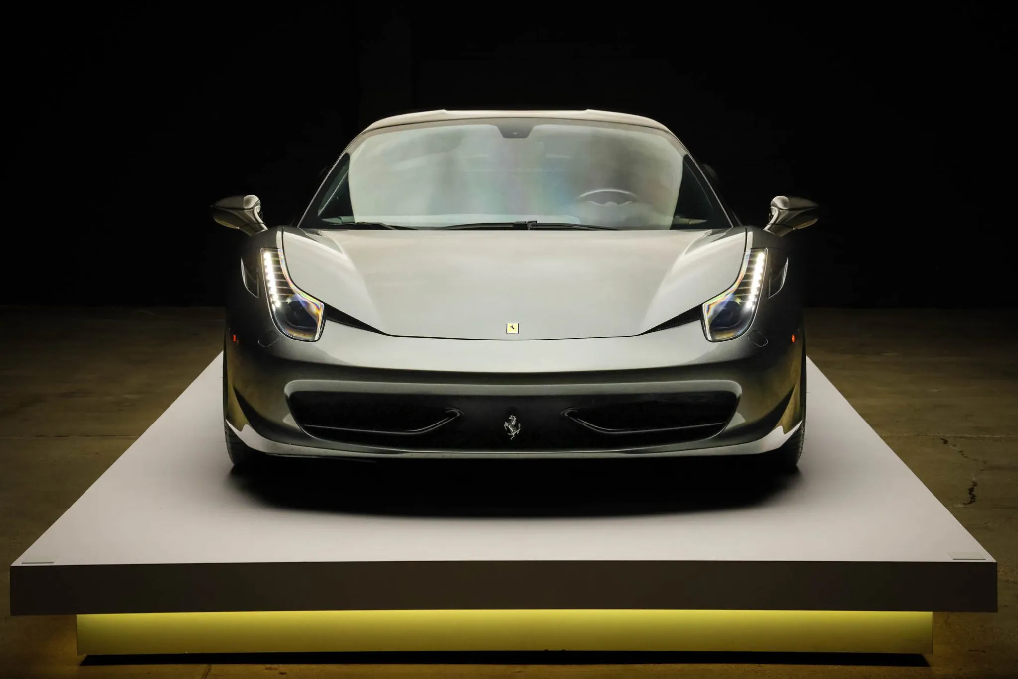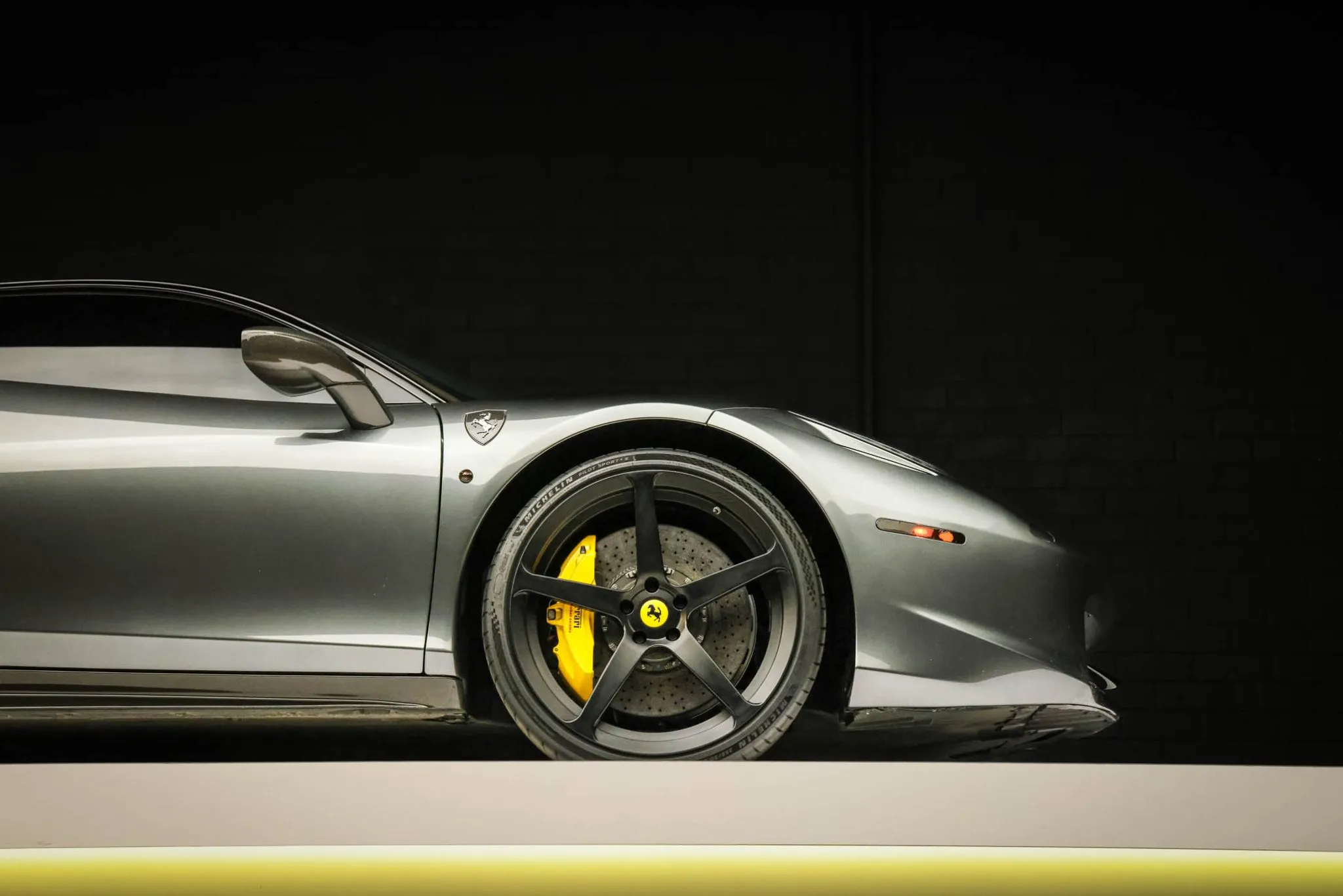This 2013 Ferrari 458 Italia has 25k miles following registration history in New Jersey and California, and it is powered by a 4.5-liter DOHC V8 linked with a seven-speed dual-clutch automatic transaxle and an electronic differential. Finished in gray over black leather, the car is equipped with black-finished 21″ and 22″ five-spoke alloy wheels, xenon headlights, carbon-fiber exterior and interior accents, a yellow intake plenum, carbon-ceramic brakes, a JBL sound system, power-adjustable seats, a carbon-fiber roof, navigation, carbon-fiber racing seats, and dual-zone automatic climate control. This 458 Italia was purchased by the owner in 2025 and is now offered on dealer consignment by the selling dealer, a Local Partner, with spare parts, a Carfax report, and a clean California title.