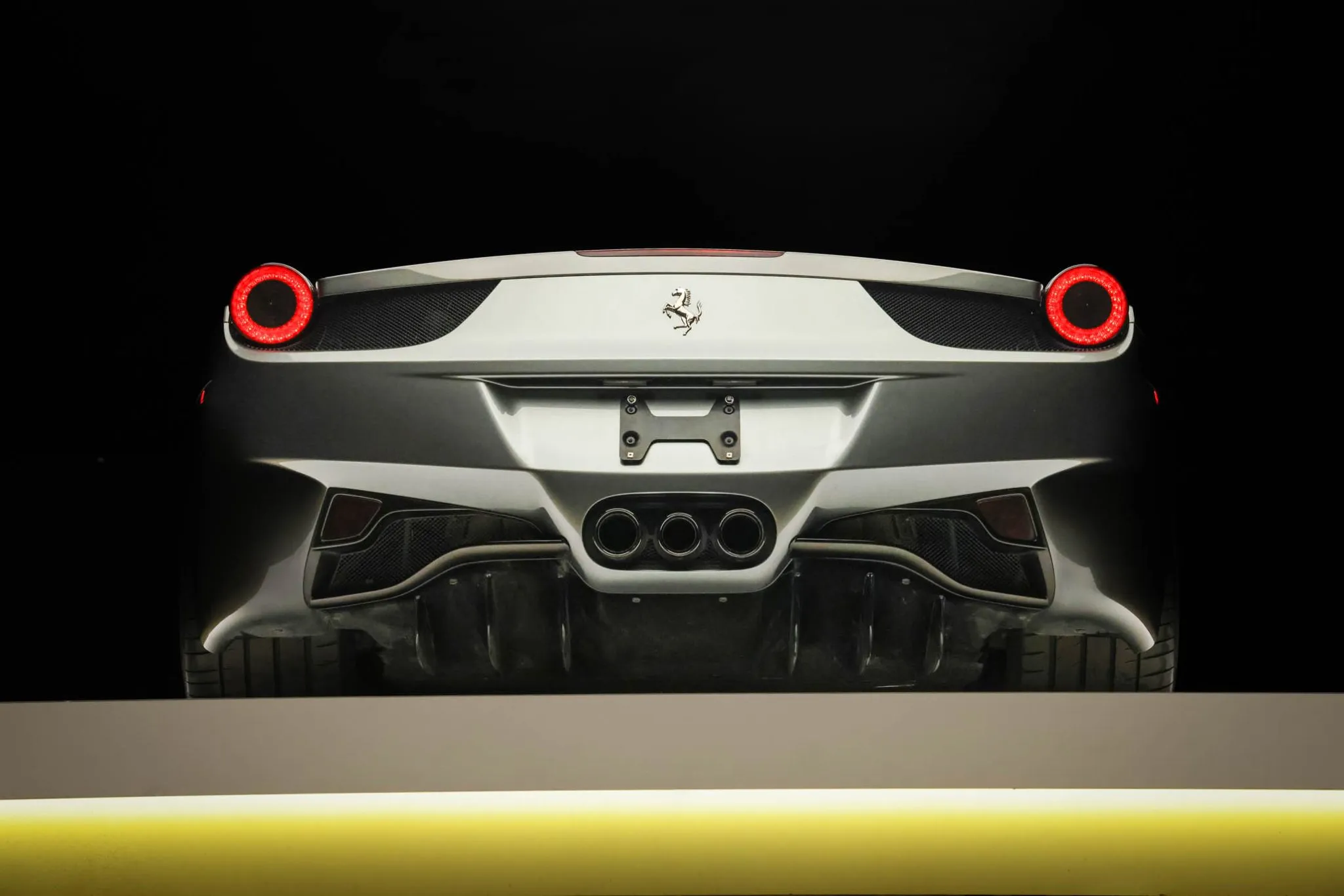 The mid-mounted 4.5-liter F136F V8 features a flat-plane crankshaft as well as dry-sump lubrication and a yellow-finished intake plenum, and it was factory rated at 562 horsepower and 398 lb-ft of torque. The car passed an emissions inspection in April 2025.