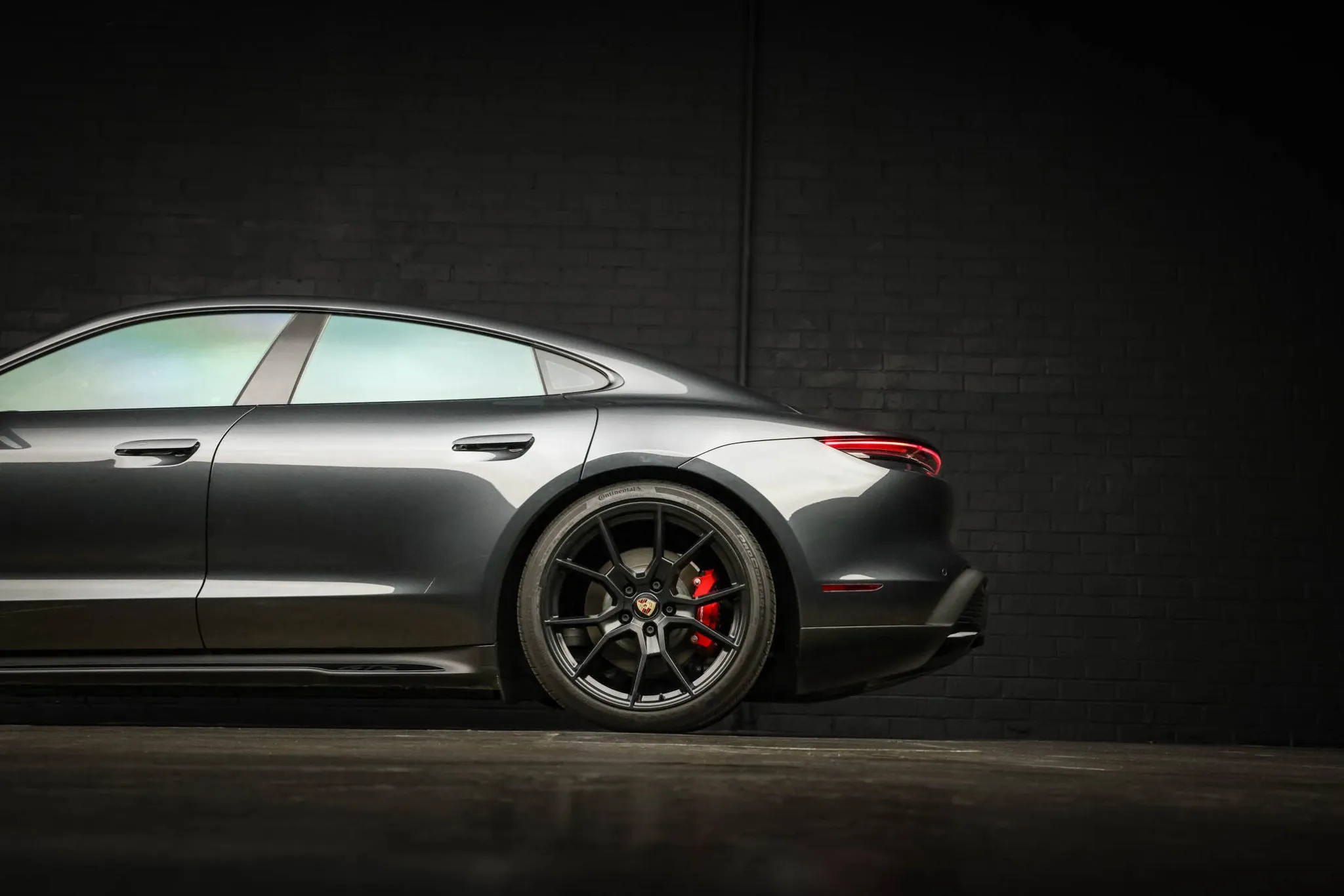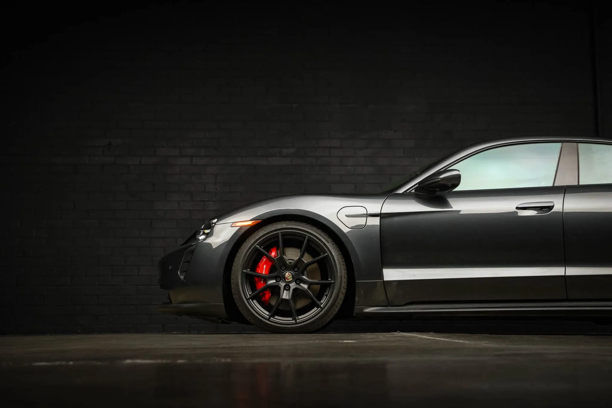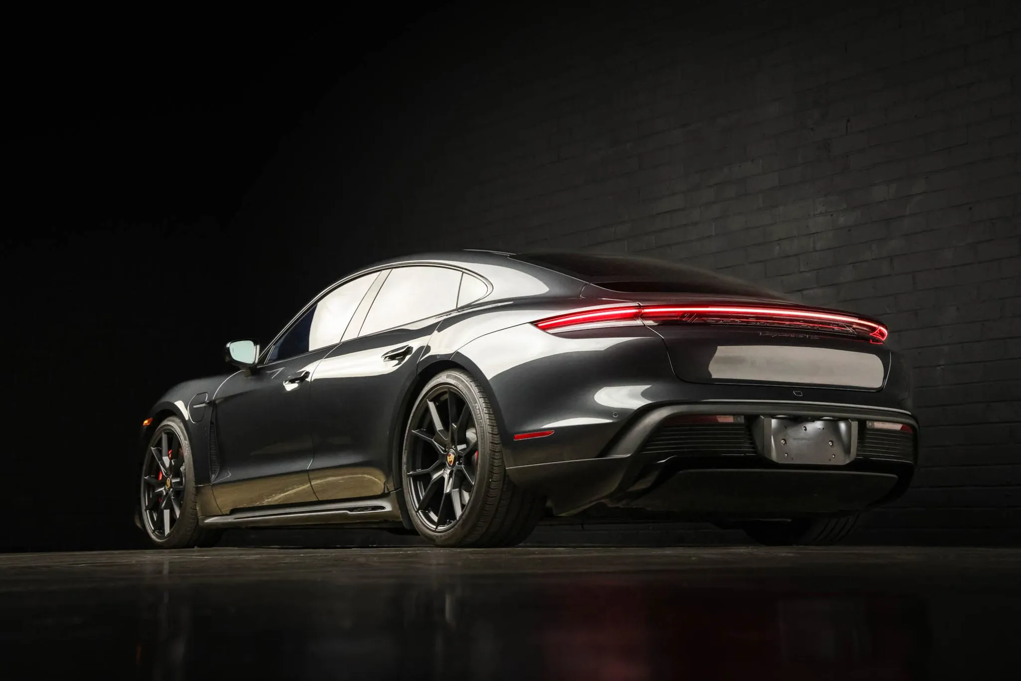 Black-finished 21″ RS Spyder Design wheels are mounted with Continental tires. The car is equipped with Porsche Active Suspension Management (PASM), and the regenerative braking system features red calipers over ventilated rotors at all four corners.