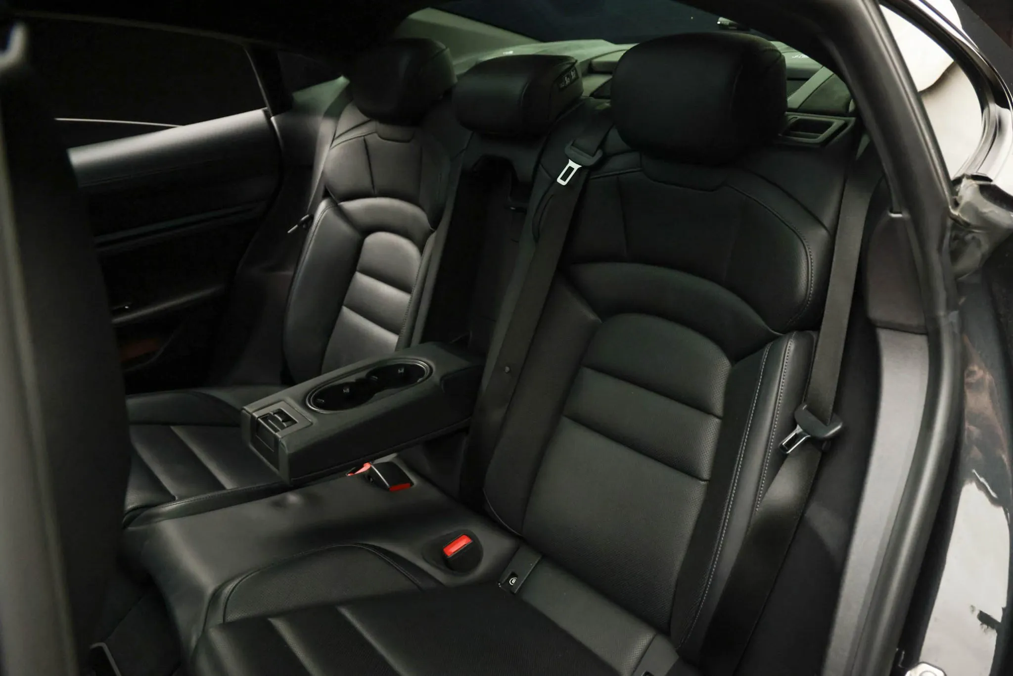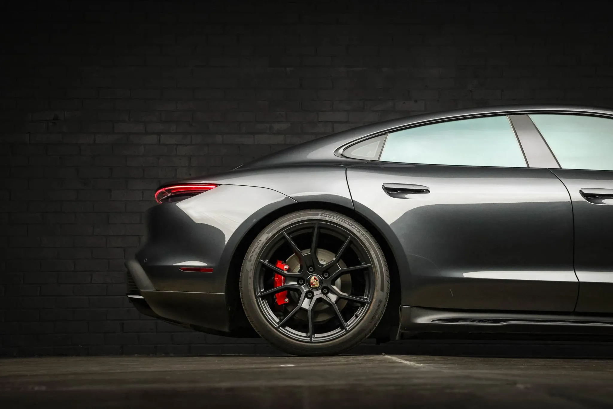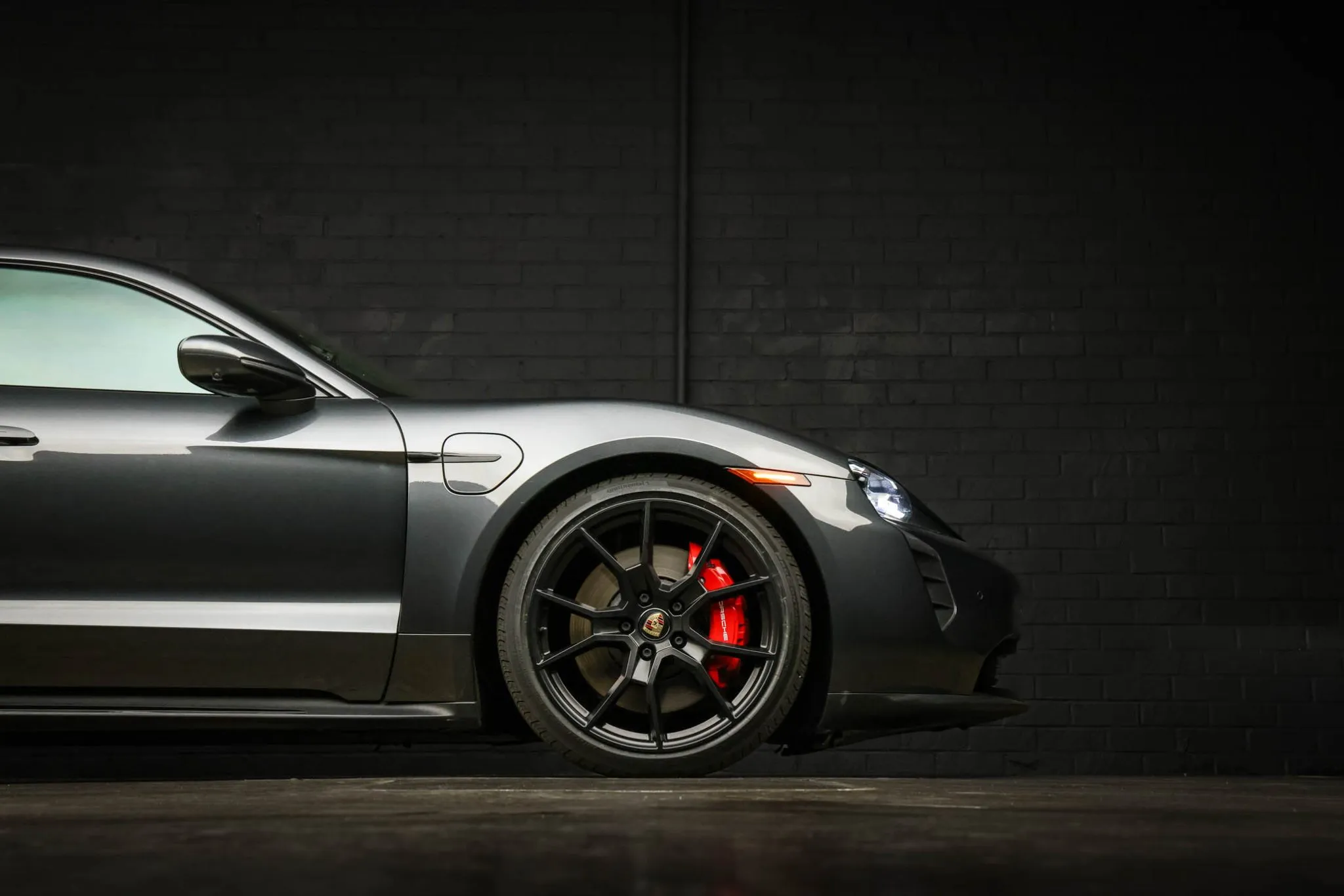 Black-finished 21″ RS Spyder Design wheels are mounted with Continental tires. The car is equipped with Porsche Active Suspension Management (PASM), and the regenerative braking system features red calipers over ventilated rotors at all four corners.