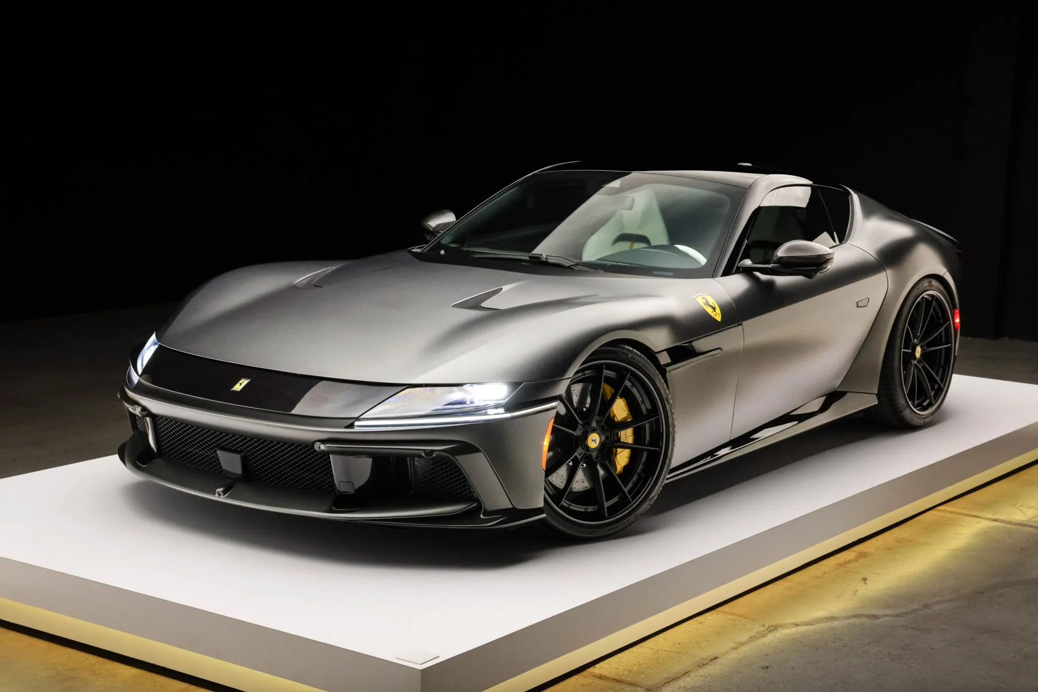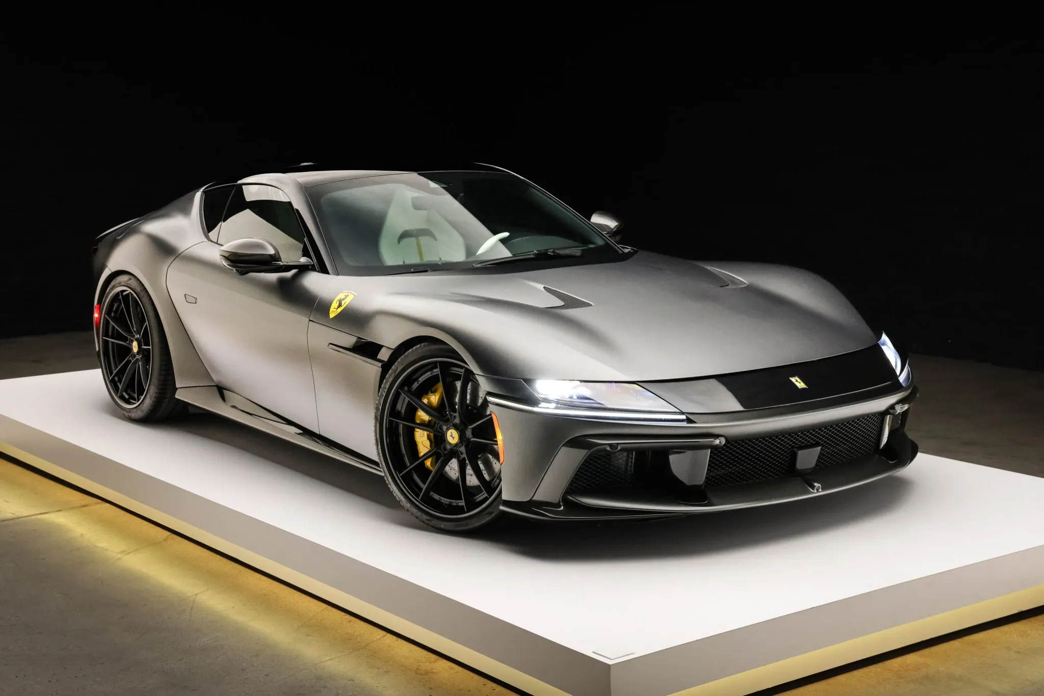 This 2025 Ferrari 12Cilindri was specified from the factory in Matte Grigio Silverstone over Bianca leather with Giallo and Nero accents and now has 792 miles. The car features airbrushed Scuderia Ferrari fender shields and a panoramic roof panel along with a carbon-fiber front spoiler, rear diffuser, and mirror caps. It rides on 21″ front and 22″ rear MVForged centerlock wheels coupled with yellow Brembo brake calipers over carbon-ceramic rotors at all four corners. Inside, the ventilated and massaging Goldrake seats are accompanied by a carbon-fiber steering wheel, three display screens, and a Burmester 15-speaker audio system. Power is supplied by a 6.5-liter F140 V12 linked with an eight-speed dual-clutch automatic transaxle and an E-Diff limited-slip differential. Further equipment includes a magnetorheological suspension, four-wheel steering, a front-axle lift system, adaptive cruise control, a Surround View camera system, and front and rear radar. Acquired by the selling dealer in 2026, this 12Cilindri is now offered with a clean Carfax report and a California title.