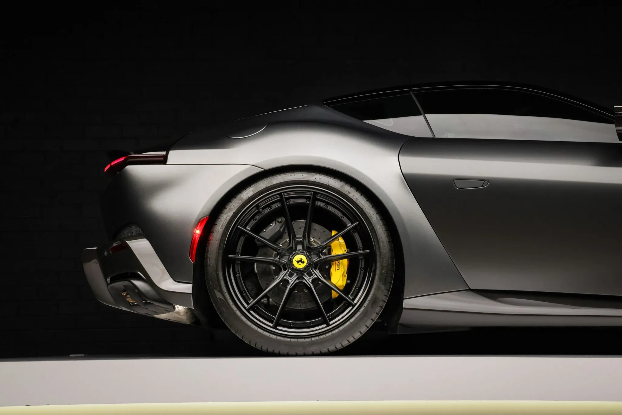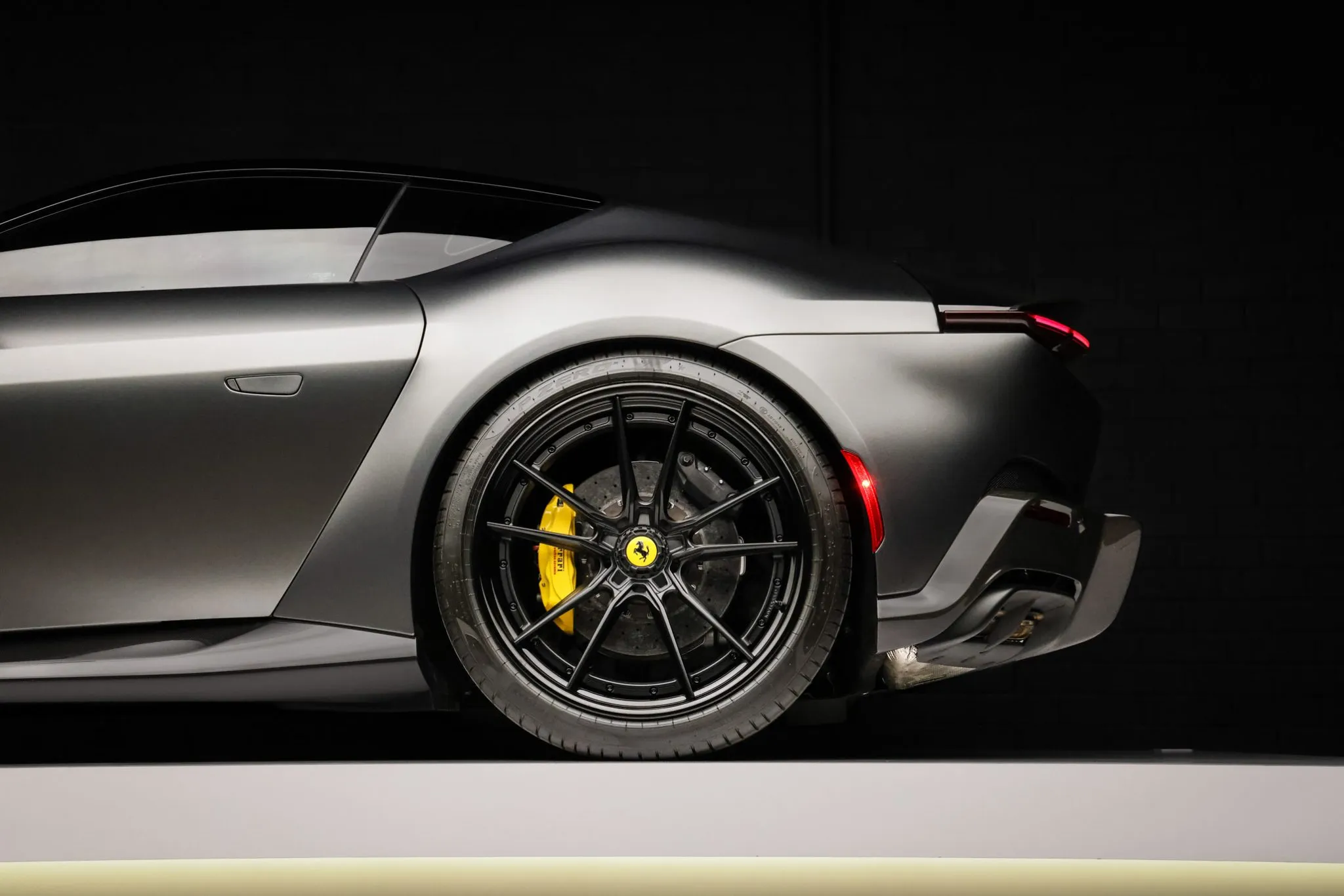 The chassis is constructed with extruded and cast aluminum and features a wheelbase that is 20mm shorter and 15% stiffer when compared with the 812. The car is equipped with Virtual Short Wheelbase four-wheel-steering and Side Slip Control (SSC) systems as well as a magnetorheological suspension and an optional front-axle suspension lift system. Stopping power is provided via a brake-by-wire ABS Evo system, which incorporates Brembo yellow-painted calipers over carbon-ceramic rotors.