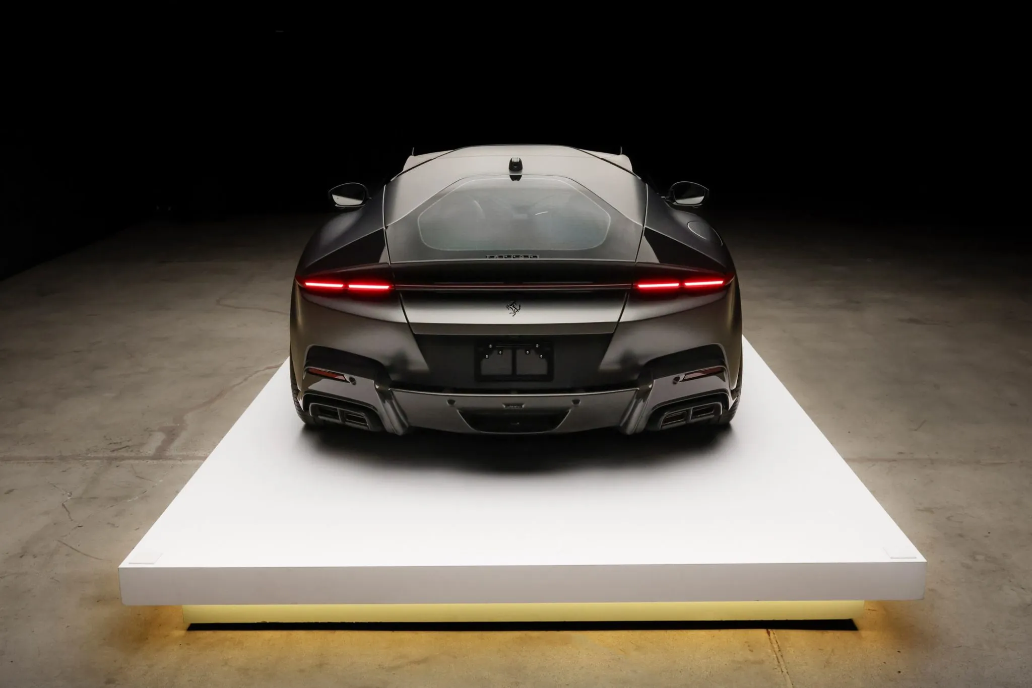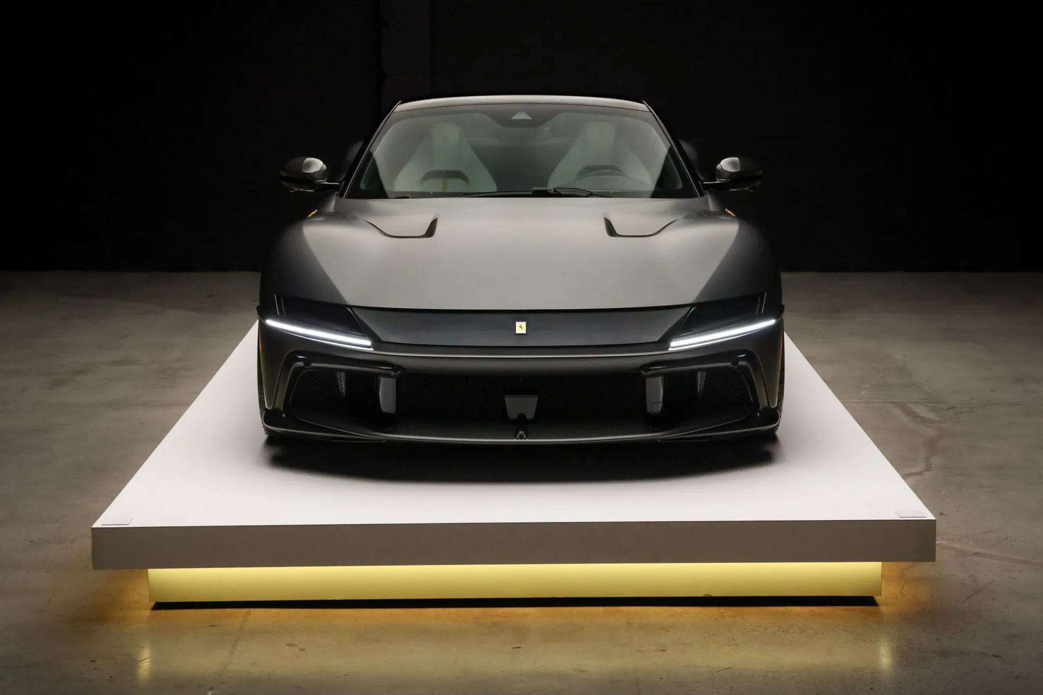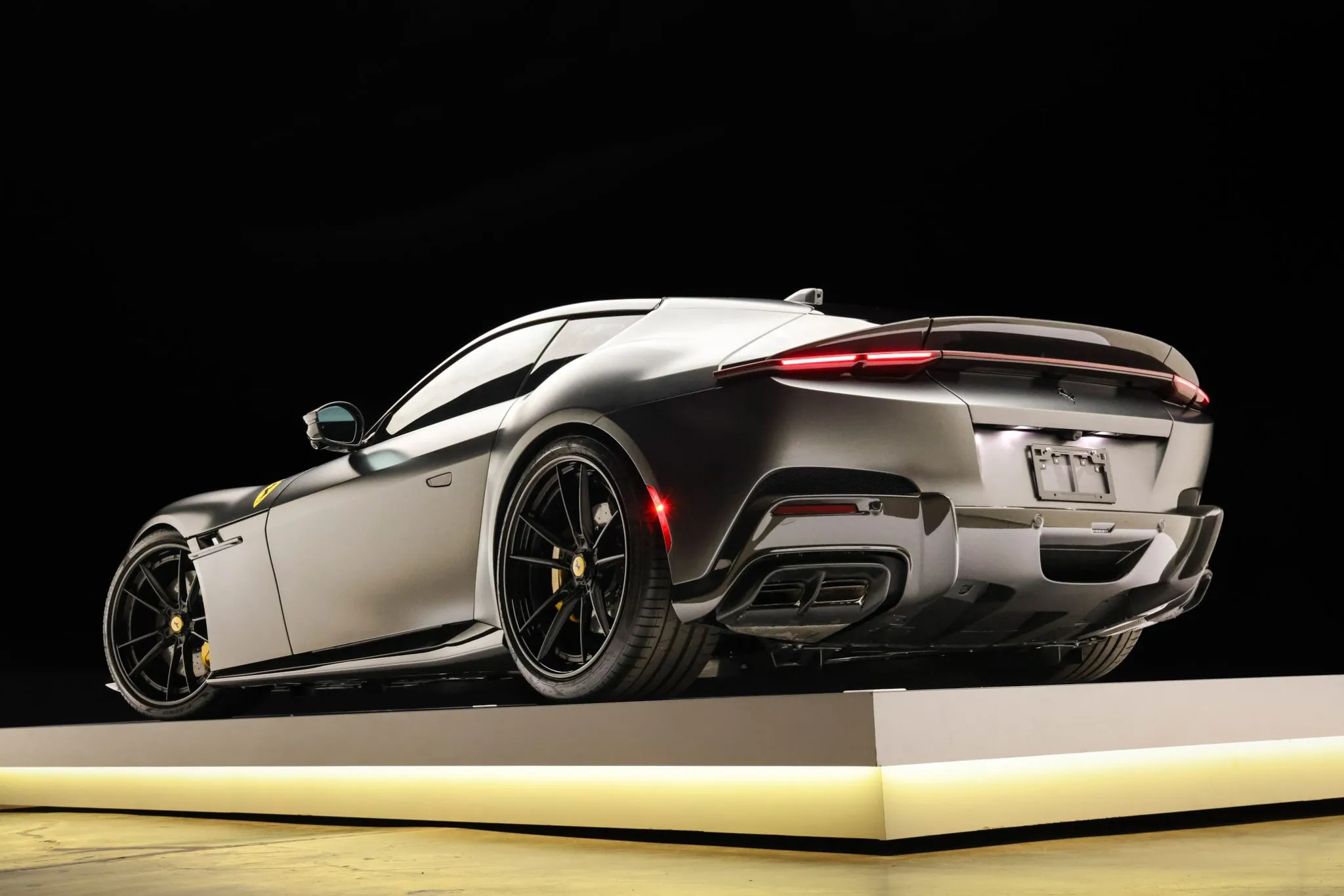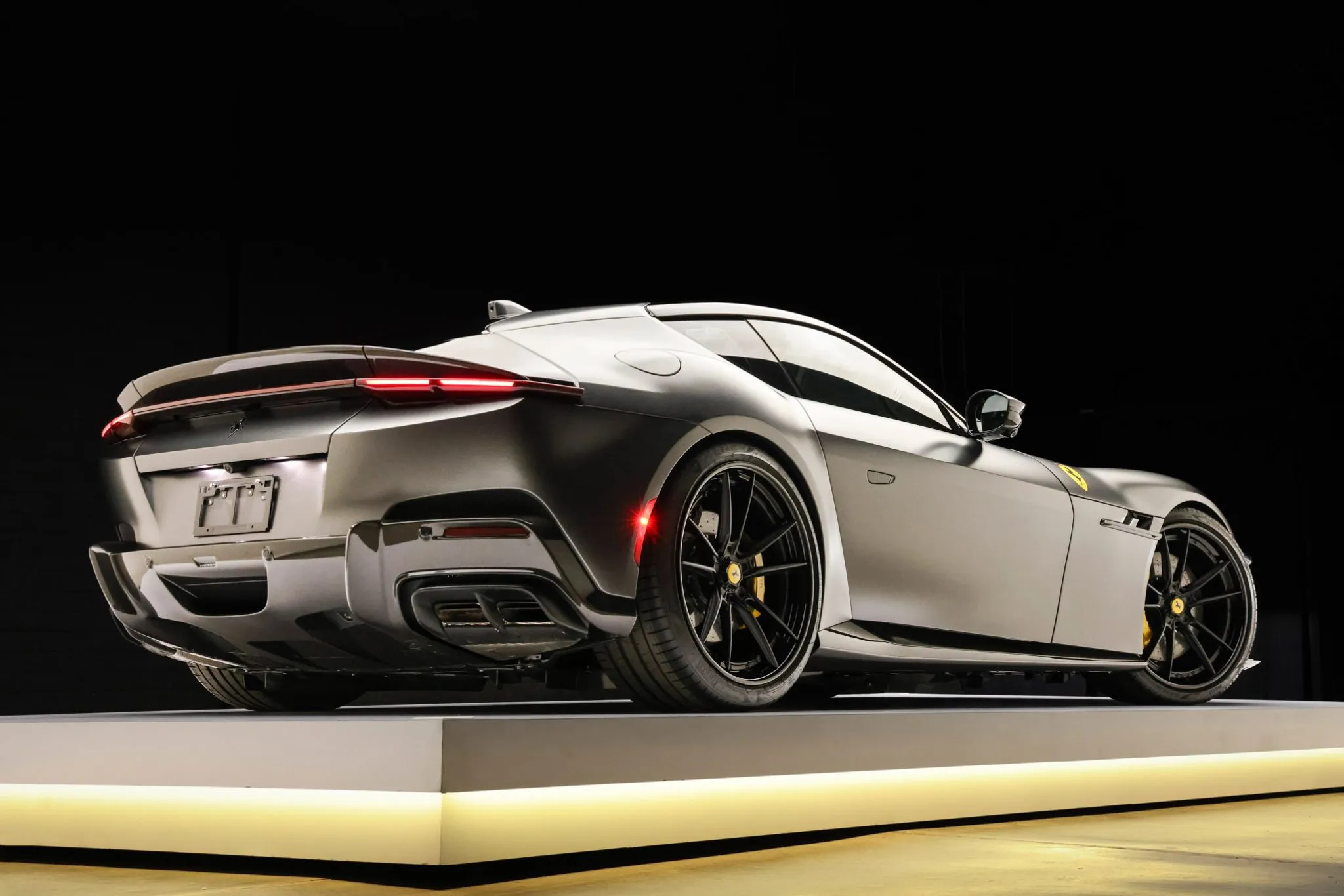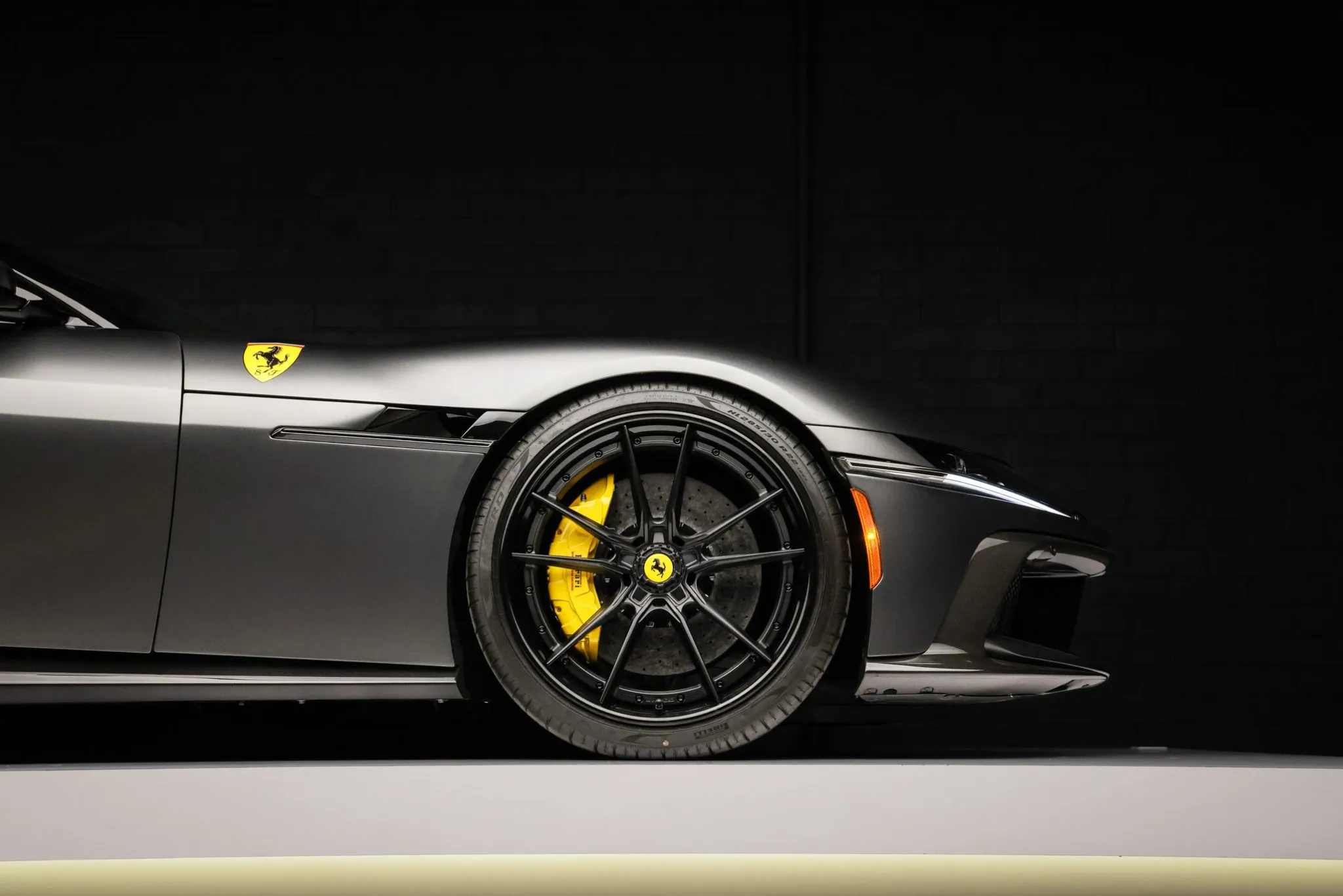 This example is finished in Matte Grigio Silverstone with Nero accents and was optioned with a carbon-fiber front spoiler, rear diffuser, and mirror caps as well as a panoramic roof and airbrushed Scuderia Ferrari fender shields. It was further specified with black tailpipe tips, front and rear radar, and a Surround View camera system.